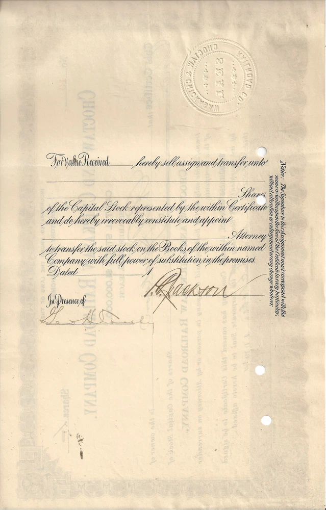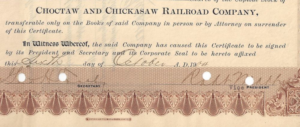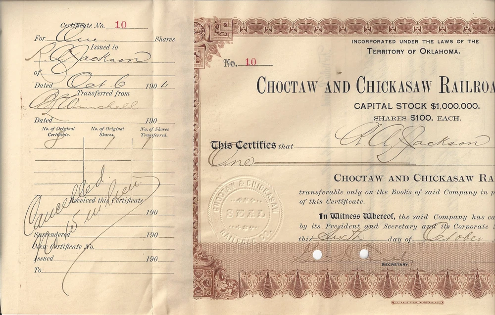 Choctaw & Chickasaw Railroad Company Inc. Territory of Oklahoma Ran 28 miles Controlled by Chicago, Rock Island & Chicago RR Capital Stock Certificate for 1 share, #10 , Dated 1904 In EARTH color Stub attached Read information image. ** NOTEWORTHY ** PRINTER: Weatern Bank Note Co, Chicago Information image copies are included with certificate Images: POSTAGE U.S. Sent First Class with tracking, starting @ $6.00 US Canada Sent First Class Canada with no tracking, starting @ $6.00 US NON U.S, case by case, starting @ $8.00 US, sent First Class. I do ship world wide. -- All the certificates and all other items I sell are sold as collectibles only; although they are authentic, they no longer hold financial value. I do have other items up for auction. I Do Combine