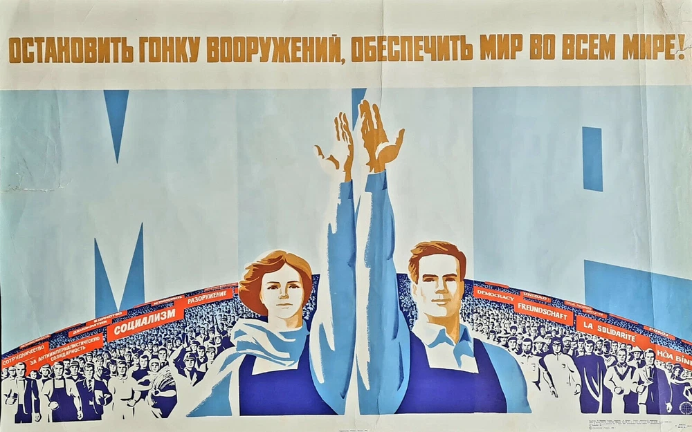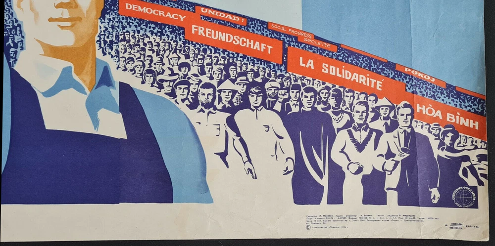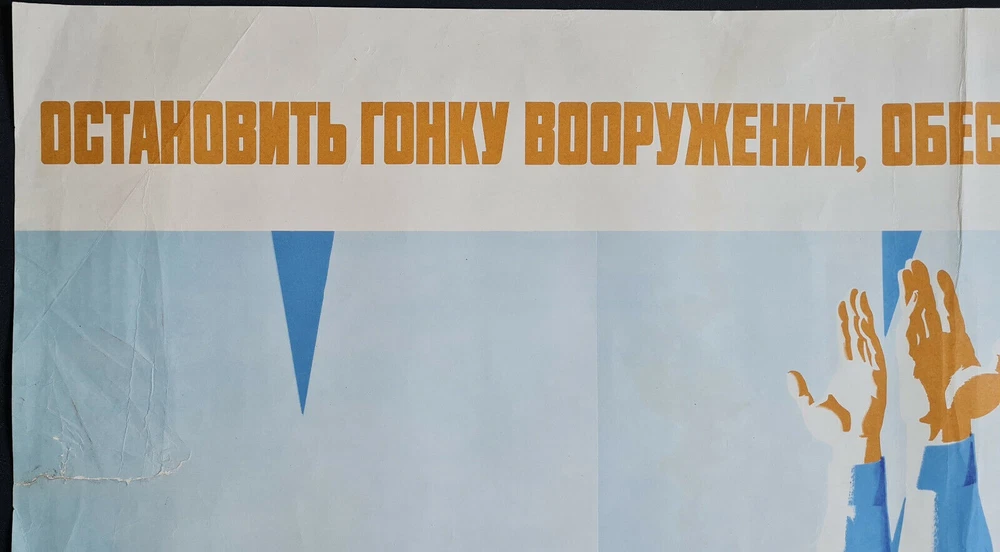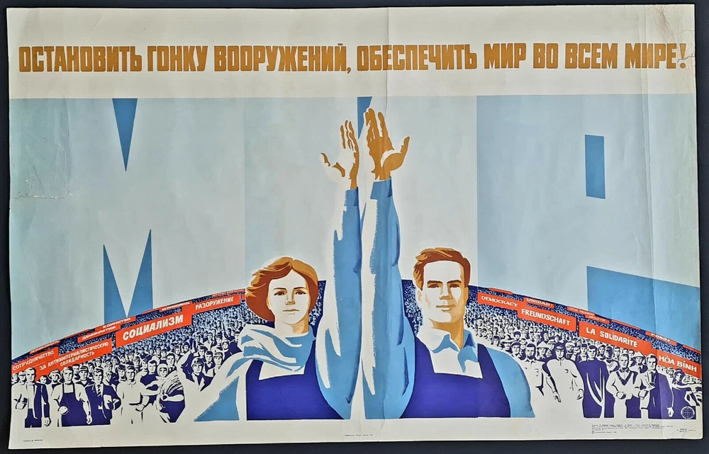 Original slogan on the poster says: ОСТАНОВИТЬ ГОНКУ ВООРУЖЕНИЙ, ОБЕСПЕЧИТЬ МИР ВО ВСЕМ МИРЕ! Literally English translation: STOP WEAPON RACE, MAKE PEACE WORLDWIDE! Big background inscription: PEACE Some other slogans: SOCIALISM FOR ANTI-IMPERIALIST SOLIDARITY DISARMAMENT COOPERATION DEMOCRACY POSTER ARTIST: FILATOV D.. PRINT YEAR: 1976 SUBJECT: INTERNATIONALISM, PEACE, ANTI WAR LANGUAGE: RUSSIAN PRINT RUN: 130.000 PUBLISHED BY: "PLAKAT", MOSCOW SIZE: IN: 26 ⅜ x 41 ¾ = CM: 67 x 106 CONDITION: ROLLED, FROM FAIR TO GOOD The poster is from fair to good condition. B efore your bid please consider the poster condition from attached pictures and text description, if you still need more information please feel free to require additional pictures or video, I would be my pleasure to assist you with any questions regarding this auction. Shipping rolled in a hard plastic tube. www.facebook.com/sovietartposters Listing and template services provided by inkFrog