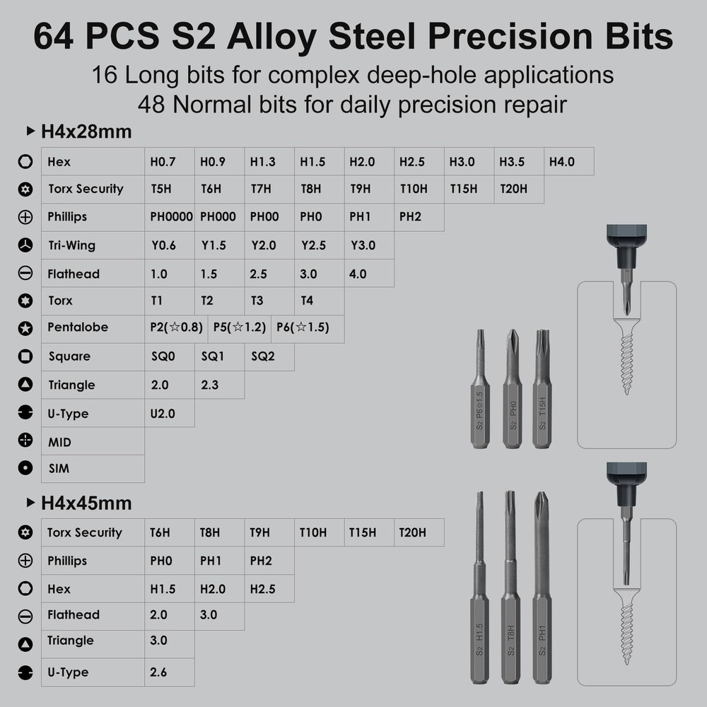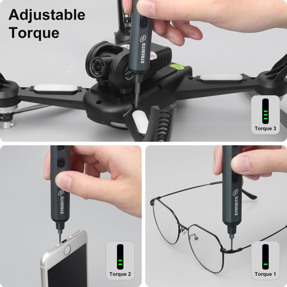 STREBITO Mini Electric Screwdriver Set, 70 in 1 Small Electric Screwdriver Cordless - 64 S2 Preicison Bits, 5 Torque Settings, 4 LED Lights, Mini Power Screwdriver Repair Tool Kit for PC RC Electronic 【5 Torque Settings】The STREBITO electric precision screwdriver features 5 gear torques ranging from 0.15-0.35N.m, allowing you to adjust the torque precisely to meet various needs. The manual torque of 7N.m gives you increased control for manual screwdriving. With easy torque adjustment and stable torque output, this precision electric screwdriver can satisfy all your demands, includes PC, Computer, Laptop, Cell Phone, Macbook, RC Car, Drone, Keyboard, PS4, PS5, and other electronic devices 【More Powerful】This cordless mini electric screwdriver is powered by a 350mAh rechargeable Lithium Battery, which can last for tightening over 500 Screws. It quickly charges in just 1 hour, and the universal Type-C charging interface makes charging the electric screwdriver convenient. Equipped with a powerful motor providing a higher load carrying capacity at a no-load speed of 200 RPM, this electric mini screwdriver offers efficient fastening performance to save you time and effort 【Humanized Design】 Our electric screwdriver rechargeable is ergonomically designed in a pen shape, making it lightweight, balanced, and comfortable for continuous use. It easily switches between driving and removing screws with a convenient forward/reverse switch. The built-in 4 LED lights can illuminate corners with insufficient light, making it great for building PCs and assembling small tech devices. Equipped with an indicator light, it is easy to adjust torque and check the battery level 【Wide Application】Equipped 64 precision bits - Phillips, Torx, Flat Head, Triwing, Hex, Pentalobe, Triangle, etc, This electric screwdriver kit has everything the professional needs. It features 16 long bits for complex deep-hole applications. The integrated magnetizer provides immediate magnetization for screwdriver tips, while the Magnetic Mat is great for keeping track of tiny screws. The Metal Spudger helps pry and poke, and the tweezers are ideal for working with micro electronics 【Lifetime Warranty】Comes with a magnetic case to keep each part orderly in place. This electric screw driver features one-click pop-up mechanism and compact size for convenient storage or transportation. Every driver bit is made of high-quality S2 steel with a hardness of up to 60HRC. This electric screwdriver set is covered by STREBITO's lifetime warranty and a 30-day money-back guarantee. If you encounter any issues with your cordless screwdriver, simply contact customer service for help 【5 Torque Settings】The STREBITO electric precision screwdriver features 5 gear torques ranging from 0.15-0.35N.m, allowing you to adjust the torque precisely to meet various needs. The manual torque of 7N.m gives you increased control for manual screwdriving. With easy torque adjustment and stable torque output, this precision electric screwdriver can satisfy all your demands, includes PC, Computer, Laptop, Cell Phone, Macbook, RC Car, Drone, Keyboard, PS4, PS5, and other electronic devices 【More Powerful】This cordless mini electric screwdriver is powered by a 350mAh rechargeable Lithium Battery, which can last for tightening over 500 Screws. It quickly charges in just 1 hour, and the universal Type-C charging interface makes charging the electric screwdriver convenient. Equipped with a powerful motor providing a higher load carrying capacity at a no-load speed of 200 RPM, this electric mini screwdriver offers efficient fastening performance to save you time and effort 【Humanized Design】 Our electric screwdriver rechargeable is ergonomically designed in a pen shape, making it lightweight, balanced, and comfortable for continuous use. It easily switches between driving and removing screws with a convenient forward/reverse switch. The built-in 4 LED lights can illuminate corners with insufficient light, making it great for building PCs and assembling small tech devices. Equipped with an indicator light, it is easy to adjust torque and check the battery level 【Wide Application】Equipped 64 precision bits - Phillips, Torx, Flat Head, Triwing, Hex, Pentalobe, Triangle, etc, This electric screwdriver kit has everything the professional needs. It features 16 long bits for complex deep-hole applications. The integrated magnetizer provides immediate magnetization for screwdriver tips, while the Magnetic Mat is great for keeping track of tiny screws. The Metal Spudger helps pry and poke, and the tweezers are ideal for working with micro electronics 【Lifetime Warranty】Comes with a magnetic case to keep each part orderly in place. This electric screw driver features one-click pop-up mechanism and compact size for convenient storage or transportation. Every driver bit is made of high-quality S2 steel with a hardness of up to 60HRC. This electric screwdriver set is covered by STREBITO's lifetime warranty and a 30-day money-back guarantee. If you encounter any issues with your cordless screwdriver, simply contact customer service for help Shipping from the USA All of our products are shipped from the USA, ensuring quick delivery to your destination. Payment We offer the following payment methods: PayPal, credit card, bank transfer, and eBay's secure payment system. Free Shipping & Free Returns Shipping within the USA is FREE. Additionally, any return is absolutely free for you. Risk-Free Purchase You have the option to return an item within 30 days without any justification. We cover the return shipping costs! Fast Shipping We ship immediately upon receipt of payment. Generally, the package is delivered within 2-3 days in the USA. If it takes longer, we will contact you. Quality and Costs Made in Europe, USA, China No customs fees or additional charges Total satisfaction guarantee Invoice with declared VAT available upon request in .pdf format Feed
