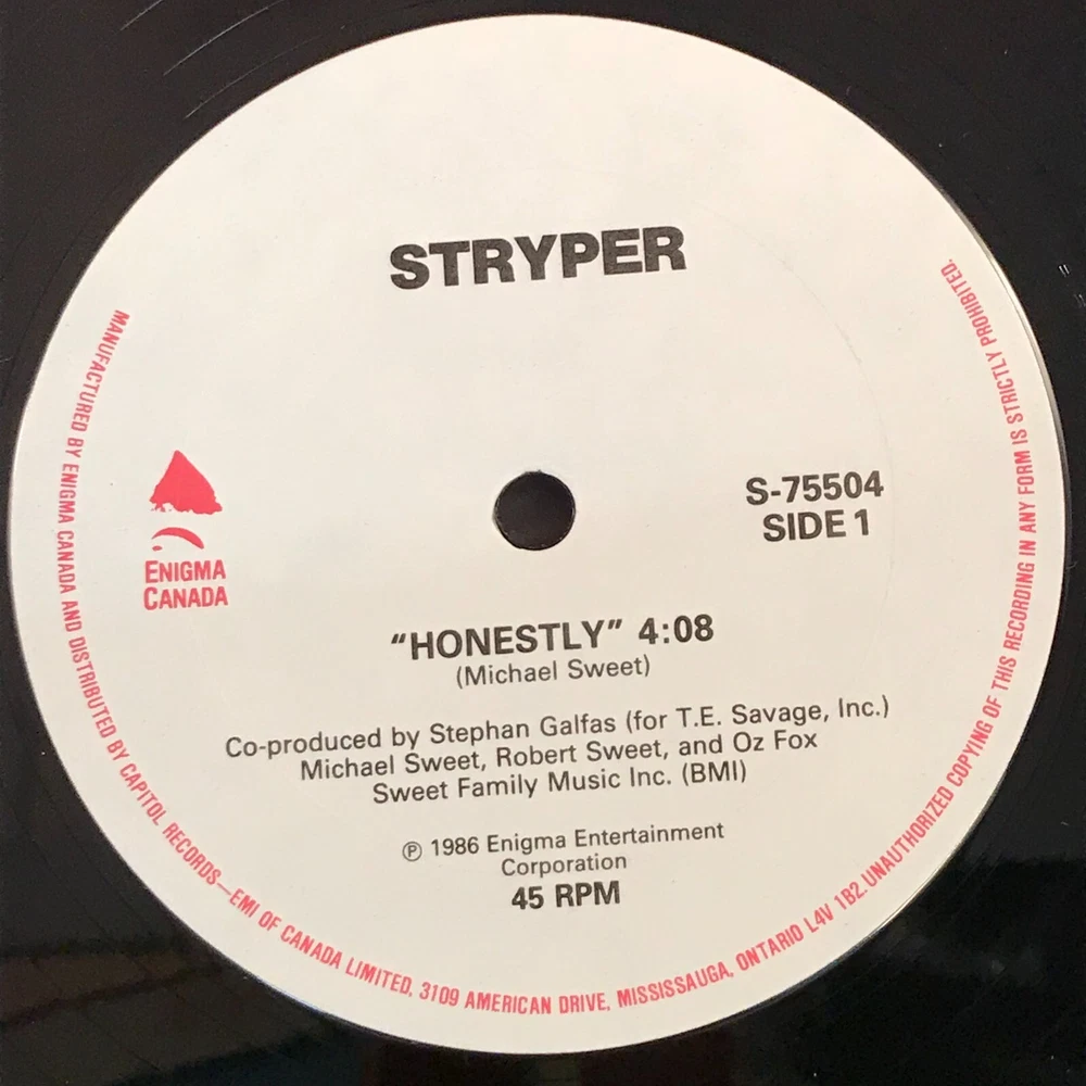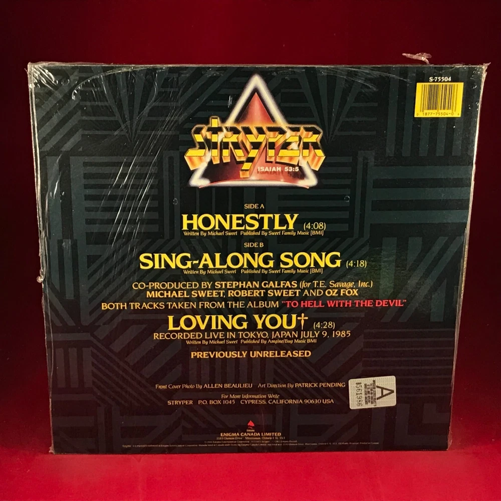 STRYPER Honestly - 1987 Canadian issue 3-track 12" Vinyl single. Enigma Canada S-75504 A Honestly 4:08 B1 Sing-Along Song 4:18 B2 Loving You (Live) 4:28 Record Condition : Excellent Sleeve : Excellent, and with the opened shrinkwrap still attached Please check out our other items !