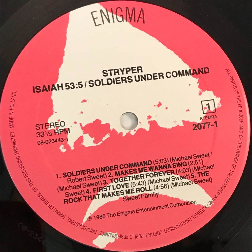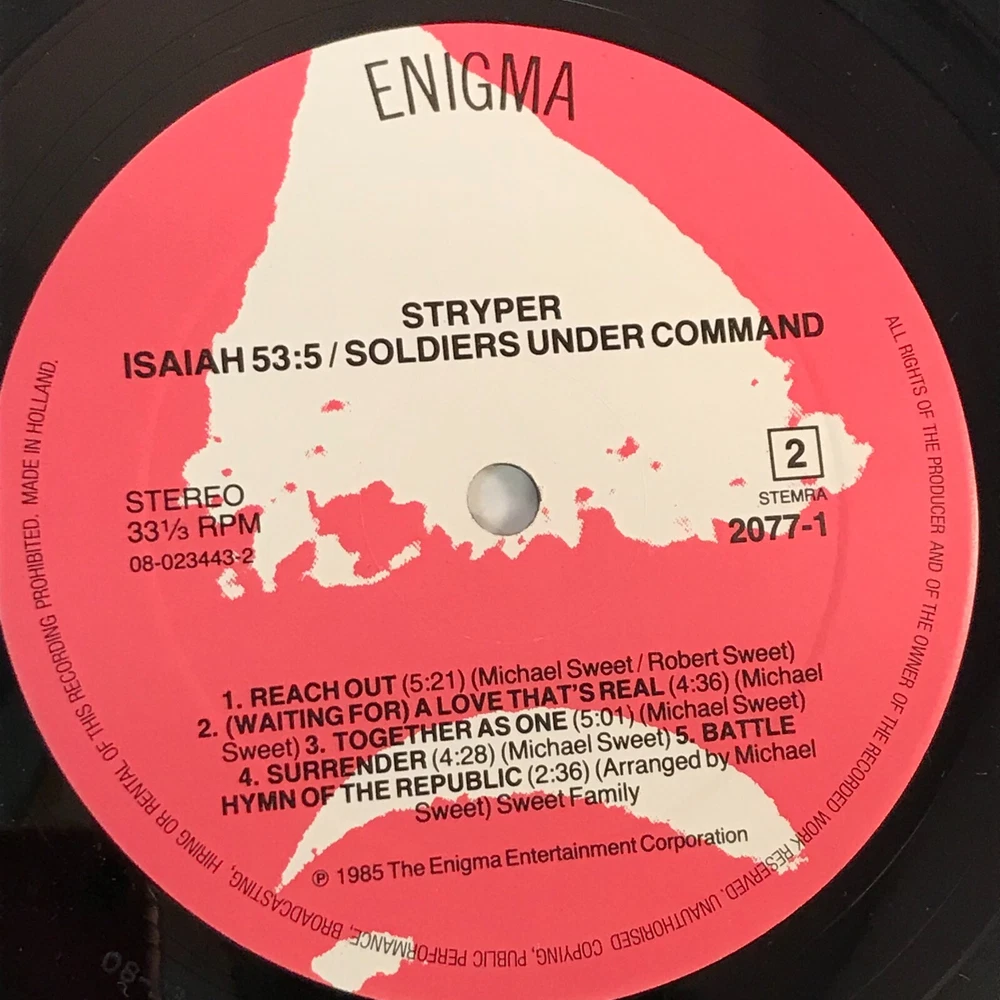 STRYPER Soldiers Under Command - 1985 Dutch manufactured vinyl LP, the second studio album from the Christian glam metal band. Enigma 2077-1 1. Soldiers Under Command 2. Makes Me Wanna Sing 3. Together Forever 4. First Love 5. The Rock That Makes Me Roll 6. Reach Out 7. (Waiting For) A Love That's Real 8. Together As One 9. Surrender 10. Battle Hymn Of The Republic (Glory, Glory Hallelujah) Record Condition : Excellent Sleeve : Minor shelfwear (see photo) Please check out our other items !