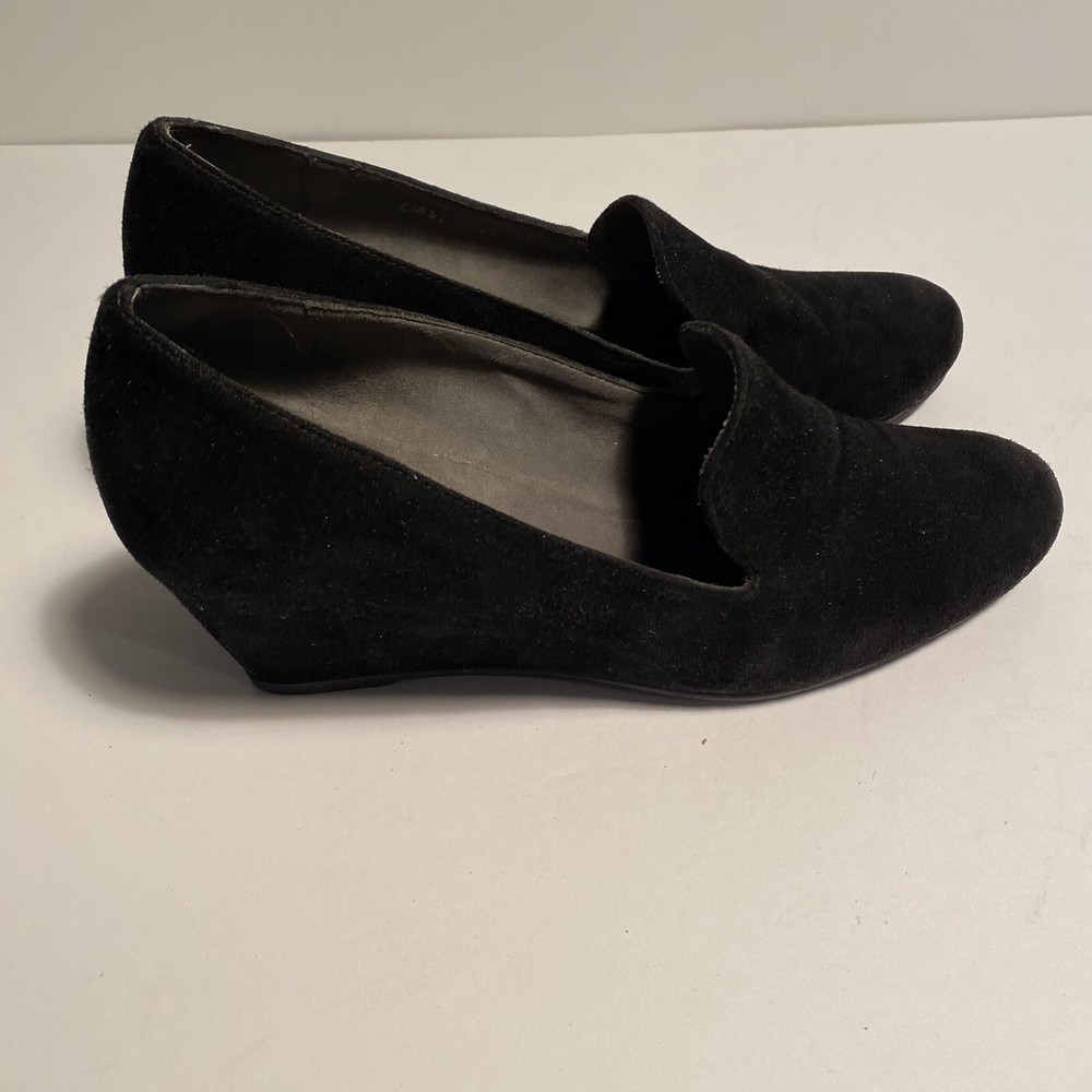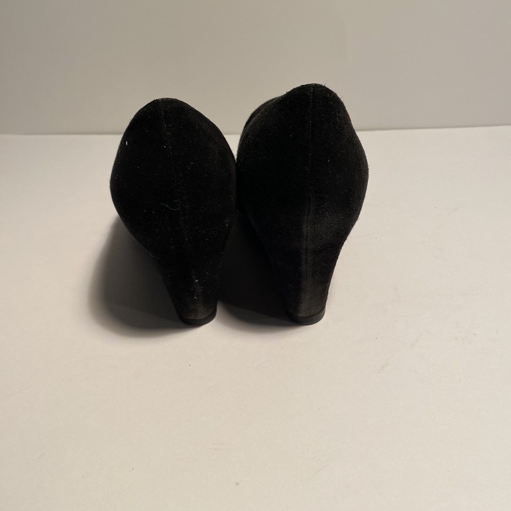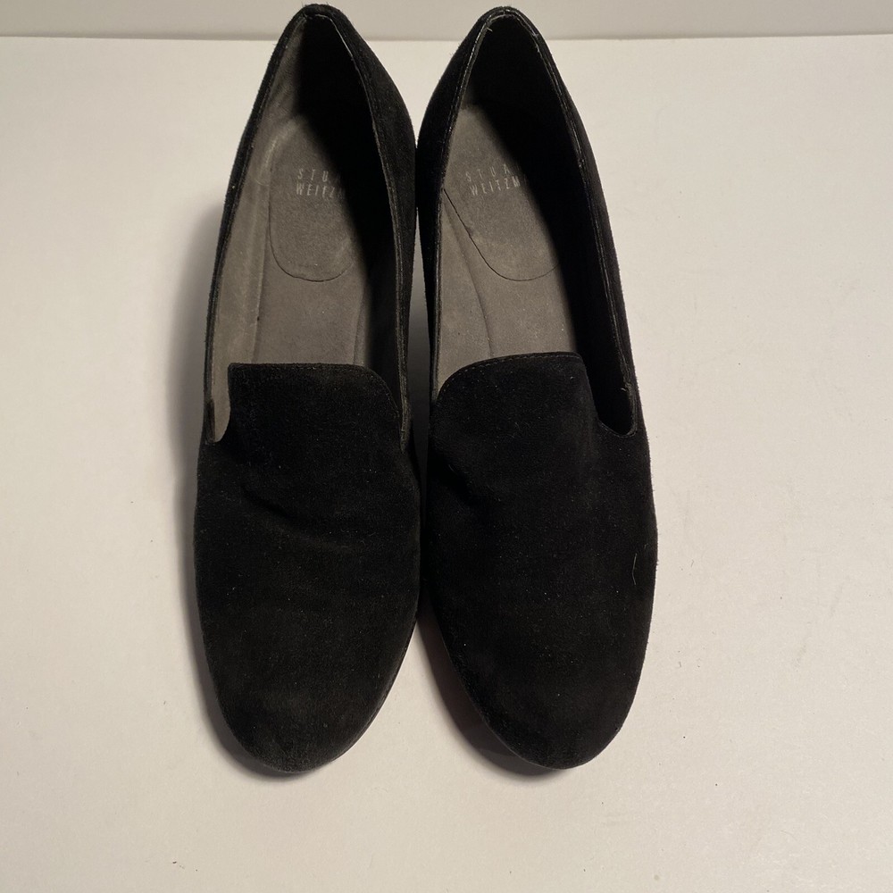 STUART WEITZMAN Black Suede ARISE Wedge Heel Court Shoe US Size 7.5 This pre-owned item is in excellent condition, exhibiting little to no signs of wear. The STUART WEITZMAN Black Suede ARISE Wedge Heel Court Shoe in US Size 7.5 is a stylish and sophisticated choice for women. Featuring an almond toe shape and slip-on closure, this high heel court shoe is made of black suede with a leather insole for added comfort. The wedge heel design adds a touch of elegance, making it a versatile option for both casual and formal occasions. Fast responses to any questions you may have. If you encounter any issues with your purchase, please know that returns are accepted.