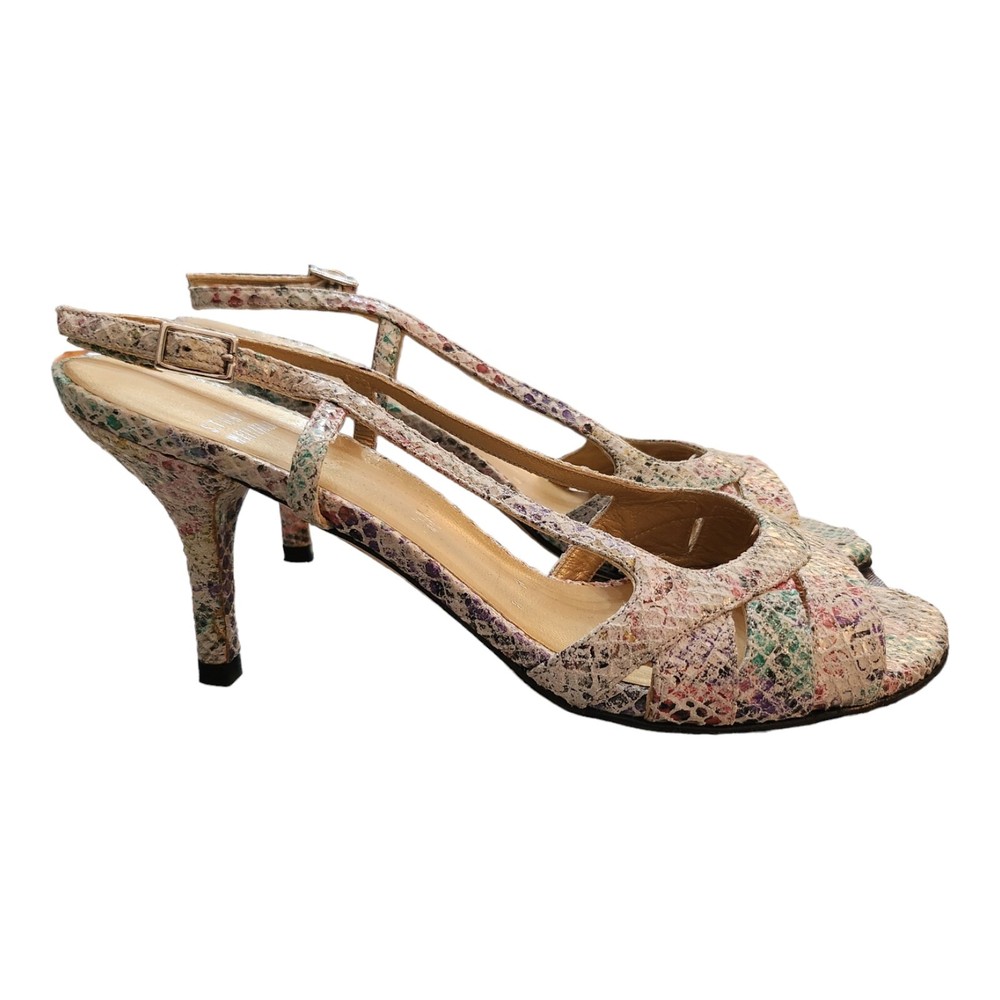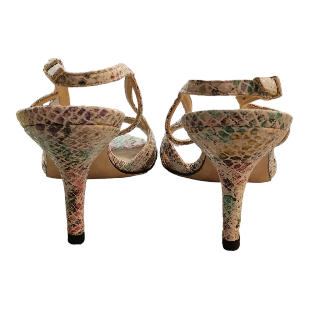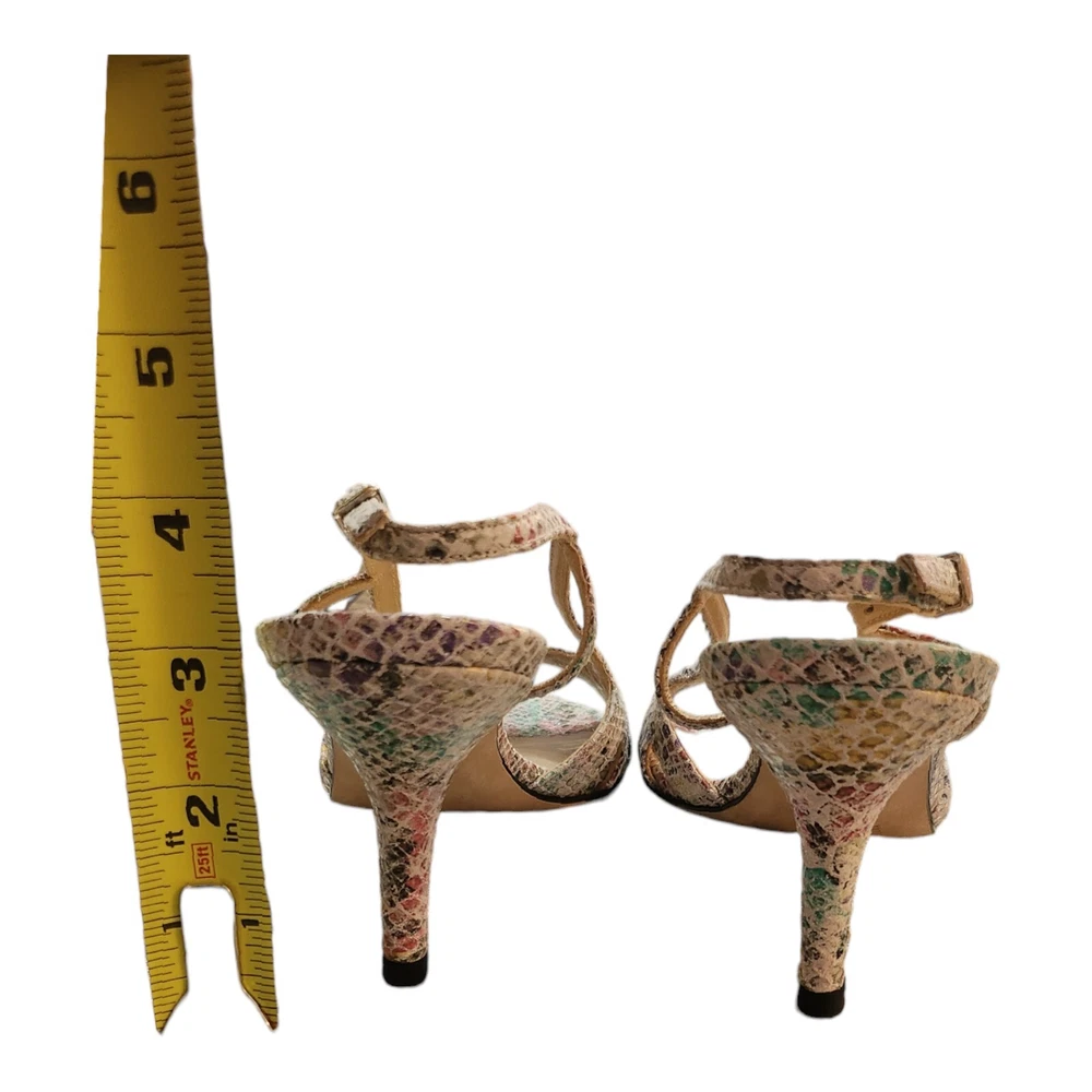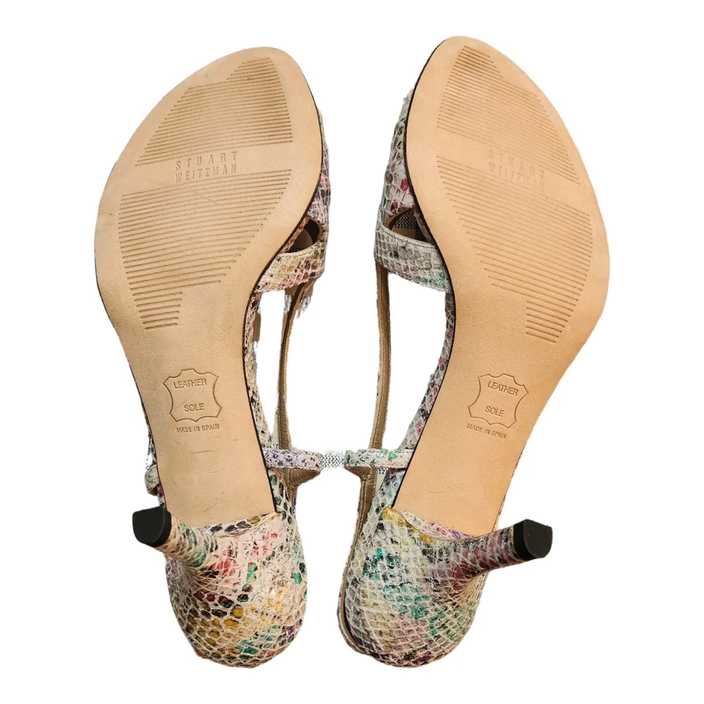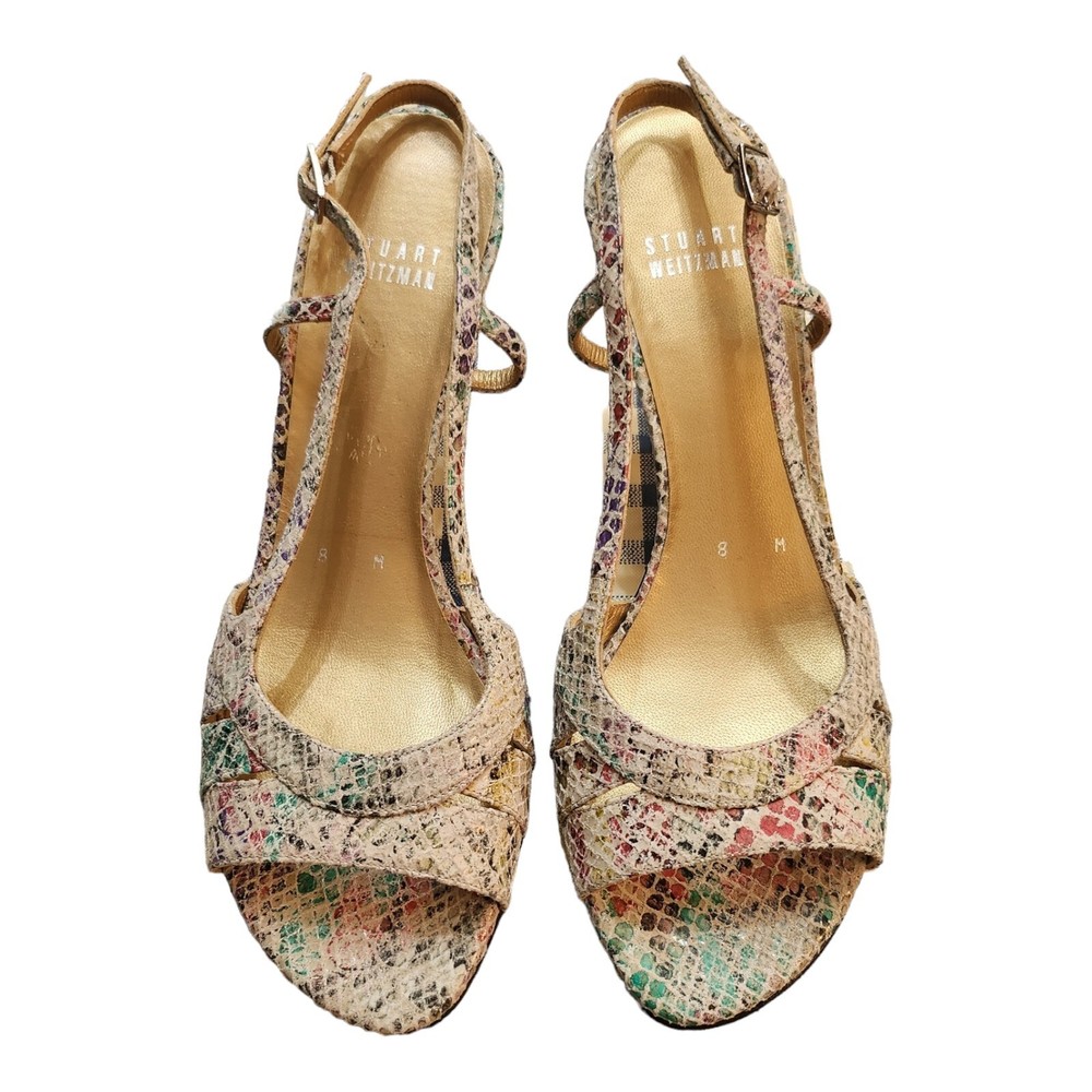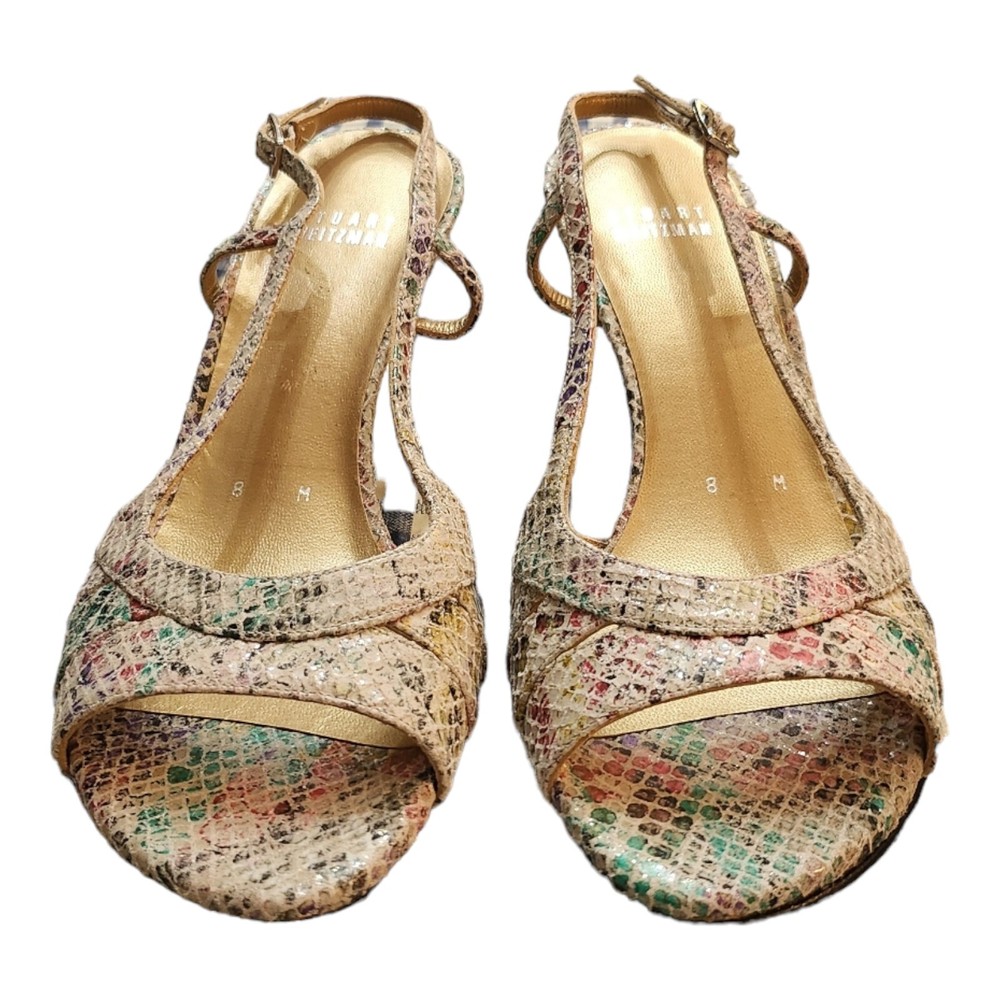 Step out in style with these eye-catching Stuart Weitzman Rainbow Python Stiletto Heel Strappy Sandals, a perfect blend of fashion and function for the discerning woman. The striking multicolor animal print upper is crafted from premium leather, setting the stage for a sophisticated yet playful look that's ideal for a variety of occasions, from business meetings to formal events, or a night out on the town. Designed with both comfort and elegance in mind, these sandals feature a supportive ankle strap with a buckle closure to ensure a secure fit, while the breathable lining and insole offer all-day wearability. The high stiletto heel adds a touch of drama to your ensemble, measuring a sleek 3 to 3.9 inches, perfect for elevating your height without compromising on style. Whether paired with a little black dress or tailored trousers, these sandals are a versatile addition to any wardrobe.