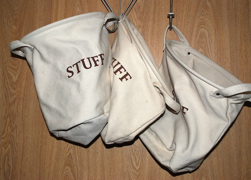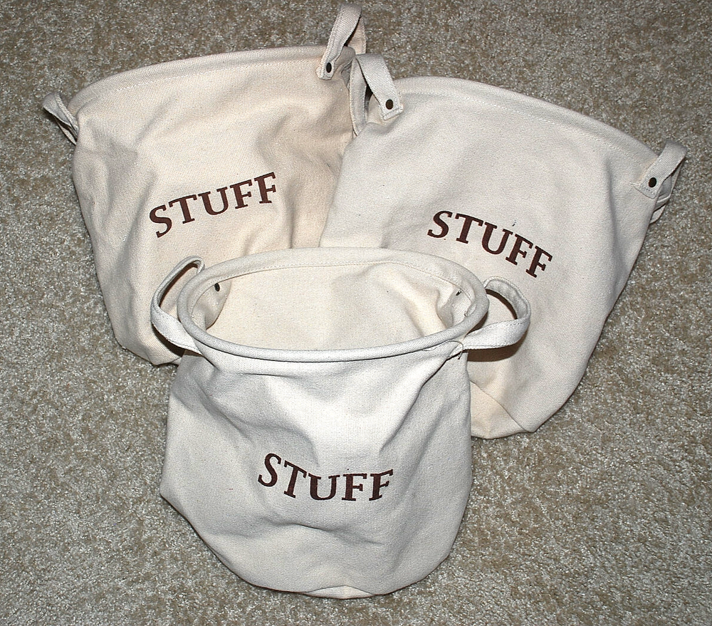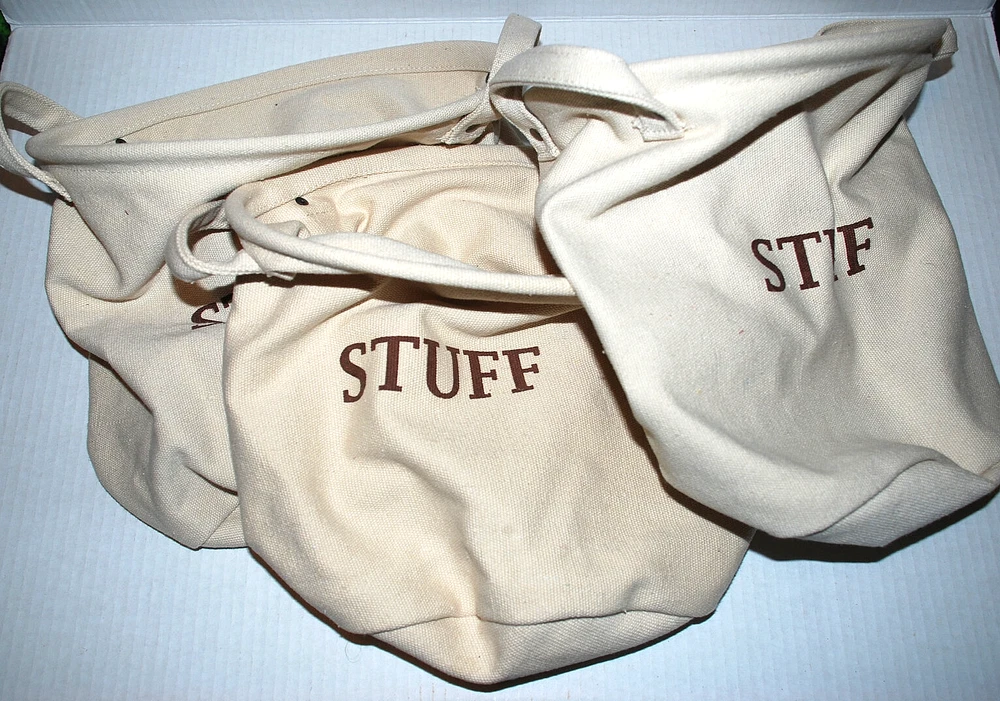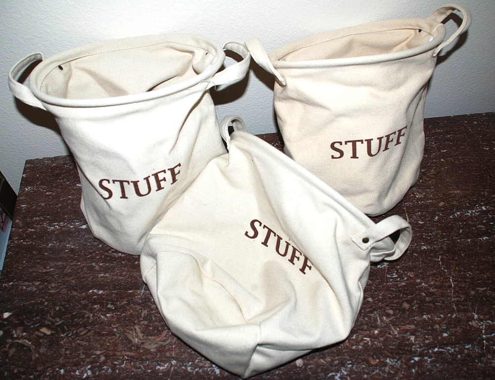 STUFF Utility Canvas Carry Bags With Handles Organizing Storage Totes Lot of 3. They each measure 11" tall by 10" wide by 9" deep. Add practical functionality to your space with this Lot of 3 Vintage STUFF Utility Canvas Carry Bags . These sturdy, classic totes are made of durable canvas material, featuring reinforced handles and a spacious, open-top design perfect for everyday storage and organization. Whether you’re tidying up craft supplies, tools, books, or pantry goods, these bags offer both style and substance. Each bag is marked with bold “STUFF” lettering on the front, lending a playful yet vintage industrial vibe. Great for home, garage, car trunk, or office use. Features: Lot of 3 matching canvas utility bags Sturdy canvas construction with reinforced stitching Dual carry handles for easy transport Printed with bold “STUFF” text for a retro look Ideal for storage, organizing, transporting items Vintage aesthetic with authentic wear and character Approximate Dimensions (each bag): 11" tall by 10" wide by 9" deep. Perfect for lovers of rustic décor, vintage storage solutions, or anyone looking to add character and function to their organizing game. Cosmetically, the carrying bags are in very nice pre owned condition with no rips or tears. They're very sturdy and clean. Overall, they're really nice with very minimal signs of age marks or spots.