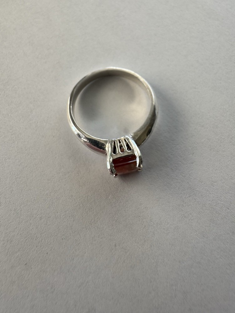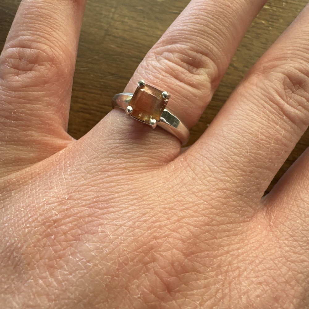 This is a stunning ring made of sterling silver with a square-shaped Oregon sunstone as the main stone. The band is 3mm wide and the sunstone measures 6.6mm in length and width, with a depth of 6.3mm. The ring is size 6.5 and is stackable with other gemstones. It is handmade and features a solitaire setting. The ring is perfect for various occasions such as Mother's Day, engagement, graduation, anniversary, birthday, and Valentine's Day.