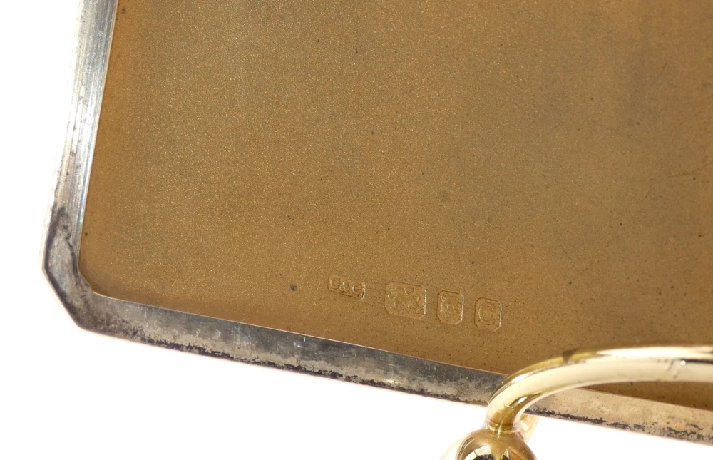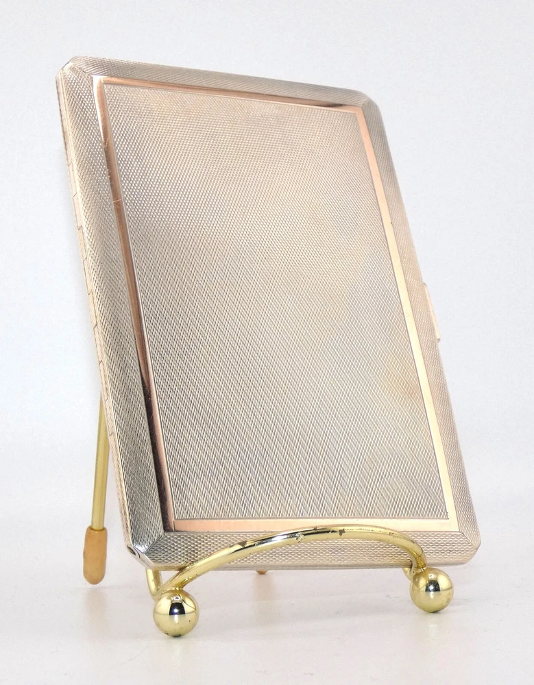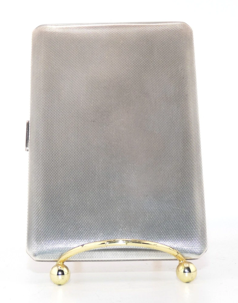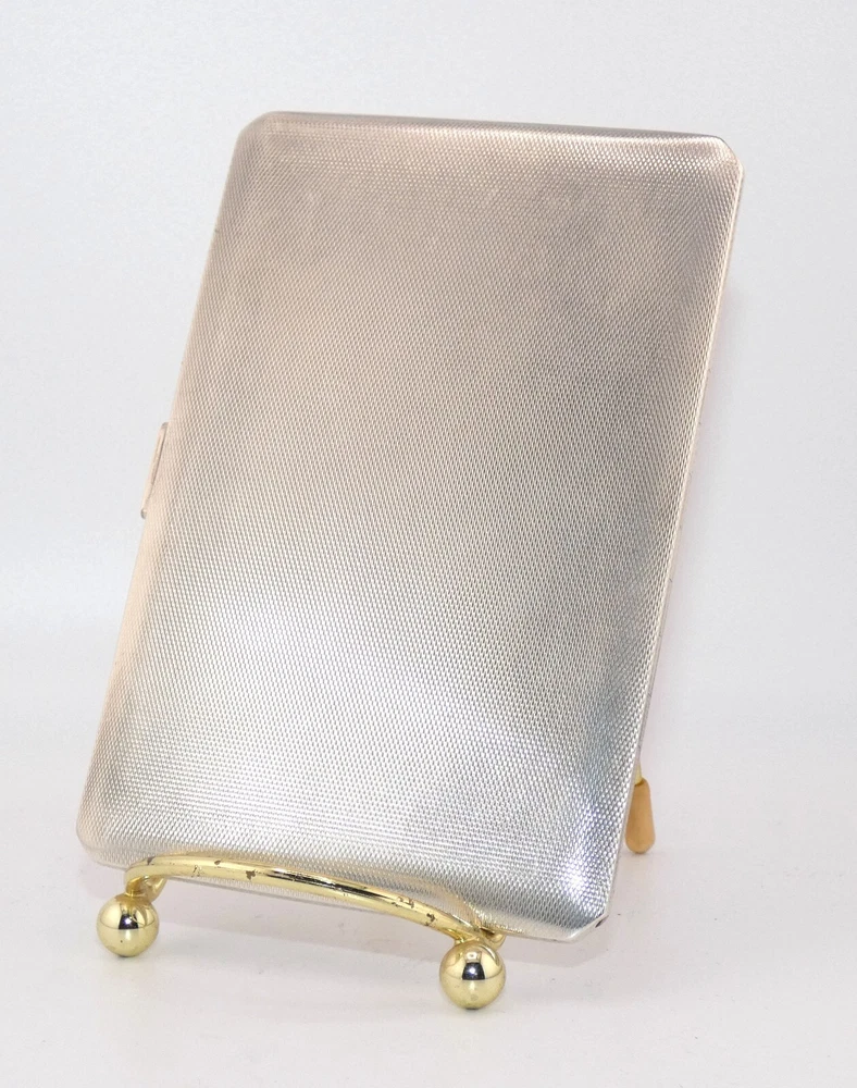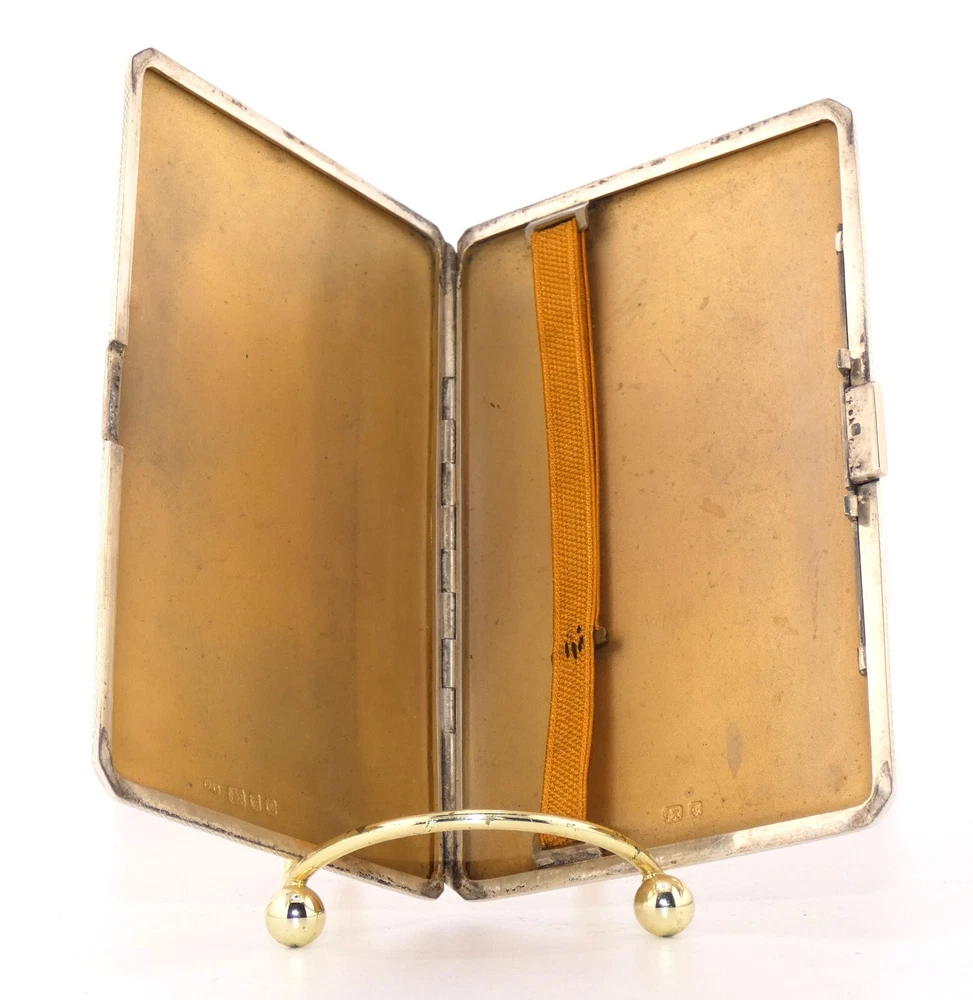 STUNNING Sterling Silver & Gold Cigarette Case Art Deco Hallmarked London C&C EX Description: Offered here is an elegant vintage Georgian Cohen & Charles of London sterling silver and gold cigarette case. The hallmarks date to 1938. Cohen & Charles were preeminent gold and silver makers in London, their combination of form and function were well renowned. This heavy vintage cigarette case is no exception. Rectangular in shape, the front of the sterling case is surrounded by an inset border of gold. The reverse is all sterling. It opens by a press-tab at the right.The gold-wash interior still retains the elastic cigarette holder device – cloth ‘stapled’ together. It has lost some of its elasticity. The interior is in excellent condition. The exterior shows some slight use, with two very slight impressions – one on the front, one on the reverse. The hallmarks are as follows. On the interior left are “C&C” in a rectangle, a lion passant, an uncrowned leopard’s head, and a “C,” impressed in squares. On the right side of the interior is a lion passant and an uncrowned leopard. From my interpretation of these marks is that the case is sterling silver, made by ‘C&C’ – the London smiths Cohen & Charles. The ‘C’ dates the case to 1938. There are no gold marks, but I suspect, given Cohen & Charles’ works, that the border on front is karat gold. When I first acquired the case, it was black with tarnish. I have carefully and delicately cleaned as much as I can, yet there is still work to do on the tarnish. It is a beautiful, stunning pieces of pre-war (WWII) design, and at the height of the Art Deco movement. It would be a prize in any tobacconists collection – as well as an excellent investment. Approximate Measurements: 5 inches tall by 3 -3/8 inches wide by 3/8 inch deep. Condition Report: Excellent condition with discrepancies noted above. The case snaps shut and is tight - there are no spaces between the two edges. The photos, scans and/or video are crucial elements of the description and are to be considered just as important as the description. I ask that you study them closely. The photos shown are of the actual item – some views have been taken with a flash camera. Review them carefully, as you may notice a flaw I missed. I cannot stress this enough: If you have any questions regarding the condition of an item, need additional photos, exacting measurements, or anything else, PLEASE message me! I will be happy to accommodate you. Be aware that most of the items I offer are antique or vintage – they may have been pre-owned and used. As a result, they could have flaws commensurate with age and use, and are sold as-is without the stand or other device (unless noted). Unless stated in the description or condition report, these may not be immediately noticeable. If you expect a new, pristine-condition item ― please think carefully before you bid. I must stress this as some bidders have expected immaculate items with no signs of previous use. If you are not accustomed to antique or vintage items, please ask questions before bidding. Terms of Auction or the Necessary Fine Print! One Moon Mercantile is my small home-based business, and I offer the highest quality of items available, with auctions beginning at the most reasonable price possible. I take pride in accurate descriptions, quick communications, swift shipping, and honest postage costs. I treat every customer as if I am the buyer and rest assured, I will treat you honestly and with respect. All I ask is that you do the same in return. I urge you to ask any questions you may have in advance of bidding on my items. When you do bid on an item, you are agreeing to the following conditions: · Do not ask me to end an item early. In respect to other eBayers who may want to bid on the item, I will not end an item early. · Bidding on any of my items listed as antique, vintage or collectible are considered used and will not be 'brand new' (unless specified). Due to the unique condition of each item, I have a ‘no return’ policy. Please keep this in mind when you bid. · By placing a winning bid, you have agreed to purchase the item offered. · Payment is due within three days of auction end. If you need longer to pay, simply let me know. Items will be shipped within one or two days once payment is confirmed and funds are received. · There are very rare occasions which I may need to cancel an auction which has an error … even if the auction has ended. In the case of the latter, a refund will immediately be credited to you. · Shipping costs are reflective of the actual weight of the item up for bid, and include the approximate weight of the box/envelope and any packing materials needed to ensure safe delivery to you. I always reimburse you for any postage overage. Any time the postage costs more than I quote, I pay the difference. The default postage is Ground Advantage, but you will always have the option to choose Priority Mail or First Class (if appropriate). Ephemera will be shipped via Media Mail when appropriate. I will combine shipping to keep your postage costs low; let me know if you have won several items within a three-day period, or if you are planning on bidding on another of my items ending later. · International bidders: I will not post this item as a 'gift.' I want the eBay experience to be fair and ethical as possible for both of us. · Winning bidders are required to pay all appropriate customs and taxes. · Any manufacturer's original warranty or guarantee on an antique or vintage article which is part of the item’s history (an attached tag, wording on a box, etc.) is void on any item I sell. “Jesus answered, ‘I am the way, the truth, and the life. No one comes to the Father except through Me.’” John 14:6 <>< ~`~ I truly appreciate your interest in my auction! ~`~ 25-12