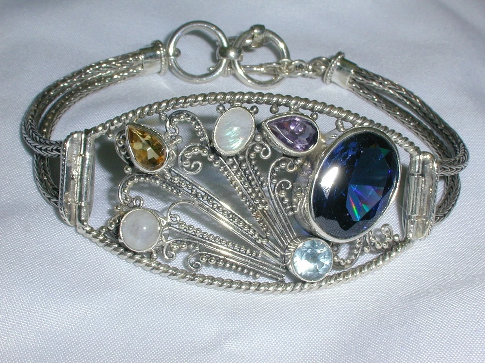 Add a touch of exotic elegance to your wardrobe with this stunning Bali bracelet. Crafted from bold sterling silver, this bracelet features a beautiful chain style adorned with A large sparkling blue quartz gemstone- plus topaz, Moonestones, Amethyst and Citrine sotnes. The bracelet is 7 3/4" to 8 3/4" long and is perfect for any occasion. The piece is made with 925 metal purity and is a wonderful addition to any fine jewelry collection. The bracelet's unique style and design reflect the beauty of Bali, making it a must-have for anyone who loves exotic fashion. Don't miss out on the opportunity to add this beautiful bracelet to your collection. DESCRIPTION: Hallmarked: 925 Weight: 28.67 Grams Width: 1 1/4" wide by 2 3/8" across the Centerpiece the band has a double chain and a toggle clasp Length: Can be worn from 7 3/4 to 8 3/4" long It looks just stunning on the Wrist! Free US domestic shipping , international shipping is available at actual first class rates. Please see my other listings for more great jewelry.