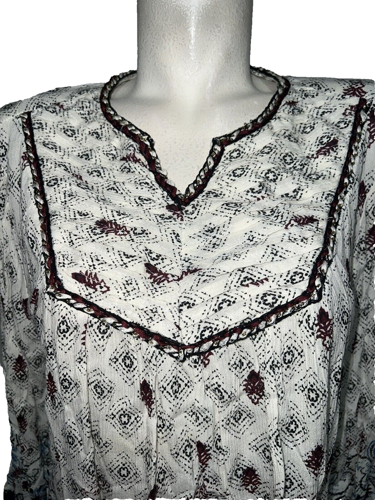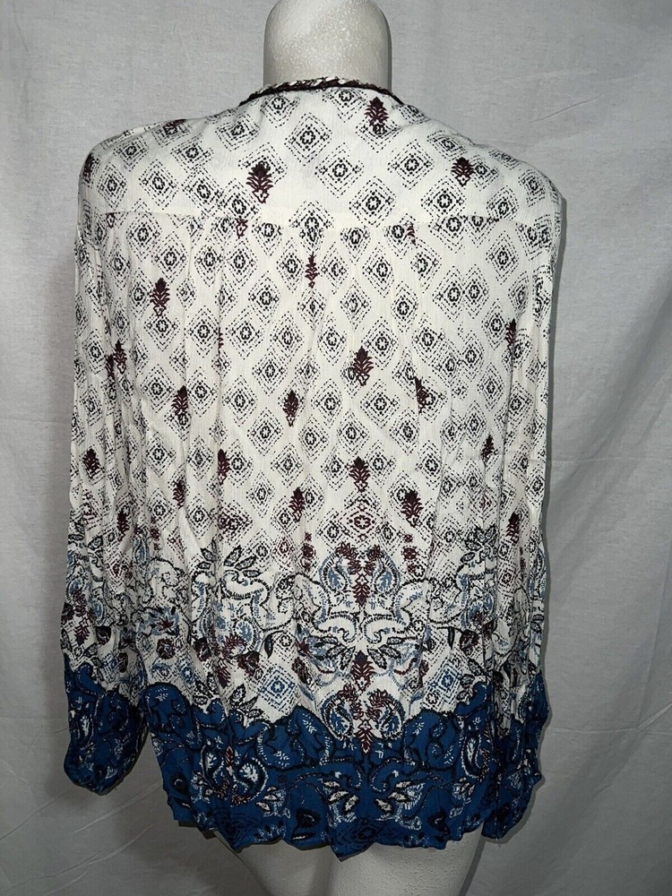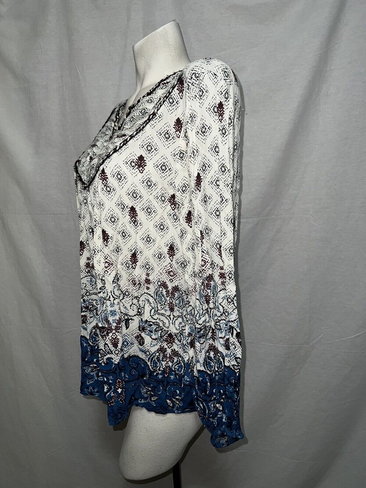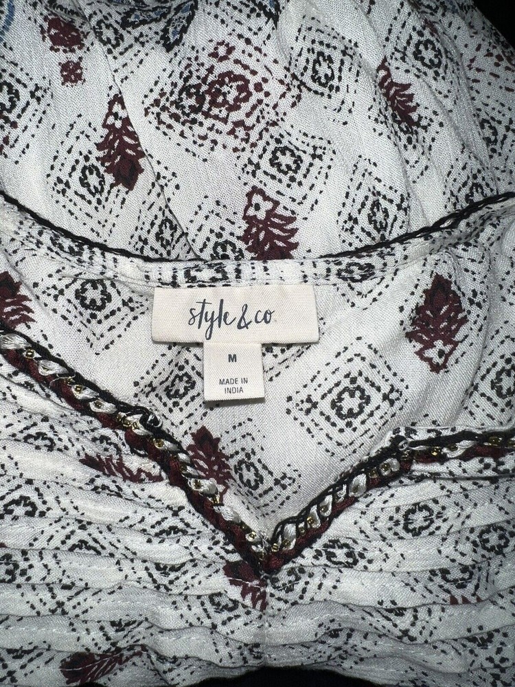 The STYLE & CO Top is a women's clothing item in size M, featuring a V-neckline and a pullover closure. This burgundy, blue, and ivory blouse shirt is made of woven fabric with pleated accents, making it perfect for casual occasions. The geometric floral pattern and balloon sleeves add a touch of bohemian flair to the basic style, making it suitable for winter, fall, and spring. With a relaxed fit and machine washable material, this Style&co. blouse offers both comfort and style for any woman's wardrobe. ...BRAND: Style & Co. ...SIZE: M Condition: Excellent MEASUREMENTS: 27.5" Length (shoulder to hem) 23" Chest (underarm to underarm) 23.5" Sleeves (shoulder to edge) ~ Combined shipping is available. ~ You will find *berryfine* one of a kind items for a great value. ~ My items come in varying condition - please read descriptions. ~ If you have any questions or concerns, please contact me. ~ Thank you for looking, good luck, and happy bidding!!!!