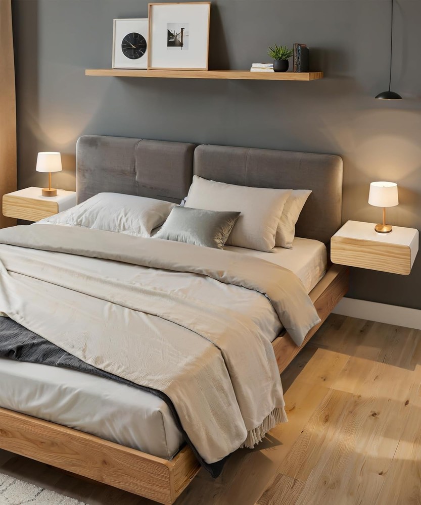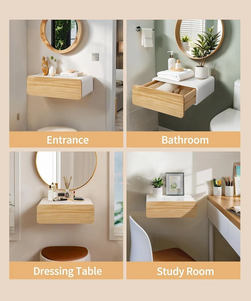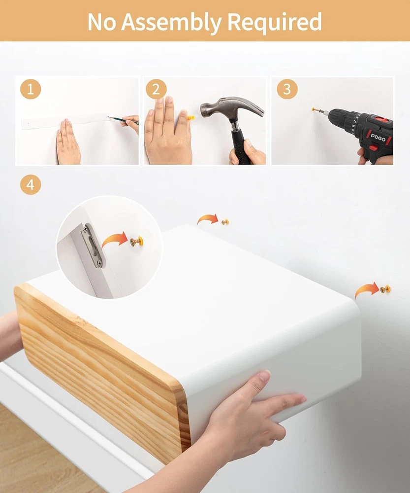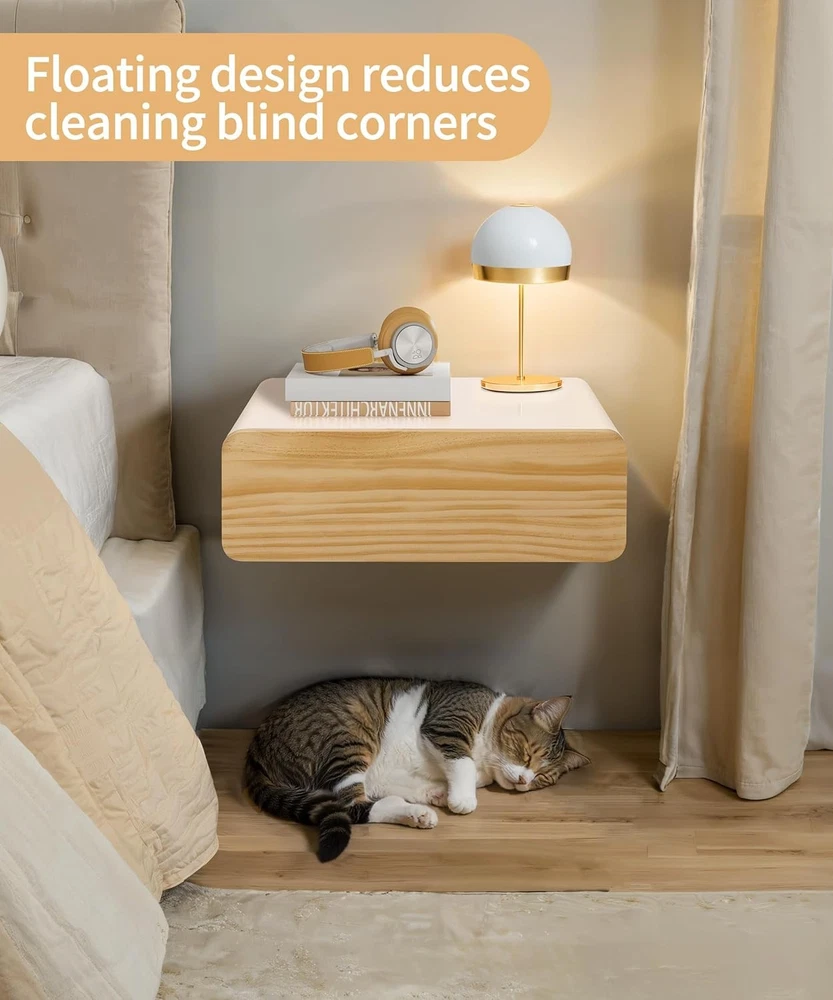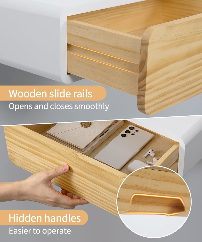 SUMGAR Floating Nightstand White with Drawers Modern Bedside Table Product Details Brand: SUMGAR Product Dimensions: 15.7"D x 10"W x 5.1"H Maximum Weight Recommendation: 20 Pounds Color: White Style: Modern Item WeightFrame Material: 7 PoundsPine Wood Top Material TypeShape: Pine WoodRectangular : The gentle curves of the arc line design enhance the visual appeal while ensuring safety by eliminating sharp edges, creating a soft, inviting atmosphere in your bedroom. This design perfectly complements the sleek white and natural wood finish for a modern yet cozy aesthetic -: Save time and effort with our pre-assembled floating nightstand, ready to use right out of the box. This nightstand offers a secure and elegant wall-mounting option, combining classic craftsmanship with modern functionality for a sturdy, space-saving solution - : Crafted from durable, high-quality pine with exceptional workmanship, this floating nightstand is built to last. Its robust construction ensures long-term stability and reliability, while the meticulous attention to detail adds a refined touch to your bedroom decor : Featuring traditional wooden drawer slides for a smooth, quiet glide, and discreet hidden handles that maintain a sleek, modern appearance. This wall nightstand ensures both functionality and a clean, uncluttered look in any room & -- : Designed to float seamlessly on your wall, this white wall mounted nightstand frees up valuable floor space while reducing those tricky, hard-to-clean corners, making your bedroom both spacious and easier to maintain