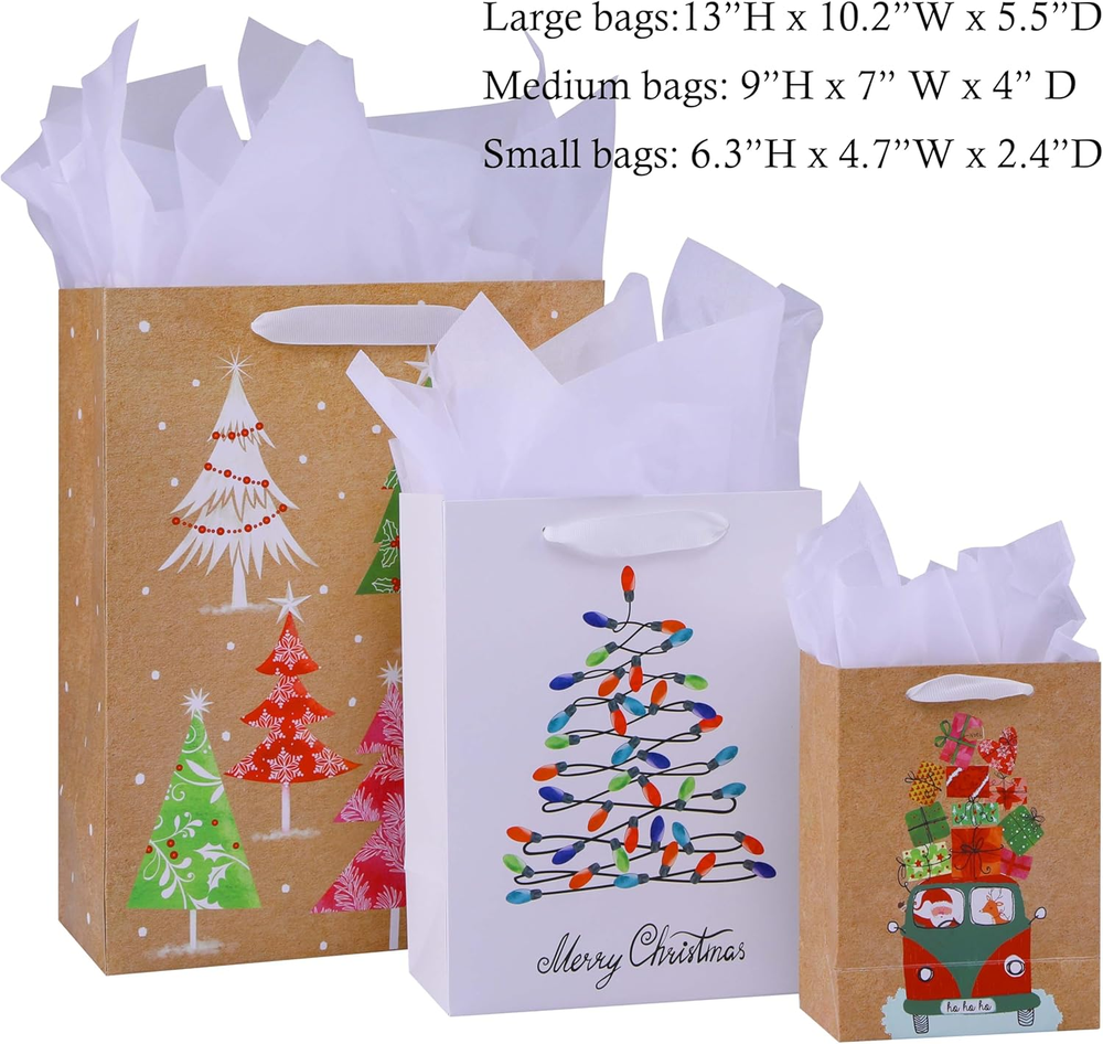 Assorted Sizes-- Large bags:13" * 10.2" * 5.5", Medium bags: 9" * 7" * 4", Small bags:6.3" * 4.7" * 2.4". 3 bags for each design, 9 bags in total. 18 sheets of white tissue paper in total. These assorted Sizes of Christmas holiday theme gift bags are perfect for birthday treat bags, goodie bags, party bags, gift bags, party favor bags, holiday gift bags, Xmas Gift Bags, retail bags, and more. Product Description Christmas Gift Wrappings - Wrap the Holidays in Vibrant Cheer! Add to Cart Add to Cart Add to Cart Add to Cart Add to Cart Customer Reviews 4.8 out of 5 stars 60 4.8 out of 5 stars 98 4.7 out of 5 stars 86 4.8 out of 5 stars 100 4.7 out of 5 stars 386 Price $9.99 $ 9 . 99 $13.99 $ 13 . 99 $9.59 $ 9 . 59 $12.99 $ 12 . 99 $18.99 $ 18 . 99 Size 13" 13", 9" 13", 9", 6" 13", 9", 6" 13", 11", 9" Count 3 6 9 9 24 Dessign 3 6 3 3 6 Tissue Paper 9 red tissue paper 12 white tissue paper 18 white tissue paper 18 white tissue paper 24 white tissue paper Material cardstock cardstock cardstock cardstock kraft paper SUNCOLOR Charming Christmas Gift Bags for Joyful Giving Wrap your gifts in festive style with our gift bags, Impress and make every present memorable. SUNCOLOR Luxurious Christmas Boxes for Perfect Presents Impress with our elegant Christmas gift boxes, enhances your holiday gifting. SUNCOLOR Festive Christmas Tissue Paper for Every Gift Add the final touch with our Christmas tissue paper. Make each gift extra special this season. 1 Gift Bags 2 Gift Boxes 3 Tissue Paper The video showcases the product in use. The video guides you through product setup. The video compares multiple products. The video shows the product being unpacked.