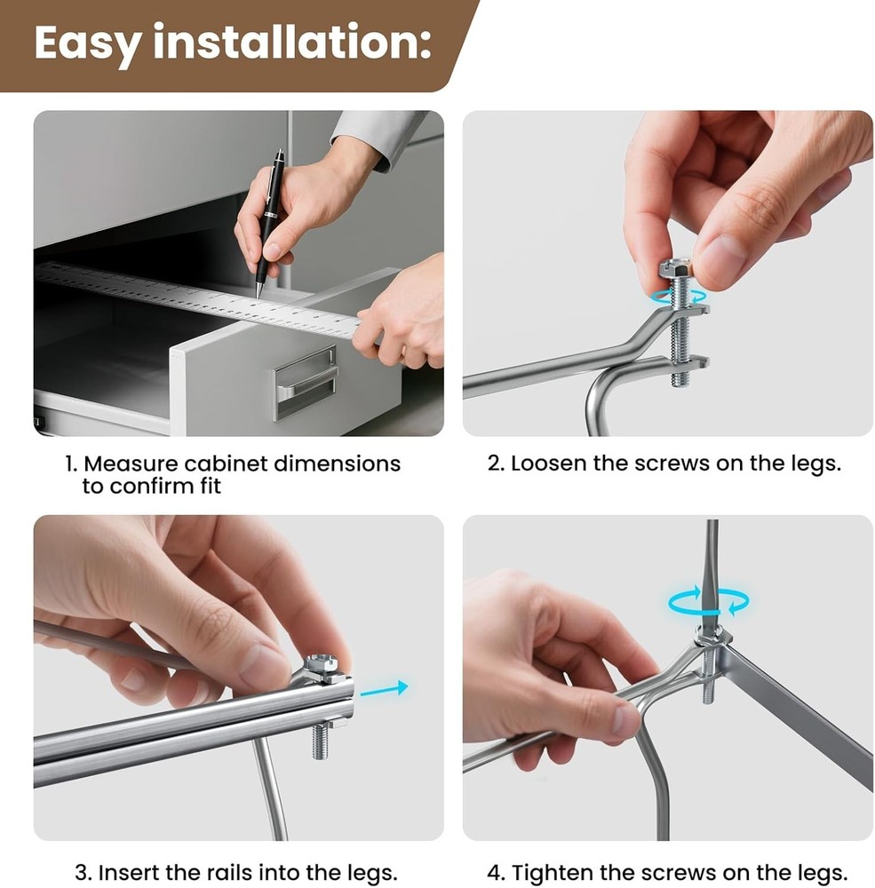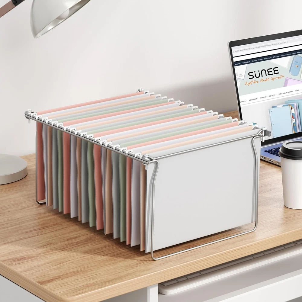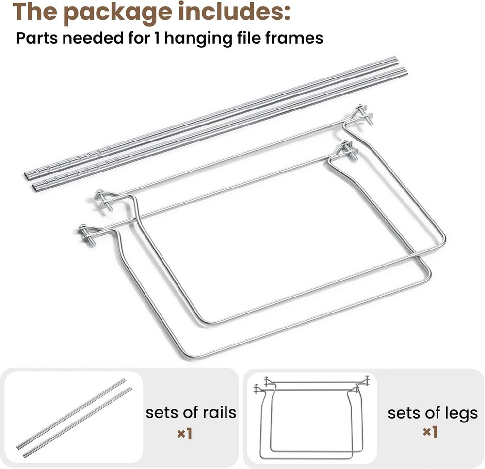 SUNEE Hanging File Folder Frame, Letter Size Files Holder Bars 17.5 Inches, Set Product description Package Includes: All components required for 1 hanging file folder frames, Designed to meet your daily organizational needs. Size: The hanging folder frame is 12.5" wide at the top and 11.5" wide at the base, with a height of approximately 10.15".Paired with 17.5" metal rails, fits letter size hanging folders. Easy to Install: This hanging file frame can be easily installed according to the instructions, efficiently and effortlessly. Enhanced Organization: You can transform a standard drawer into a functional filing cabinet with our hanging file frames,which making it suitable for both home and office environments.
