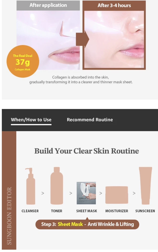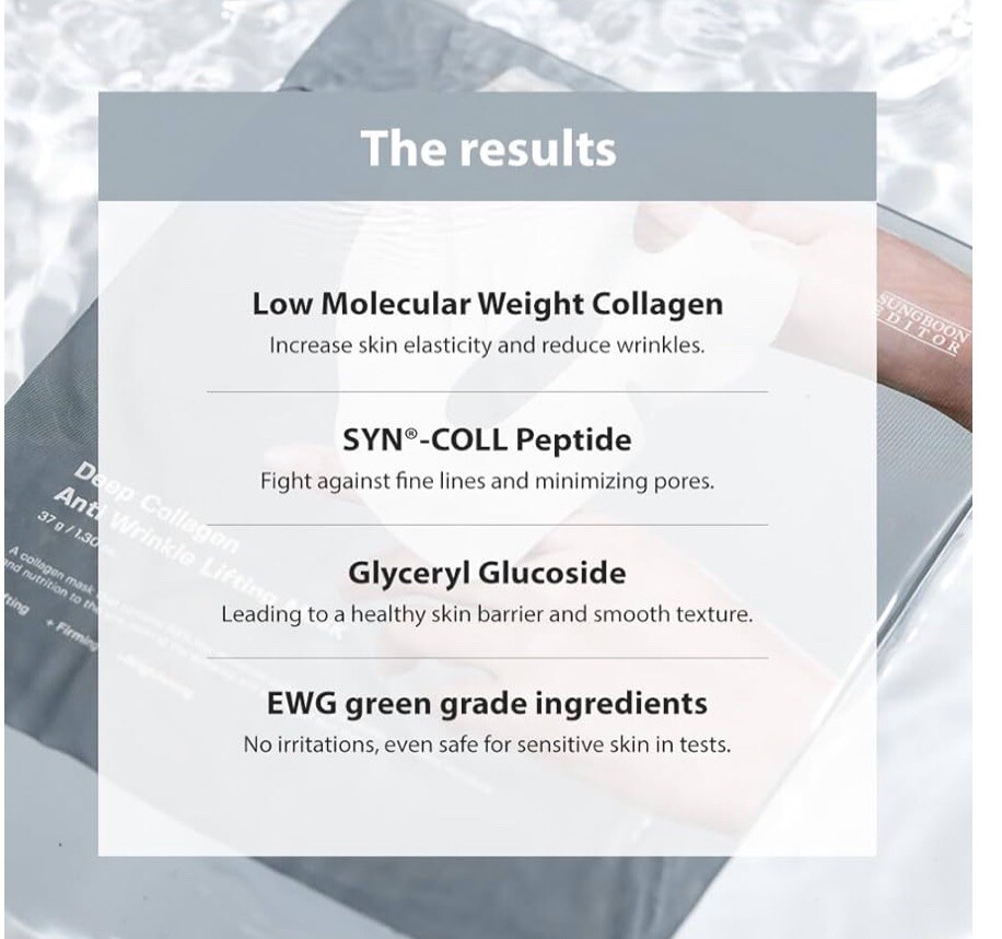 SUNGBOON EDITOR Deep Collagen Overnight Mask 37 G x 17 sheets/Box. A $4.70 /sheet value Facial Hydrogel Masks with low molecular weight collagen for elasticity, firming, and moisturizing The real collagen 2,160,000ppb