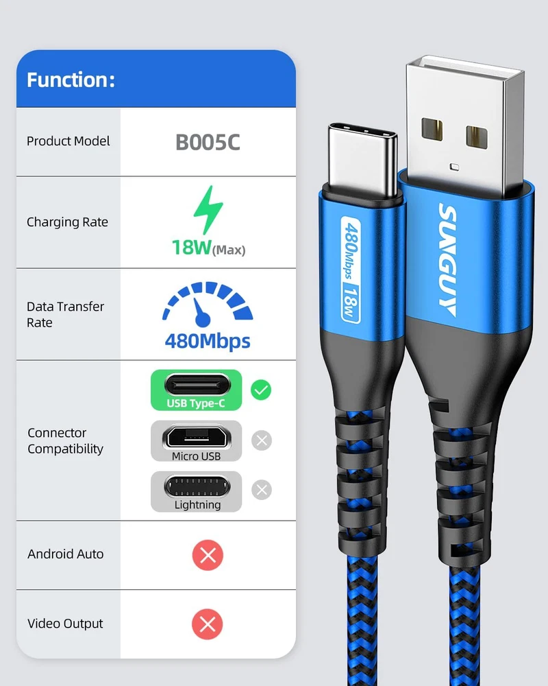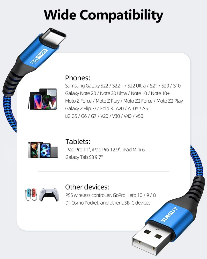 SUNGUY USB C Cable 1.5FT [3Pack] 3A Short USB to USB C Cable Fast Charging Data Sync Braided Compatible with iPhone15/15Pro/15ProMax/15Plus, Samsung Galaxy S23/S22/S21, USB C Devices -Blue š±ćSupport Fast ChargećThe USB A to USB C Cable Supports 3A safe and fast charging, support QC 3.0/2.0, which makes your charging faster. 56KĪ© pull-up resistor provides a safer charging current, protect your devices from damage. š”ćSupport USB 2.0 Data SyncćSUNGUY USB to USB C Cable support up to 480Mbps data transfer. High speed transfer HD movies, songs, files or photos. šćHigh-quality MaterialsćThe Type C Charging cord adopt nylon braided, TPE jacket joint, premium aluminum housing adds the durability of the cable. USB C cord is 1.5 ft (about 18 inch). It's good for short distance charging. š®ćWide CompatibilityćCompatible with iPhone 15/15 Plus/15 Pro/15 Pro Max, Samsung Galaxy S23/S22, S21/S20 Ultra S10 S9 S8 Note 20 10 9 8, Moto Z/Z2, LG G5/G6/V20/V30, Google Pixel 4/Pixel 4 XL/Pixel 3/Pixel 3XL; And other usb c devices. š¢ćWhat You GetćYou will receive 3 Pack 1.5FT Blue USB Type C cable. 12 Months Warranty! If any questions please contact us via Amazon Email or SUNGUY Customer Support Email. š±ćSupport Fast ChargećThe USB A to USB C Cable Supports 3A safe and fast charging, support QC 3.0/2.0, which makes your charging faster. 56KĪ© pull-up resistor provides a safer charging current, protect your devices from damage. š”ćSupport USB 2.0 Data SyncćSUNGUY USB to USB C Cable support up to 480Mbps data transfer. High speed transfer HD movies, songs, files or photos. šćHigh-quality MaterialsćThe Type C Charging cord adopt nylon braided, TPE jacket joint, premium aluminum housing adds the durability of the cable. USB C cord is 1.5 ft (about 18 inch). It's good for short distance charging. š®ćWide CompatibilityćCompatible with iPhone 15/15 Plus/15 Pro/15 Pro Max, Samsung Galaxy S23/S22, S21/S20 Ultra S10 S9 S8 Note 20 10 9 8, Moto Z/Z2, LG G5/G6/V20/V30, Google Pixel 4/Pixel 4 XL/Pixel 3/Pixel 3XL; And other usb c devices. š¢ćWhat You GetćYou will receive 3 Pack 1.5FT Blue USB Type C cable. 12 Months Warranty! If any questions please contact us via Amazon Email or SUNGUY Customer Support Email. Shipping from the USA All of our products are shipped from the USA, ensuring quick delivery to your destination. Payment We offer the following payment methods: PayPal, credit card, bank transfer, and eBay's secure payment system. Free Shipping & Free Returns Shipping within the USA is FREE. Additionally, any return is absolutely free for you. Risk-Free Purchase You have the option to return an item within 30 days without any justification. We cover the return shipping costs! Fast Shipping We ship immediately upon receipt of payment. Generally, the package is delivered within 2-3 days in the USA. If it takes longer, we will contact you. Quality and Costs Made in Europe, USA, China No customs fees or additional charges Total satisfaction guarantee Invoice with declared VAT available upon request in .pdf format Feedback Your feedback is very important to us. After you pay for your purchase, you will automatically receive positive feedback from us.