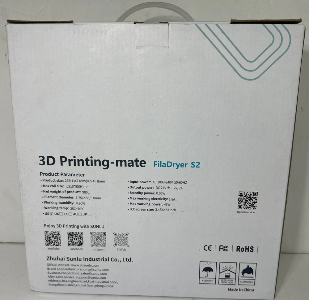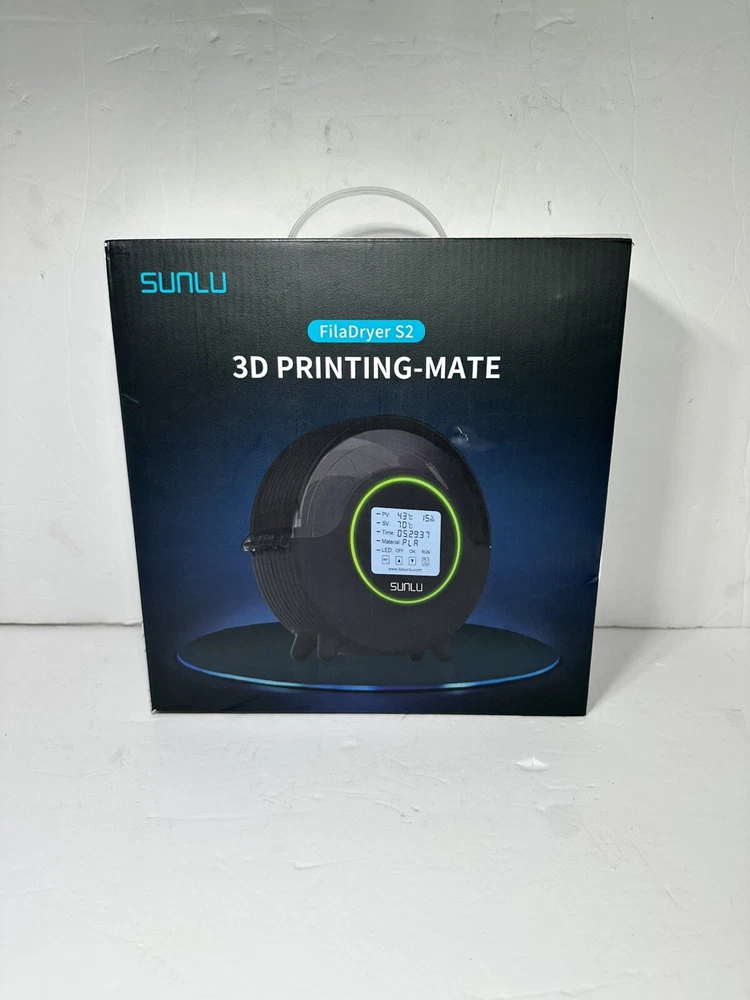 LCD Display Screen:6.4-inch LCD displayType:Filament Spool HolderModel:S2Material:High Impact PolystyreneMPN:Filament Dryer BoxUPC:Does not applyManufacturer Warranty:1 YearCountry/Region of Manufacture:ChinaCompatible Brand:UniversalTime Adjustable Range:1-99 hoursCompatible Model:For 3D Systems CubePro, For 3D Systems ProJet 1200, For Airwolf 3D AXIOM, For Anet A8, For B9Creations B9Creator, For BEEVERYCREATIVE BEEINSCHOOL, For Creality 3D CR-10, For FlashForge Creator Progtin13:Does not applyTemperature Setting Range:35℃~70℃Product Size:265(L) X274(W) X 118(H) mmCompatible Filament:PLA/PLA+/SILK/PETG/TPU/ABS/PANet Weight:1190gFilament Diameter:1.75mm/2.85mm/3.00mmProduct:Filament DryerColor:BlackBrand:SUNLU