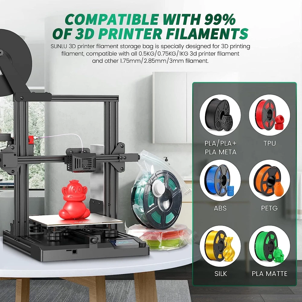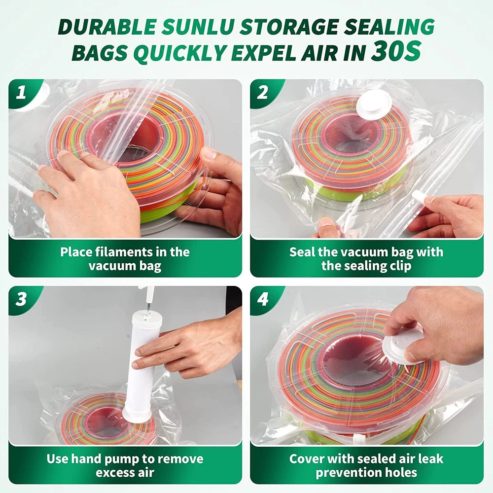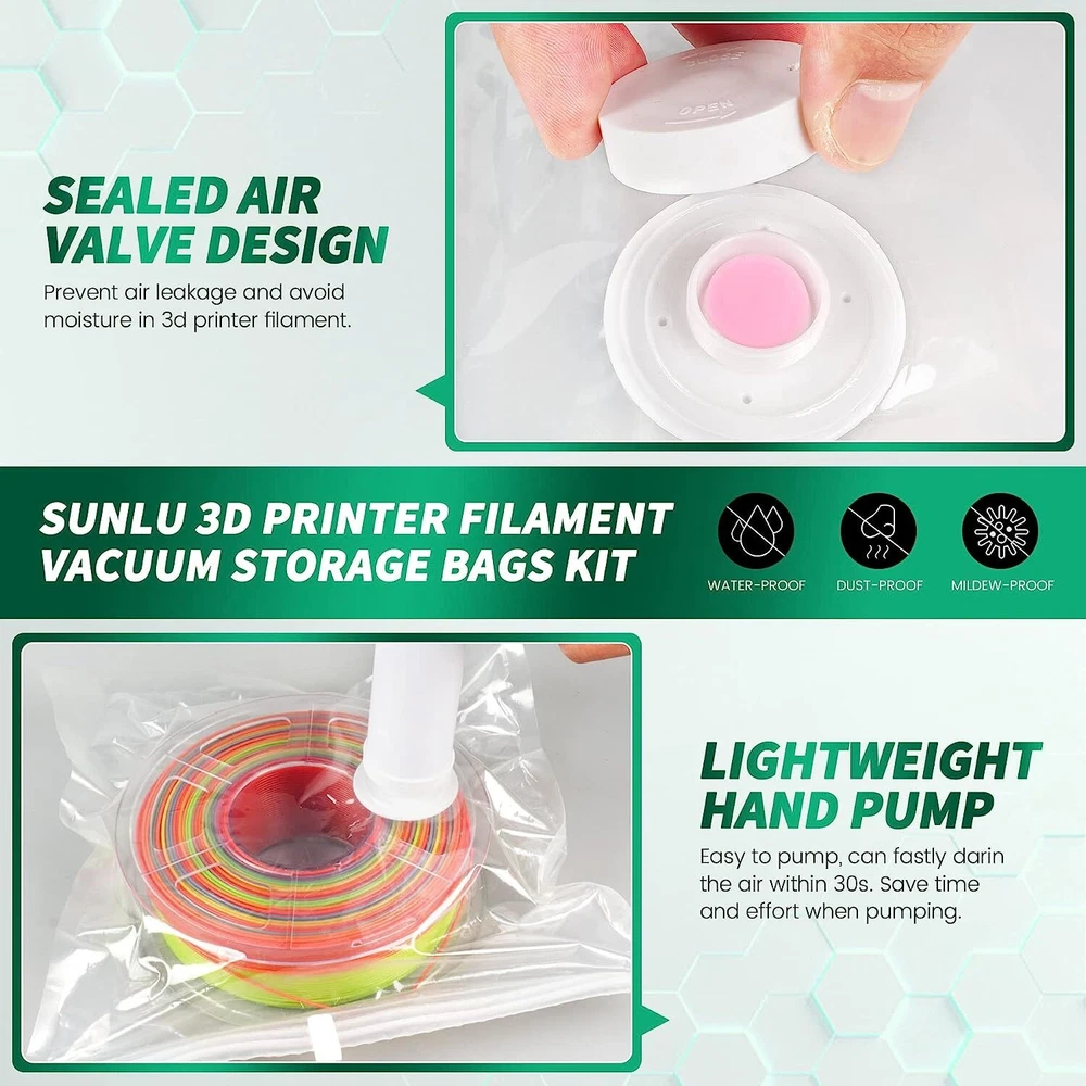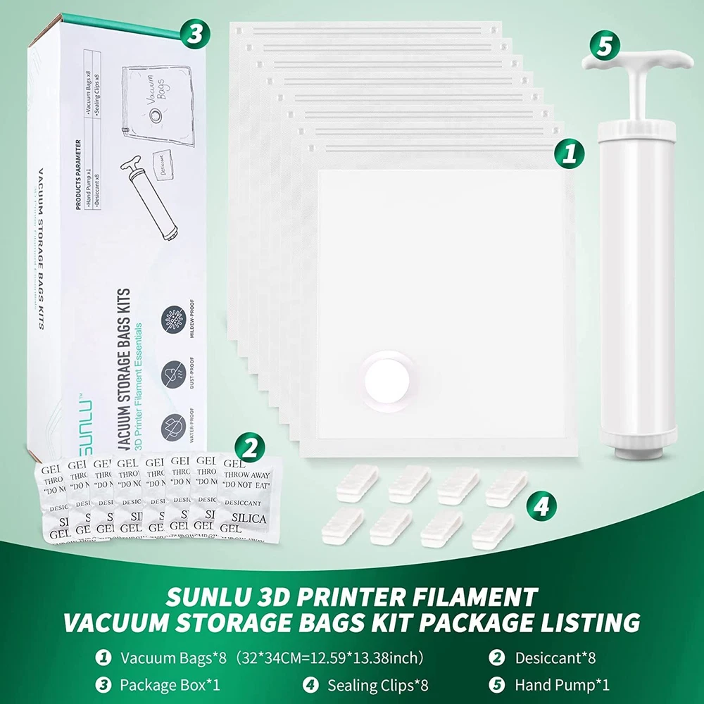 Packing List - SUNLU 3D printer filament vacuum storage kits including: 8*vacuum bags, 1*hand pump, 8*sealing clips, 8*desiccants. SUNLU filament vacuum bags size: 32*34CM(12.59*13.38inch). It can accommodate 0.5KG/0.75KG/1KG 3D printing filaments and 1.75mm/2.85mm/3mm 3D printer filaments. Good Moisture Sealing Effect - Durable SUNLU 3D printer filament vacuum bags can quickly expel air in 30 seconds to protect 3D printer filament from moisture, effectively waterproof, moisture-proof and dustproof.The filament vacuum storage bags has eavy-duty valve and double sealing zipper provide airtight protection. Quality Materials - SUNLU 3D printer filament vacuum storage bags food grade material PA+PE material, thickened design, tough and durable to prevent breakage and air leakage, reusable. Transparent vacuum bags is easy to find and observe the status of filaments. Easy to Use - ①Place 3D printer filaments and desiccant in the vacuum bag. ②Seal the vacuum bag with the sealing clip. ③Use hand pump to remove excess air. ④Cover with sealed air leak prevention holes. High Compatibility - SUNLU 3D printer filament storage bags is specially designed for 3D printing filament, compatible with all 0.5KG/0.75KG/1KG/1.1KG 3D printer filaments and other 1.75mm/2.85mm/3mm 3D printing filaments. Double Seal Zipper Moisture-proof & dust-proof to ensure the quality of 3d printing filaments. PE+PA Composite Material Strong and durable,safe and do no harm to environment. Sealed Air Valve Design Prevent air leakage and avoid moisture in 3d printer filament. Lightweight Hand Pump Easy to pump, can fastly darin the air within 30s. Save time and effort when pumping. AirWolf BigBox CraftUnique Dremel Kossel Markforged PowerSpec Robo 3D Aleph Objects CEL CubePro e-NABLE Lulzbot New Matter Printrbot SeeMeCNC Anycubic colorFabb Cubicon E3D MakerBot Ooznest Prusa Simplify3D BCN3D CraftBot Doob FlashForge Makergear OrdBot Prusa Research SUNLU Beeverycreative Ultimaker XYZprinting Zortrax Zenith Compatible with 99% of FDM 3D Printers