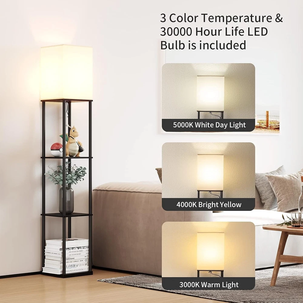 3-Color Temperatures LED Bulb Included: SUNMORY shelf lamp includes a 9 Watt, 800 lumen power saving LED bulb, so you don’t need to buy extra bulb; The LED lamp bulb is 3 color temp: 3000 K / 5000 K / 4000 K; You can switch different color temperatures according to different scenes; Also can work with smart outlets that are Alexa, Google Home Assistant, or Apple HomeKit enabled(requires smart outlet sold separately) Non-glaring Cloth Lampshade: This shelf floor lamp is equipped with a high-quality off-white cloth lampshade and opens upwards; With the built-in three-color temperature bulb, it can be used for both functional lighting and ambient lighting Storage & Display: This tall lamp has 3 layers of high density fiberboard, each with a maximum weight of more than 50 pounds; On the shelf, you can put decorations such as vases and photo frames, as well as daily necessities such as books and mobile phones; So it can be used as a corner lamp to decorate your living room or as a skinny nightstand with lamp to bring you life convenience; It is very suitable as a gift for Mother's Day, Thanksgiving Day, or Christmas Minimalist Design & Versatile Style: The contemporary stand up lamp matches asian, mid century modern, rustic, country and farmhouse decor thanks to its diverse lighting effects and simple lines Easy to Assemble: SUNMORY shelf floor lamp has been improved in craftsmanship and simplified the installation steps; Compared with other similar products, it will save you 30% percent of installation time; The accompanying package comes with the tools needed for assembly and an instruction manual containing text and video installation steps; Simple repetitive operations are very easy for most people; Warm Tip: Please tighten each post to keep the whole lamp stable