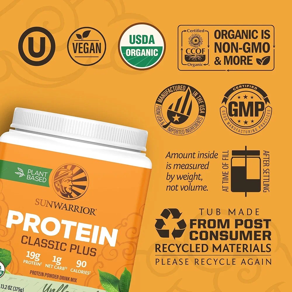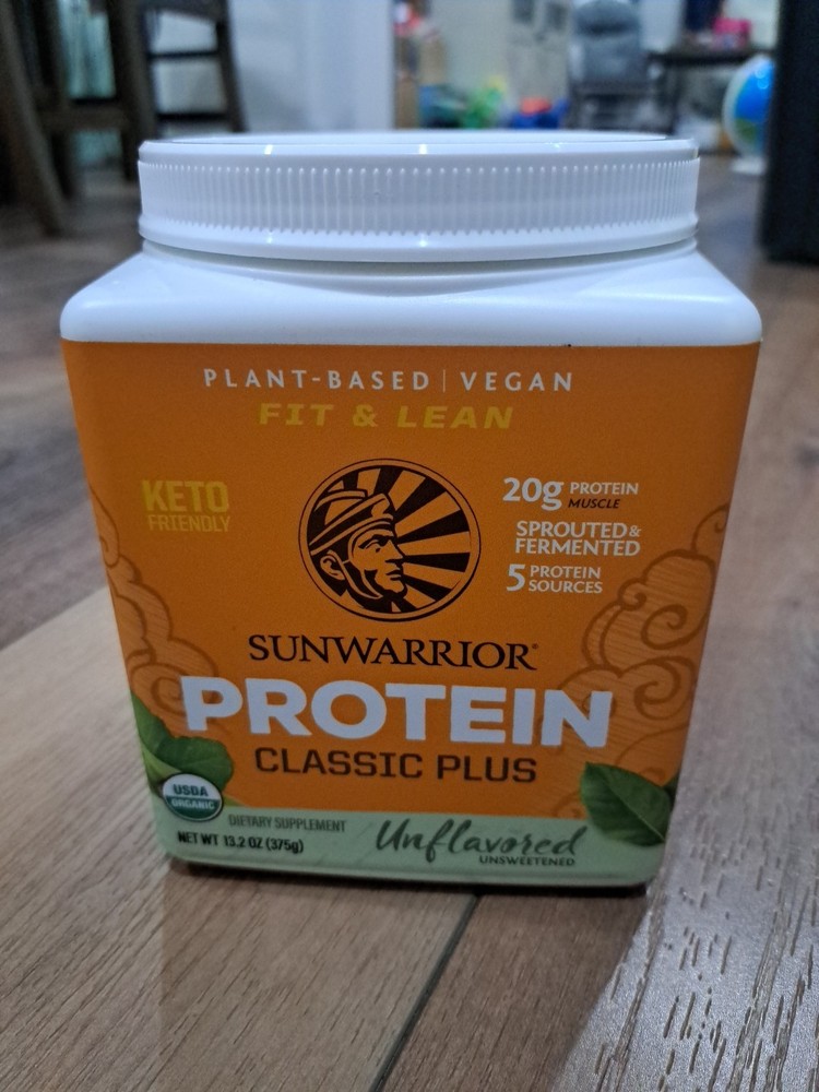 SUNWARRIOR Organic Classic Plus Natural, 13.2 oz Vegan Protein Powder Supplement. Packed with 5 powerful superfood sources. A blend of five potent, superfood organic proteins: Yellow Pea Brown Rice, Chia Seed, Quinoa, Amaranth. Gentle on Digestion with Nutrient Dense Protein. Classic Plus includes potent BCAAs and complete essential amino acids, natural fiber, vitamins, and minerals. Plant Based Equivalent of Whey Protein. With 17 to 20 Grams of protein per serving (varies by flavor), Fit and Lean formula with 100 calories and 4g carbs or less per serving, Sprouted and fermented ingredients. Clean Ingredients. USDA Certified Organic, Low Carb, High Protein, Non GMO, Vegan and Plant Based; Soy Free, Dairy Free, No Added Sugar & Gluten Free. Paleo, Kosher & Keto Friendly. Give your body an extra edge with Sunwarrior. Mix this superfood powder into your vegan protein shake, yogurt, ice cream, energy drinks & smoothie. Best loved by chefs, athletes, fitness gurus, yogis, health enthusiasts, and active souls. Sunwarrior protein classic plus dietary supplement is made using branched chain amino acids, grain-like seed superfoods and a whey equivalent for a delicious and nutritious supplement that gives you protein while being completely plant-based. The powder in this 13.2 ounce container is sprouted, fermented and packed with fiber, yet is still gentle on your digestive system. Each single-scoop serving contains 48% of the recommended daily value of vitamin c.