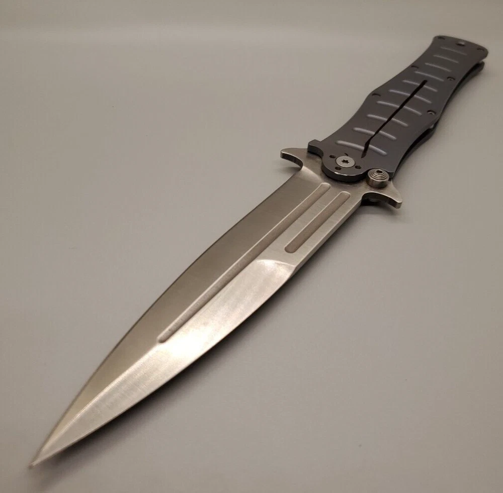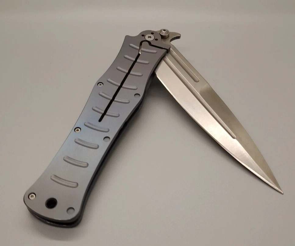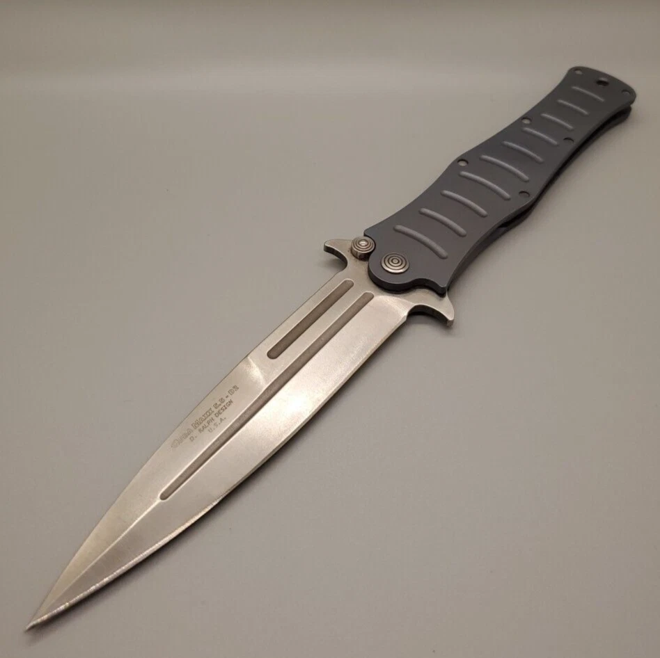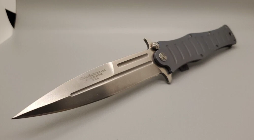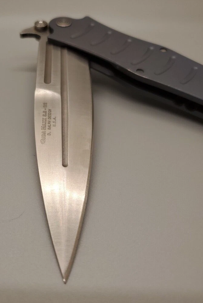 Blade Type: Spear Point, Sabre Ground Dagger Blade "RARE" Blade Edge: Original/Factory Edge Lock Type: Frame Model: Camillus CUDA MAXX-Sabre Ground Dagger Product Line: CUDA MAXX-Discontinued Handle Material: Titanium Year: 2002 Type: Enormous Pocket Knife Country/Region of Manufacture: United States Opening Mechanism: Manual Quik Flik Original/Reproduction: Original Brand: Camillus Color: Bluish Gray Number of Blades: 1 Seller Notes: “Used, excellent condition.”