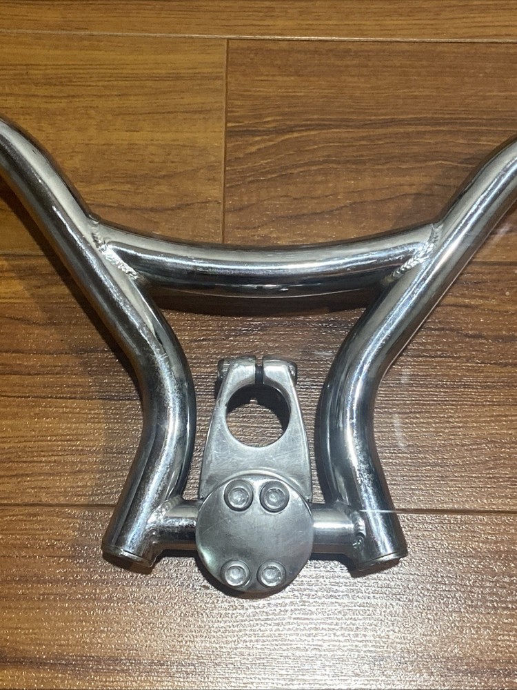 Worldwide shipping available to any country Australia UK included. Just message us if it gives you any issues at check out. These were taken straight off a high level FISHBONE BMX! CR-MO HANDLEBARS! Elevate your ride with the highly sought-after Fishbone BMX Handlebar, paired with a robust Fishbone Stem for an unparalleled biking experience. Known for their durability and sleek design, these components are a staple for any BMX enthusiast or freestyle rider looking to make a statement. You just can’t find this stuff anymore. It’s almost impossible to find. Sold 100% as is. We highly recommend you buy it quick before somebody else snatches this up. There’s only one of these available on the entire Internet and lots of people looking to build up their FISHBONE BMX.