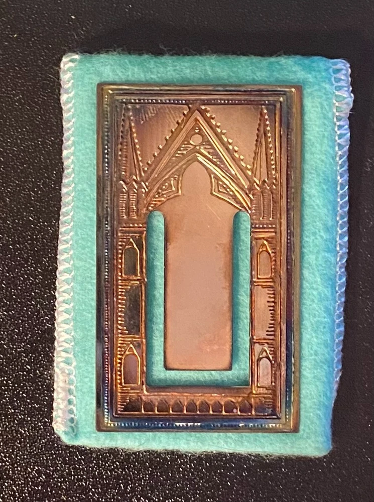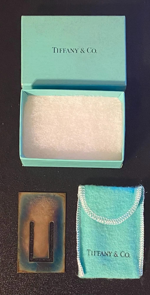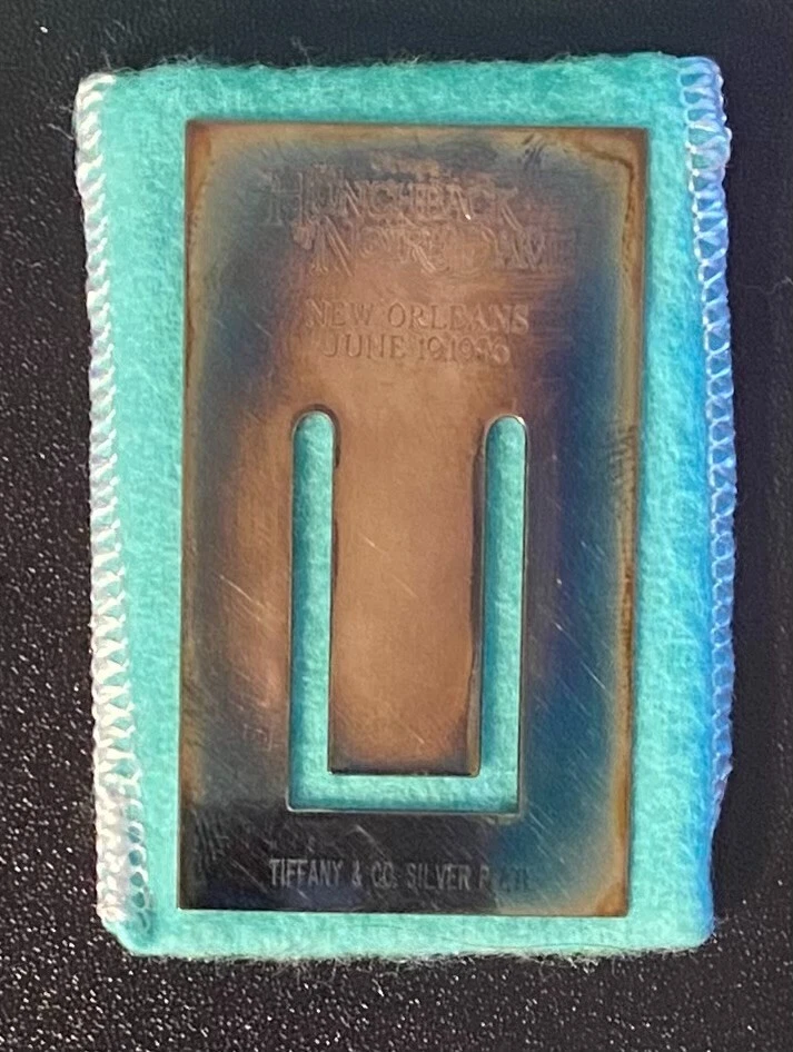 SUPER RARE Tiffany & Co. Disney's Hunchback of Notre Dame Silver Plate Bookmark. Item was from the World Premiere of Disney's Hunchback of Notre Dame at the Louisiana Superdome on June 19, 1996. The front of the bookmark displays the cathedral design, and the movie title and date are inscribed on the back of the bookmark. The silver plate currently has the patina shown in the photos but can be polished if desired. Item is sold as pictured and ships with USPS Ground Advantage or Priority Mail.