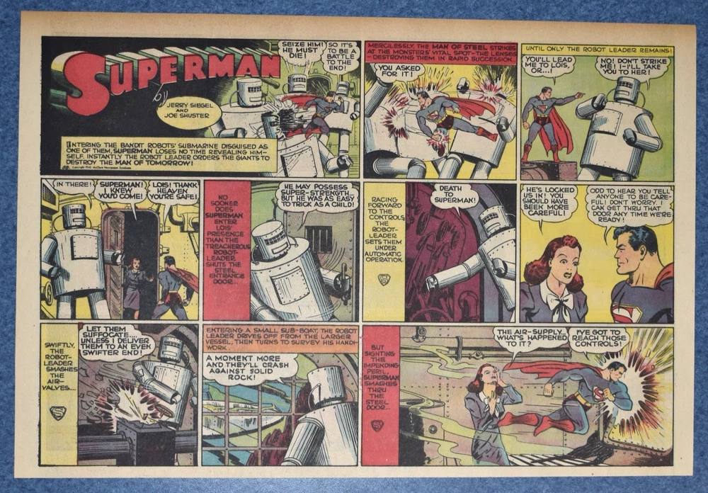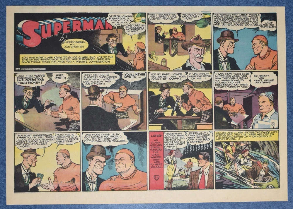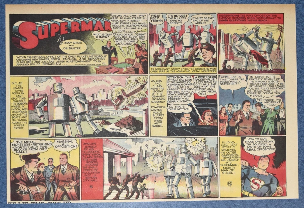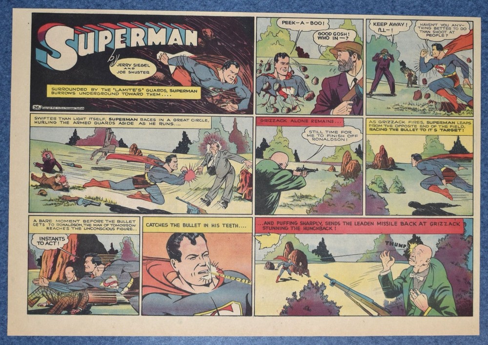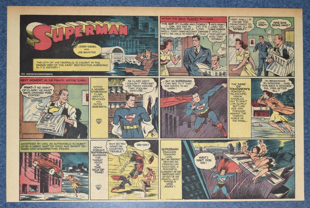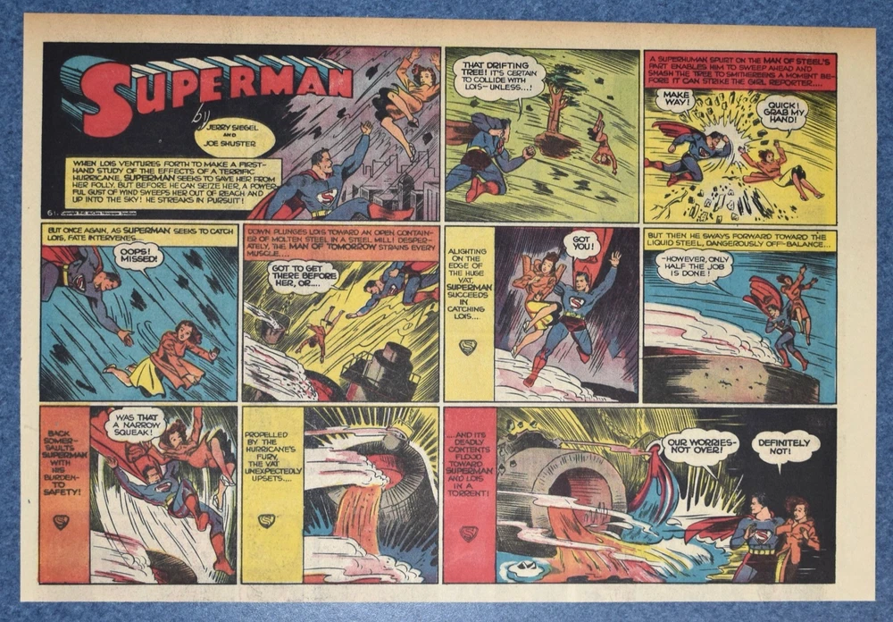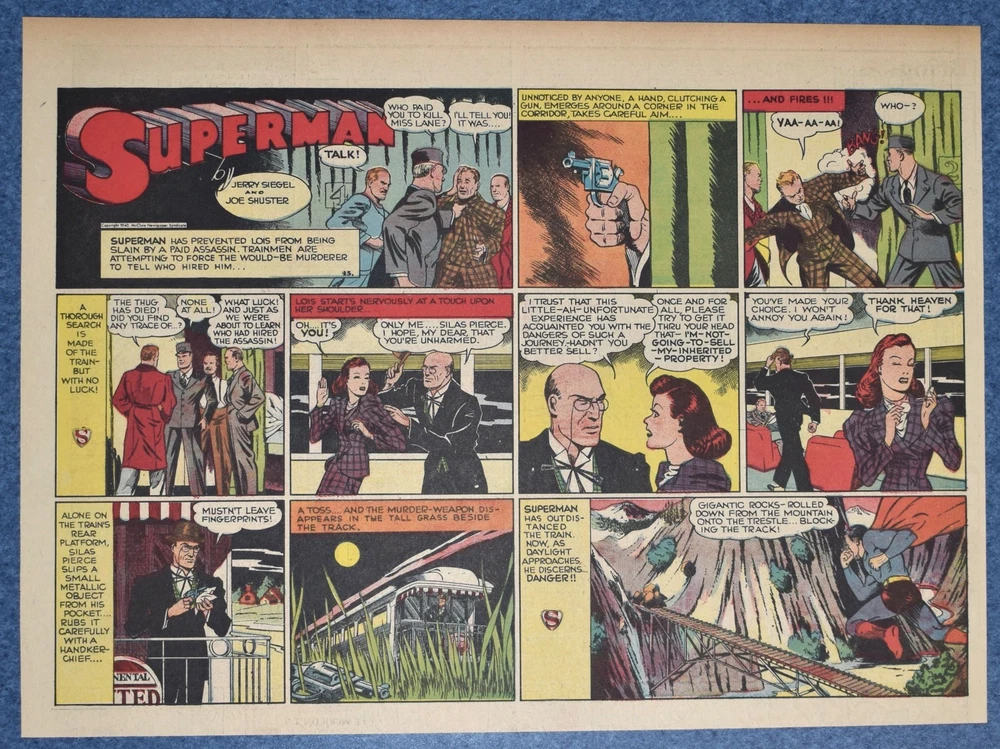 SUPERMAN Jerry Siegel and Joe Shuster 1940 D escription Year: 1940 (#27 through 61...starting in May) Count: 35 Sunday Comics Newspaper: The Kansas City Star Size: Approximately 1/2 of a page in size. The exact size varies depending on the margin, but the cut sheets are approximately 36.5 x 24.9 cm including margins, or about 14.4 x 9.8 inches. In general, the height varies a fair bit (size provided is a smaller estimate). 1940 D ATES P RESENT Month Date Contents of Reverse Side and/or Notes May 5 Winnie Winkle (1/3 pg) 12 Bringing Up Father (1/2 pg) 19 Partial comics 26 Rosie's Beau (topper) Jun 2 Bringing Up Father (1/2 pg) 9 Gasoline Alley (1/2 pg) 16 Partial comic and partial ad 23 Partial comic and partial ad 30 Partial comics Jul 7 Partial comic and Herby (footer strip comic) 14 Sappo and Wimpy's Zoo's Who! (1/3 pg) 21 Gasoline Alley (1/2 pg) 28 Bringing Up Father (1/2 pg) Aug 4 Rosie's Beau (topper) 11 Bringing Up Father (1/2 pg) 18 Rosie's Beau (topper) 25 Bringing Up Father (1/2 pg) Sep 1 Moon Mullins (1/2 pg) 8 Moon Mullins (1/2 pg) 15 Dick Tracy (1/2 pg) 22 Rosie's Beau (topper) 29 Partial comic Oct 6 Partial comic and partial ad 13 Gasoline Alley (1/2 pg) 20 Partial comic 27 Smitty (1/3 pg) Nov 3 Aunt Min and Tillie the Toiler Fashion Parade Paper Dolls (1/3 pg) 10 Gasoline Alley (1/2 pg) 17 Popeye (1/2 pg) 24 Bringing Up Father (1/2 pg) Dec 1 Partial comic 8 Moon Mullins (1/2 pg) 15 Partial comic and partial ad 22 Partial comic 29 Smitty (1/3 pg) Dates Highlighted in Blue Present C ondition Here are some general condition notes for this set of comics: There are a few small tears around the edges in the margins (larger tears are mentioned below). These comics are old and tanned, but can be handled with ease. Some dates, and/or edges, might be more tanned than others. Condition notes are predominately focused on the comic on the front side (comic featured for the auction). The color register is sometimes off a bit, but the printing generally pretty really good with these comics (nice color). Examine the photos to see how the comics look. Some dates have some slight ink transfer, but this is normally pretty minor. We also observed light ink bleed-through...this was more common (did not note every case...many dates have at least a little of this condition) . The date in normally written in the margin of the reverse side (either front or back side). We also made some notes of some date specific issues (we tried to avoid making too many notes, and instead preferred to go the generalized condition notes above). This should serve as a guide to the condition of the set, it is possible that we have not caught everything: INDIVIDUAL DATE CONDITION NOTES 5-5 (#27) The color register is off a tiny bit. 5-12 (#28) Some light ink transfer and/or bleed-through. The color register is also off a little bit. 5-19 (#29) The color register is off a tiny bit. 6-16 (#33) Some light ink transfer and/or bleed-through. 6-23 (#34) The color register appears to be off a tiny bit. 6-30 (#35) Small interior tear at the centerfold line (perpendicular...about 0.9 cm). 7-14 (#37) Some light ink transfer and/or bleed-through and there is some really light ink transfer. 7-21 (#38) The color register is off some ( see photo ). There is also some light ink transfer. 7-28 (#39) Some light ink transfer and/or bleed-through. There is also a 1 cm tear, approximately, on the bottom (mostly the margin). 8-11 (#41) Some light ink transfer and/or bleed-through. 8-18 (#42) Some light ink transfer and/or bleed-through. One panel seems to have some text that was covered up and/or not printed ( see photo ). 9-1 (#44) Some light ink transfer and/or bleed-through. 9-8 (#45) The color register is off slightly. 9-15 (#46) Large taped repair on the top front side with old brown dried out tape ( see photo ). 9-29 (#48) The color register is off a tiny bit. 10-6 (#49) The color register is off a little bit. 10-13 (#50) The color register is off a tiny bit. 10-27 (#52) The color register is off a tiny bit. 11-3 (#53) The color register is off a tiny bit. 11-24 (#56) The color register is off a little ( see photo ). 12-1 (#57) Multiple small tears. Two go slightly into the comic (less than one inch each) and one goes right to the edge of the comic. 12-8 (#58) Some light ink transfer and/or bleed-through. 12-15 (#59) Some light ink transfer and/or bleed-through. There is also a little moderate ink transfer near the centerfold line. 12-22 (#60) There is some light ink transfer across the comic. 12-29 (#61) There is some light to somewhat moderate ink transfer ( see photo ). The color register is also off a tiny bit. S hipping Shipping cost is dependent on weight, and this comic weighs 13 ounces . If more then one item is purchased we will combine shipping and recalculate the shipping cost. Items typically ship within 3-4 days (often even faster). C ombined S hipping This item may typically be combined with other newspaper comic strips, but this will not happen automatically at checkout (combined shipping has to be estimated). This can also be handled after checkout. Shipping cost on combined orders will depend on the size and weight of the package. This item will be shipped from ARIZONA .