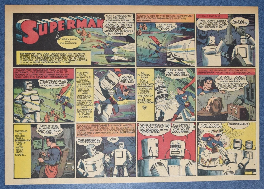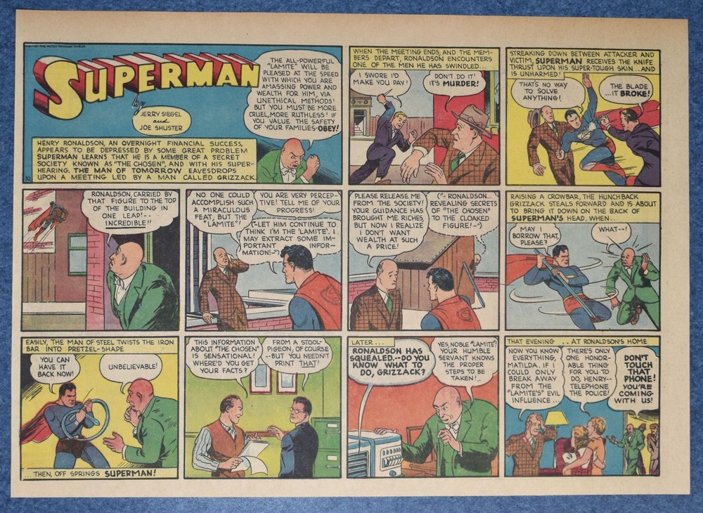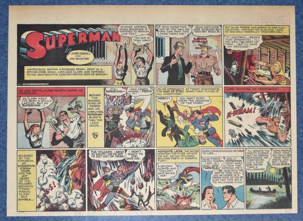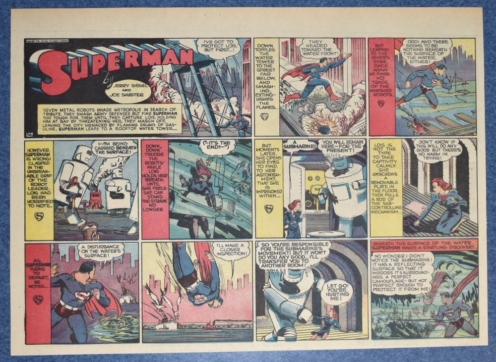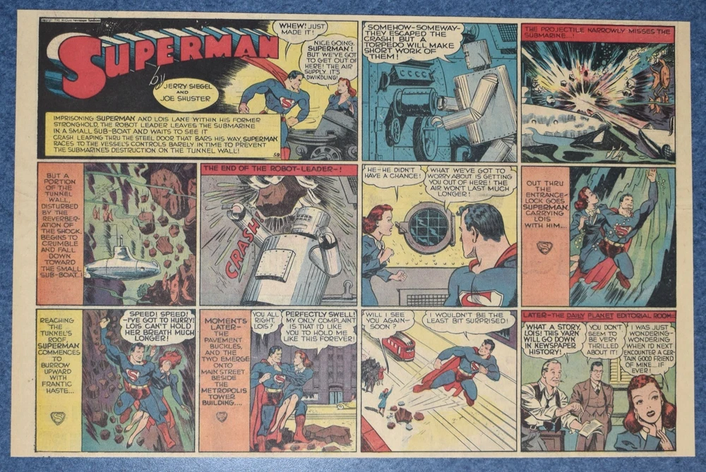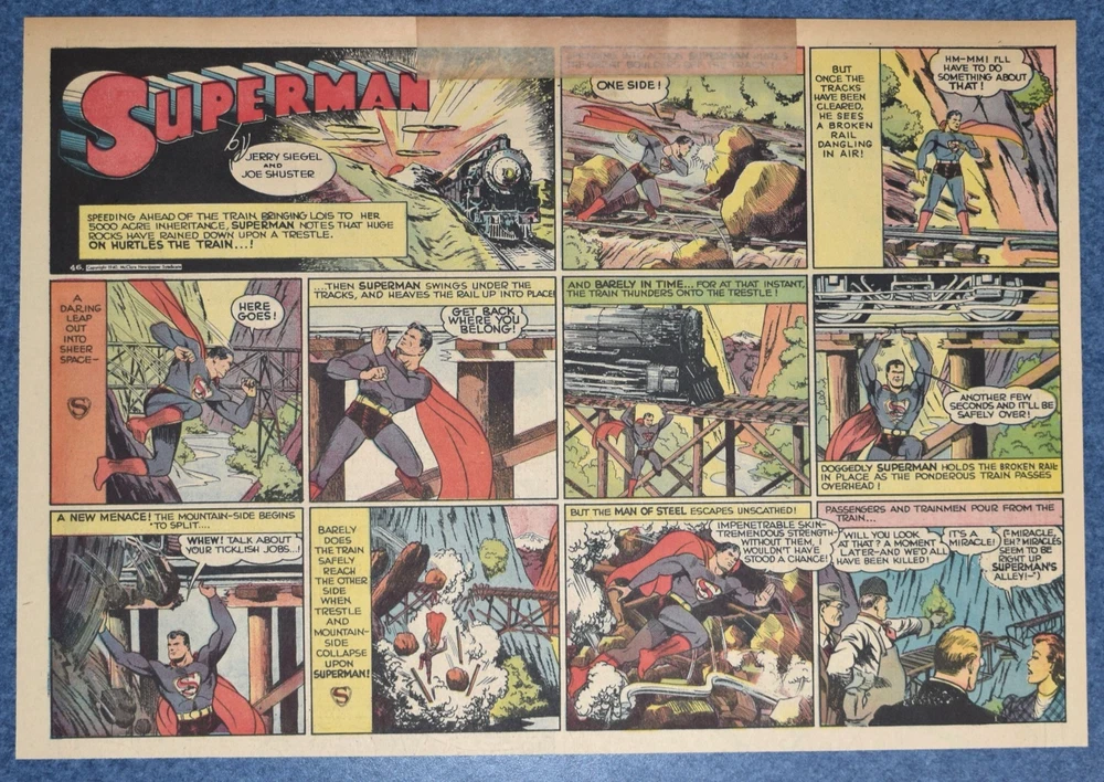 SUPERMAN Jerry Siegel and Joe Shuster 1940 D escription Year: 1940 (#27 through 61...starting in May) Count: 35 Sunday Comics Newspaper: The Kansas City Star Size: Approximately 1/2 of a page in size. The exact size varies depending on the margin, but the cut sheets are approximately 36.5 x 24.9 cm including margins, or about 14.4 x 9.8 inches. In general, the height varies a fair bit (size provided is a smaller estimate). 1940 D ATES P RESENT Month Date Contents of Reverse Side and/or Notes May 5 Winnie Winkle (1/3 pg) 12 Bringing Up Father (1/2 pg) 19 Partial comics 26 Rosie's Beau (topper) Jun 2 Bringing Up Father (1/2 pg) 9 Gasoline Alley (1/2 pg) 16 Partial comic and partial ad 23 Partial comic and partial ad 30 Partial comics Jul 7 Partial comic and Herby (footer strip comic) 14 Sappo and Wimpy's Zoo's Who! (1/3 pg) 21 Gasoline Alley (1/2 pg) 28 Bringing Up Father (1/2 pg) Aug 4 Rosie's Beau (topper) 11 Bringing Up Father (1/2 pg) 18 Rosie's Beau (topper) 25 Bringing Up Father (1/2 pg) Sep 1 Moon Mullins (1/2 pg) 8 Moon Mullins (1/2 pg) 15 Dick Tracy (1/2 pg) 22 Rosie's Beau (topper) 29 Partial comic Oct 6 Partial comic and partial ad 13 Gasoline Alley (1/2 pg) 20 Partial comic 27 Smitty (1/3 pg) Nov 3 Aunt Min and Tillie the Toiler Fashion Parade Paper Dolls (1/3 pg) 10 Gasoline Alley (1/2 pg) 17 Popeye (1/2 pg) 24 Bringing Up Father (1/2 pg) Dec 1 Partial comic 8 Moon Mullins (1/2 pg) 15 Partial comic and partial ad 22 Partial comic 29 Smitty (1/3 pg) Dates Highlighted in Blue Present C ondition Here are some general condition notes for this set of comics: There are a few small tears around the edges in the margins (larger tears are mentioned below). These comics are old and tanned, but can be handled with ease. Some dates, and/or edges, might be more tanned than others. Condition notes are predominately focused on the comic on the front side (comic featured for the auction). The color register is sometimes off a bit, but the printing generally pretty really good with these comics (nice color). Examine the photos to see how the comics look. Some dates have some slight ink transfer, but this is normally pretty minor. We also observed light ink bleed-through...this was more common (did not note every case...many dates have at least a little of this condition) . The date in normally written in the margin of the reverse side (either front or back side). We also made some notes of some date specific issues (we tried to avoid making too many notes, and instead preferred to go the generalized condition notes above). This should serve as a guide to the condition of the set, it is possible that we have not caught everything: INDIVIDUAL DATE CONDITION NOTES 5-5 (#27) The color register is off a tiny bit. 5-12 (#28) Some light ink transfer and/or bleed-through. The color register is also off a little bit. 5-19 (#29) The color register is off a tiny bit. 6-16 (#33) Some light ink transfer and/or bleed-through. 6-23 (#34) The color register appears to be off a tiny bit. 6-30 (#35) Small interior tear at the centerfold line (perpendicular...about 0.9 cm). 7-14 (#37) Some light ink transfer and/or bleed-through and there is some really light ink transfer. 7-21 (#38) The color register is off some ( see photo ). There is also some light ink transfer. 7-28 (#39) Some light ink transfer and/or bleed-through. There is also a 1 cm tear, approximately, on the bottom (mostly the margin). 8-11 (#41) Some light ink transfer and/or bleed-through. 8-18 (#42) Some light ink transfer and/or bleed-through. One panel seems to have some text that was covered up and/or not printed ( see photo ). 9-1 (#44) Some light ink transfer and/or bleed-through. 9-8 (#45) The color register is off slightly. 9-15 (#46) Large taped repair on the top front side with old brown dried out tape ( see photo ). 9-29 (#48) The color register is off a tiny bit. 10-6 (#49) The color register is off a little bit. 10-13 (#50) The color register is off a tiny bit. 10-27 (#52) The color register is off a tiny bit. 11-3 (#53) The color register is off a tiny bit. 11-24 (#56) The color register is off a little ( see photo ). 12-1 (#57) Multiple small tears. Two go slightly into the comic (less than one inch each) and one goes right to the edge of the comic. 12-8 (#58) Some light ink transfer and/or bleed-through. 12-15 (#59) Some light ink transfer and/or bleed-through. There is also a little moderate ink transfer near the centerfold line. 12-22 (#60) There is some light ink transfer across the comic. 12-29 (#61) There is some light to somewhat moderate ink transfer ( see photo ). The color register is also off a tiny bit. S hipping Shipping cost is dependent on weight, and this comic weighs 13 ounces . If more then one item is purchased we will combine shipping and recalculate the shipping cost. Items typically ship within 3-4 days (often even faster). C ombined S hipping This item may typically be combined with other newspaper comic strips, but this will not happen automatically at checkout (combined shipping has to be estimated). This can also be handled after checkout. Shipping cost on combined orders will depend on the size and weight of the package. This item will be shipped from ARIZONA .