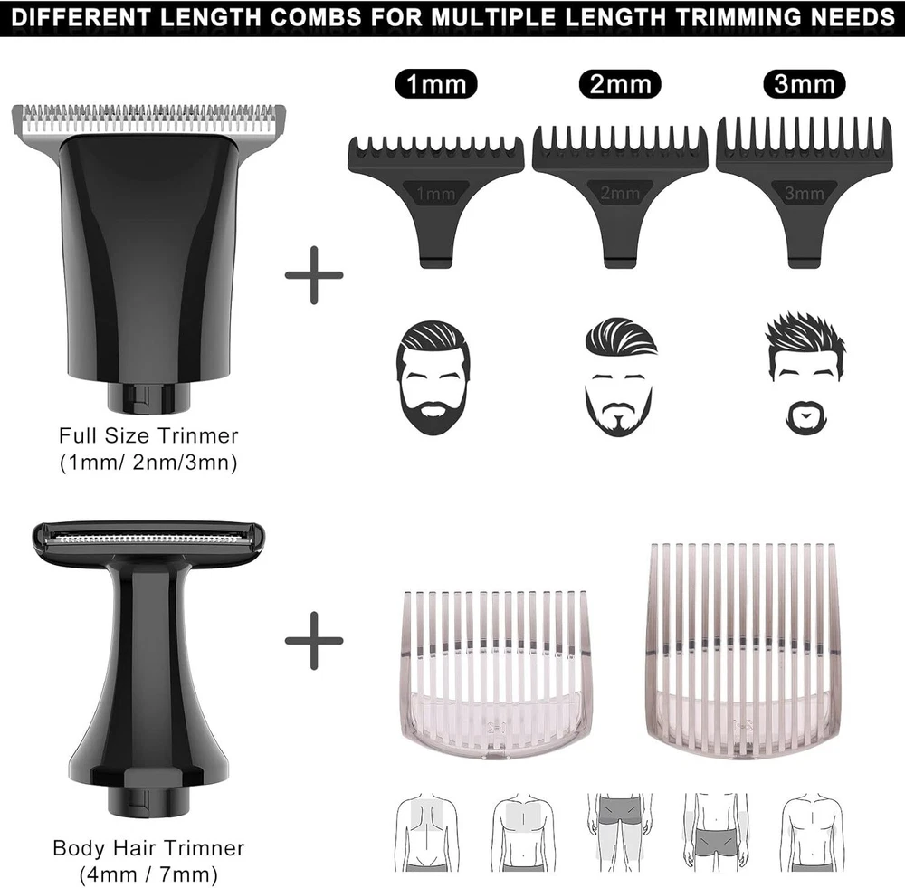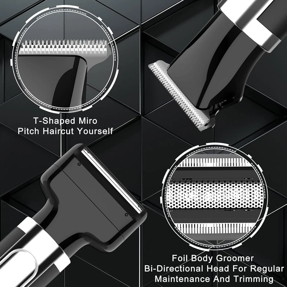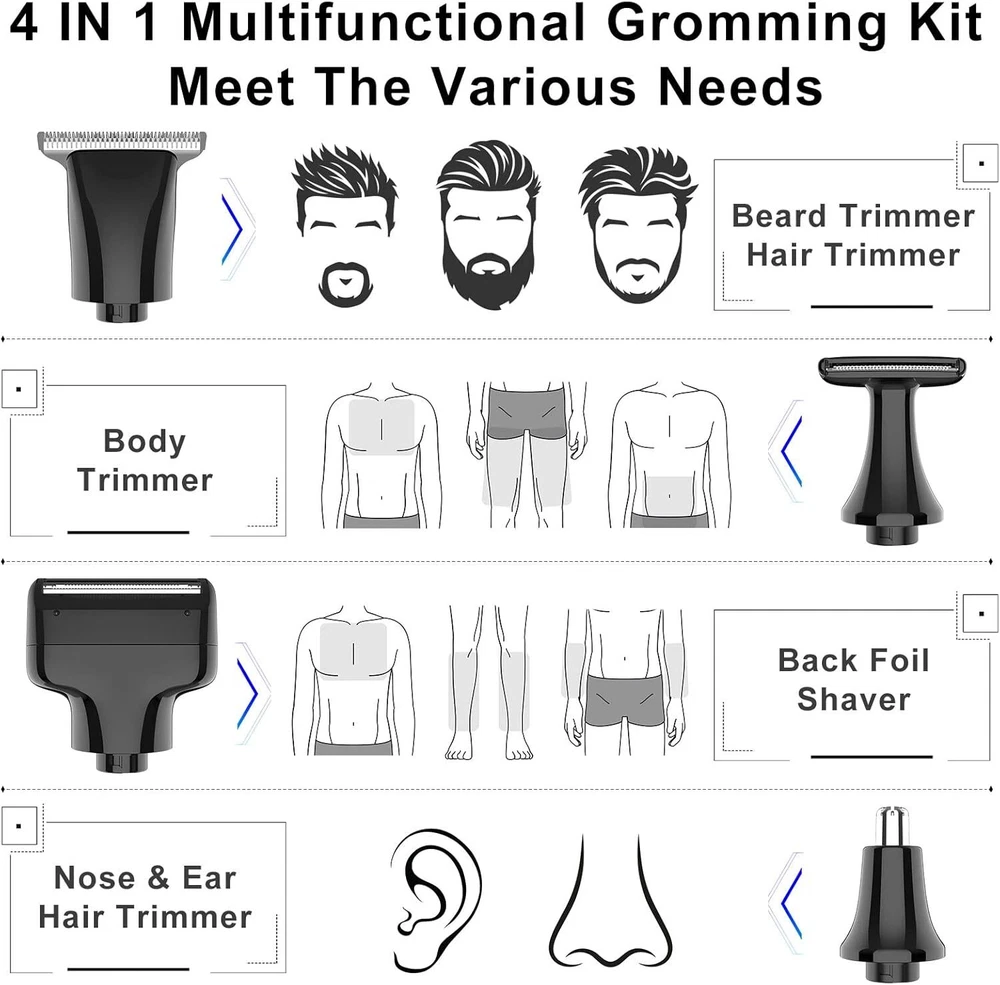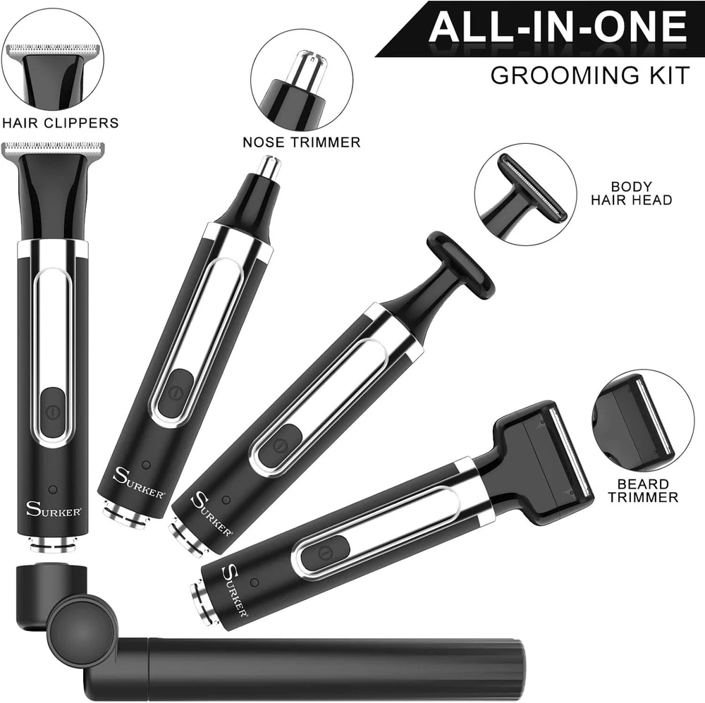 SURKER Body Trimmer Mens Electric Back Shaver Grooming kit Black Product Details Package Dimensions : 9.69 x 6.18 x 2.05 inches; 1.01 Pounds Item model number : RSCX9611 Batteries : 1 AAA batteries required. Manufacturer : SURKER Country of Origin : China Recommended Uses For Product: trimming, shaving Color: Black Hair Type: All Brand: SURKER Power Source: Battery Powered 【Versatile USE】This groomer/shaver kit includes 4 detachable heads:T-blade haircut trimmer head/nose trimmer head/body trimmer head/combination shaving head. Designed for not only for facial trimmings but also for below-the-waist grooming, like back shaving ,arms,legs,body hair.T-balde trimmer equipped 3 guide combs(1/2/3mm),dealing with the haircut,beard trimming,sideburns,precise trimming. 【Adjustable Extension Arm】Detachable extension assist arms with 180°Adjustable Angle design -Allowing you to reach even the most difficult middle and lower back areas when shaving back hair.Auxiliary arm function enables you to reach all areas of your back by yourself with ease and shave off all your back hair effortlessly. 【Two Speed Adjustable】Adjust the high and low speed according to the density of body hair.Powerful motor make every single pass remove hair with no snagging, providing an effective haircut for you. 【Battery Reminder &Travel Lock】Smart charging light indicates when the trimmer need to be charged / cleaned ; lights also shows lock/unlock state.Tracl- Lockg function(hold the on/off button for 2 seconds ) to avoid accidentally touching the switch, travel with convenient to carry.This machine should be charged through the base.Built-in rechargeable battery delivers up to 60-120 minutes of run time per charge by only about 1.5 hours charging. 【100% Waterproof&Cordless】Full body Waterproof Design & One-button ON/OFF Switch meet the waterproof function. You can rinse directly under the tap for easier cleaning.Cordless design combinated the ergonomic design gives a solid performance in both durability and comfort. 【Guidelines for use】Avoid prolonged discharging, the machine will automatically shut down every fifteen minutes of work, please wait for one minute before you can switch on the machine again.To maintain battery life, please charge and discharge the battery once every 1-2 months when the machine is not in use. For the beard trimmer blade:Please change the direction of the cutter head to match the use of the extension arm. Red Light Flash:In addition to the case where the machine is out of battery, the machine lock status will also flash red. Please press and hold the switch to unlock the machine.