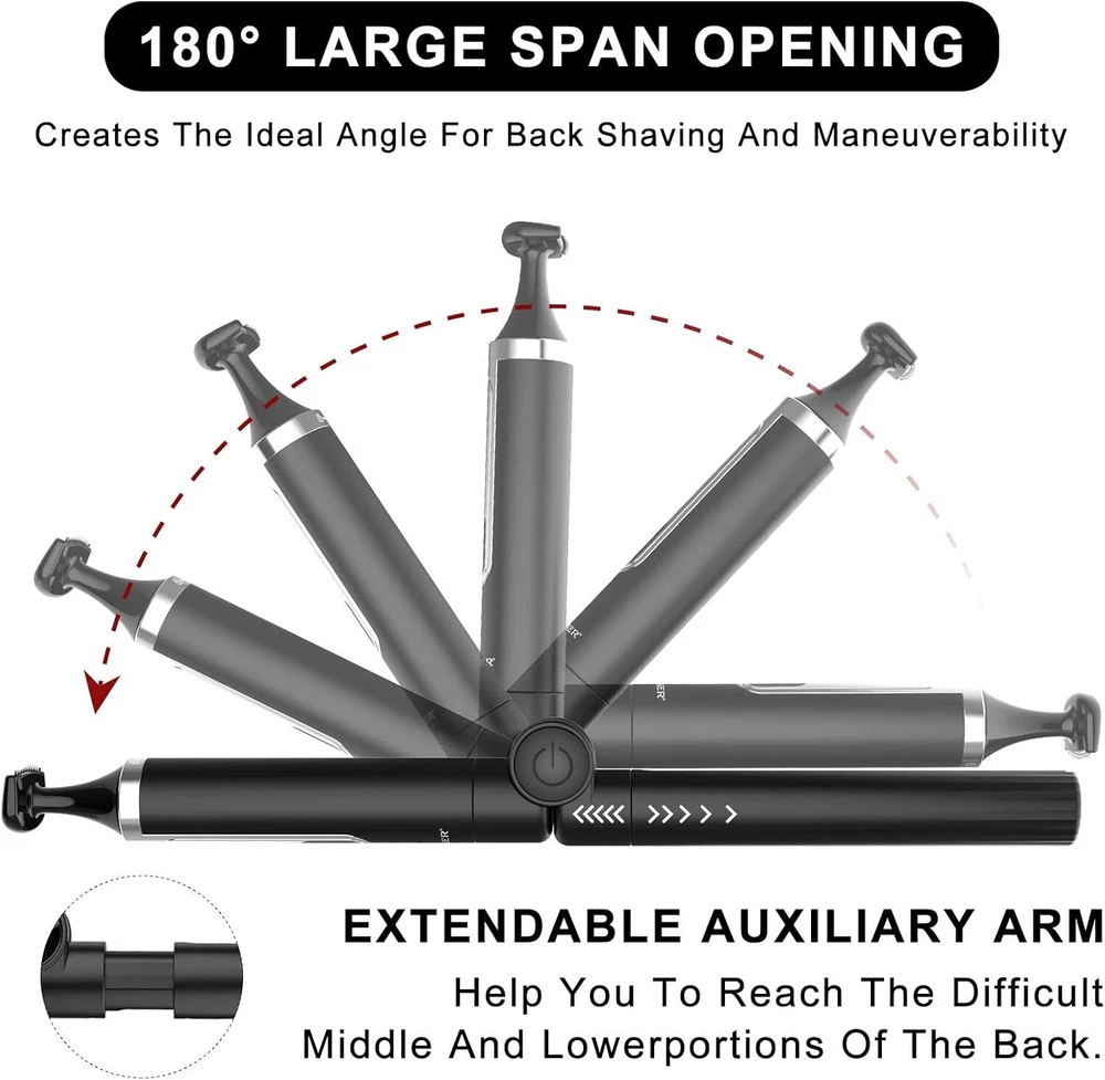 SURKER Body Trimmer Mens Electric Back Shaver Grooming kit Black Product Details Package Dimensions : 9.69 x 6.18 x 2.05 inches; 1.01 Pounds Item model number : RSCX9611 Batteries : 1 AAA batteries required. Manufacturer : SURKER Country of Origin : China Recommended Uses For Product: trimming, shaving Color: Black Hair Type: All Item Weight: 0.46 Kilograms Brand: SURKER 【Versatile USE】This groomer/shaver kit includes 4 detachable heads:T-blade haircut trimmer head/nose trimmer head/body trimmer head/combination shaving head. Designed for not only for facial trimmings but also for below-the-waist grooming, like back shaving ,arms,legs,body hair.T-balde trimmer equipped 3 guide combs(1/2/3mm),dealing with the haircut,beard trimming,sideburns,precise trimming. 【Adjustable Extension Arm】Detachable extension assist arms with 180°Adjustable Angle design -Allowing you to reach even the most difficult middle and lower back areas when shaving back hair.Auxiliary arm function enables you to reach all areas of your back by yourself with ease and shave off all your back hair effortlessly. 【Two Speed Adjustable】Adjust the high and low speed according to the density of body hair.Powerful motor make every single pass remove hair with no snagging, providing an effective haircut for you. 【Battery Reminder &Travel Lock】Smart charging light indicates when the trimmer need to be charged / cleaned ; lights also shows lock/unlock state.Tracl- Lockg function(hold the on/off button for 2 seconds ) to avoid accidentally touching the switch, travel with convenient to carry.This machine should be charged through the base.Built-in rechargeable battery delivers up to 60-120 minutes of run time per charge by only about 1.5 hours charging. 【100% Waterproof&Cordless】Full body Waterproof Design & One-button ON/OFF Switch meet the waterproof function. You can rinse directly under the tap for easier cleaning.Cordless design combinated the ergonomic design gives a solid performance in both durability and comfort. 【Guidelines for use】Avoid prolonged discharging, the machine will automatically shut down every fifteen minutes of work, please wait for one minute before you can switch on the machine again.To maintain battery life, please charge and discharge the battery once every 1-2 months when the machine is not in use. For the beard trimmer blade:Please change the direction of the cutter head to match the use of the extension arm. Red Light Flash:In addition to the case where the machine is out of battery, the machine lock status will also flash red. Please press and hold the switch to unlock the machine.