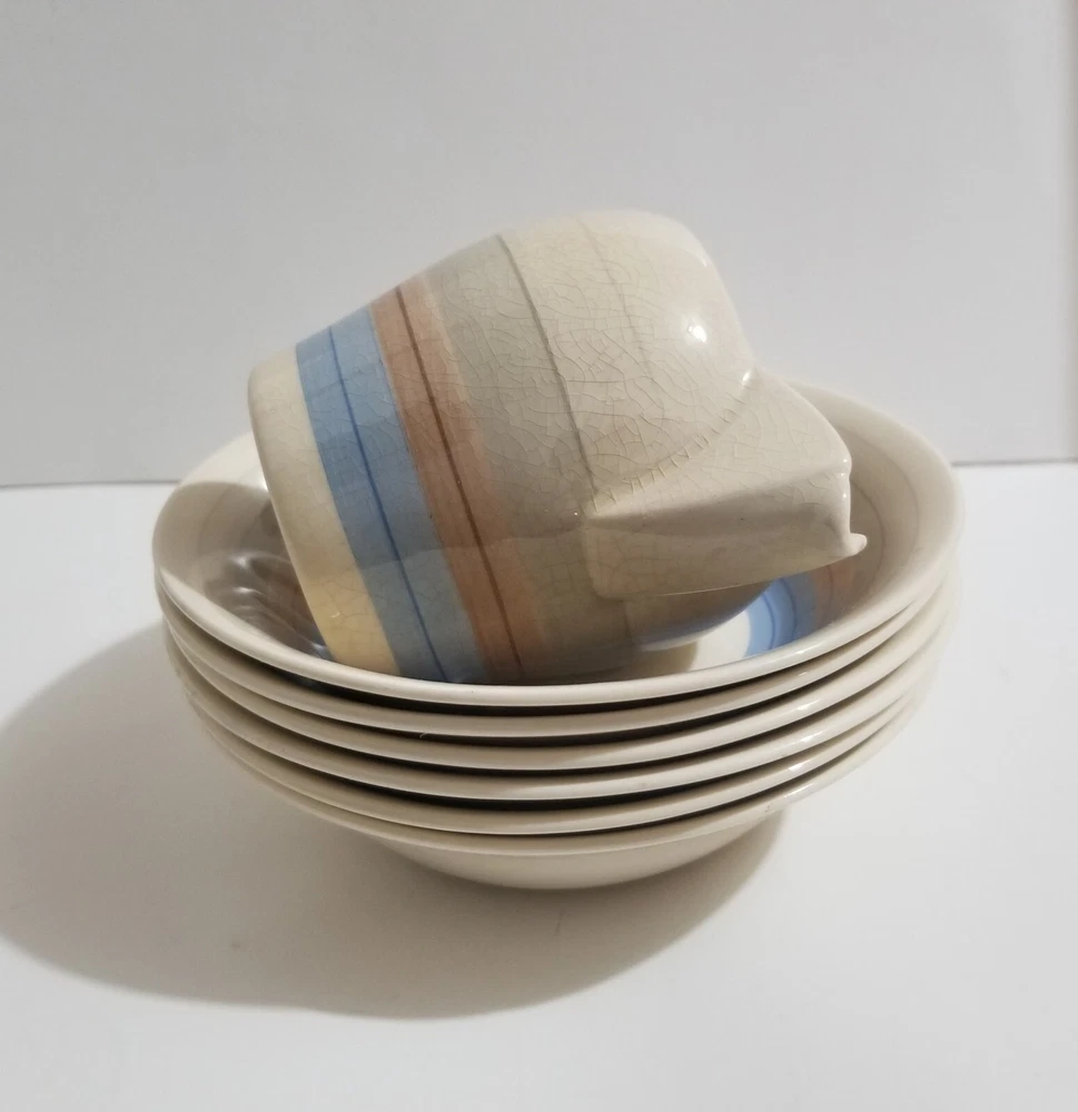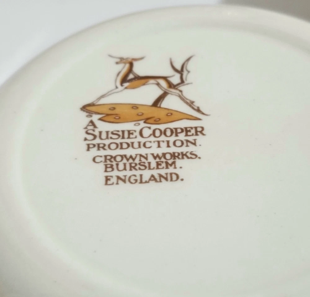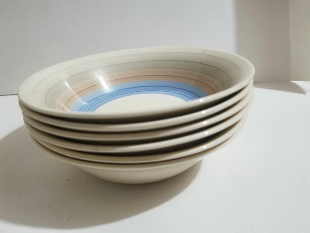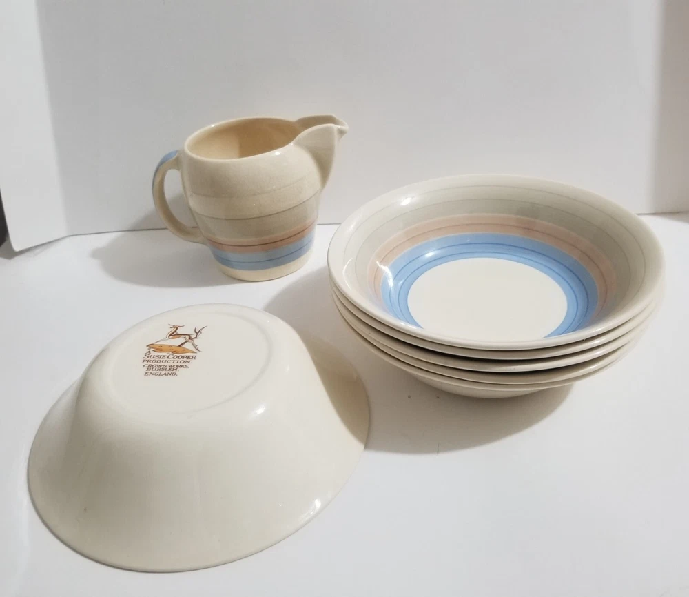 MADE IN ENGLAND A Susie Cooper Production Wedding Bands Set of 6 CEREAL BOWLS each measures approx. 6 inches diameter VERY Nice condition, PERFECT condition, CLASSIC ART DECO PERIOD PRODUCTION CROWN WORKS. BURSLEM. ENGLAND. Buy Now at 64.99 or make an offer BONUS: 3 1/4" Cream Jug ( added as an extra ) Winning bidder pays shipping charges as selected ( $33.99 TRACKED packet airmail OR SIMILAR to USA destinations, regular tracked domestic OR SIMILAR to Canadian destinations ) Other options may be available upon agreement prior to payment. ( tracking optional at extra fees ) Buying and selling on eBay for OVER 23 years now. Very honest and experienced. Only Quality merchandise with clear photos as deemed appropriate, additional photos can be added if needed. overseas tracked international airmail @ $33.99 PLUS THE COST TO ADD TRACKING SO PLEASE CONTACT BEFORE BIDDING/BUYING FOR RATES TO YOUR DESTINATION i YES, I do combine shipping charges tracking is required