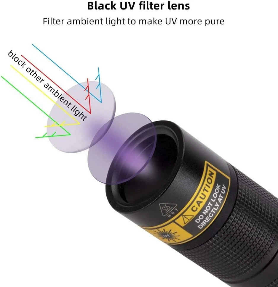 Neighborhood service SV005 10W LED 365Nm UV Flashlight Blacklight Portable USB Rechargeable Black Light Full Metal Case Pet Urine Detector with UV Protective Glasses, Battery Included for Resin Curing ENJOY THE FEATURES 【Powerful 365NM UV LED】Uses high-quality 365NM UV LED as light source, up to 10W power consumption and 2400mW luminous power, which make it become professional ultraviolet flashlight for professional use 【Black Filter Lens】Equipped with hard toughened black filter optical lens that can filter out foreign light from the environment, very little visible light, which makes the ultraviolet light purer 【Full Metal Body Case】The body case uses high-quality aluminum alloy, which greatly enhanced its heat dissipation performance, this makes flashlights more reliable and durable 【USB Rechargeable】Compared with the SV003, the SV005 supports USB direct charging, you can charge it from computer, power bank, car or power adapter, no additional charger required, it's very easy and convenient. high-capacity rechargeable battery included 【UV Protective Glasses】Our UV flashlight is very powerful, please do not shine into your eyes when using it. We have prepared UV protective glasses for you, and it is recommended to use UV flashlight with this Product Description Specifications: Light bulb: 365NM UV LED Purple light wavelength: 365NM Purple light power consumption: 10W Purple light luminous power: 2400mW Mode: 1 mode (off - on) (Charging Requirement: 5V-1A) Quality 365nm UV LED Uses high-quality 365NM UV LED source rather than the diode lamp, up to 10W power consumption and 2400mW luminous power, which make it become professional ultraviolet flashlight for some professional use. Hard Toughened Black Filter Optical Lens Equipped with hard toughened black filter optical lens that can filter out foreign light from the environment, which makes the ultraviolet light purer Pet Urine Detector: The UV can reveal the stains or fluids which are invisible to the naked eyes on the floor or even grass. such as detecting counterfeit documents, money verification, amber and jewelry detection, pet urine and stain detection In the dark environment UV lamp detection effect is more obvious and easy to distinguish. Tips: the included battery only can make the flashlight work at 6.6W, you can use more powerful power for it to get it works at 10W. To achieve the full 10W, use a higher 3.7v Rechargeable Battery to achieve better UV lighting results. Full metal body case enhance heat dissipation The case uses high-quality aluminum alloy, which greatly enhanced its heat dissipation performance, this makes flashlights more reliable and durable Tips: 10W power is so powerful, so it will produce more heat than common UV flashlight, this is a normal phenomenon. Important: As time goes on, the heat will become very serious. In order to protect the lamp bead, the flashlight is designed to reduce its power to 60%~70% of the rated power after 3 minutes of use. USB Rechargeable Compared with the SV003 UV flashlight, the biggest highlight of the SV005 is the addition of USB charging. Battery Polarity : The positive (+) ends of the battery goes at the front (nearest to the bulb), and the negative (-) ends at the back of the torch. The charging port is Type-C USB, compare with the micro USB, the Type-C port is reversible, any way you plug in is the right way. It's convenient for daily use and not easy to damage the port. There is a charging indicator that tells you when the battery will be fully charged. Charging Indicator (Charging Requirement: 5V-1A) Red: Charging Blue: Fully charged Tips : When the flashlight battery is too low (the light is dim), it is recommended that you charge it in time to avoid damage to the battery caused by over-discharge. Features: Dimension: Portable and compact body, it's very easy to carry and use Weight: 69g(2.4 OZ) Dimensions: 122 x 24 x 24 mm (4.8x0.9x0.9 inches) USB Charging You can charge the uv light from computer, power bank, car or power adapter, it's very easy and convenient, but please keep in mind that the package doesn't include power adapter. Package Content: 1 x 365NM UV Flashlight 1 x UV Protective Glasses 1 x USB Cable 1 x Rechargeable Battery 1 x Hand Strap ( Tips : Please remove the Transparent insulating film (if any) on the surface of the battery before first use.) Application Item model number SV005_10W Light Source Type LED Power Source Battery Powered Battery Cell Composition Lithium Ion Batteries Included? Yes Battery Description Lithium-Ion Batteries Required? Yes Material Aluminum Number of Batteries 1 Lithium Ion batteries required. (included) Package Dimensions 6.81 x 3.15 x 1.69 inches Included Components Battery Light Source Wattage 10 Watts Brightness 2400 millicandela Item Weight 5.9 ounces Special Features High Power, Rechargeable Special Feature High Power, Rechargeable Part Number SV005_10W Color Black Wattage 10 Watts Batteries 1 Lithium Ion batteries required. (included) Recommended Uses For Product Pet urine detection, resin curing 3.15 inches x 6.81 inches x 1.69 inches. Weight: 5.9 oz PAYMENT We accept all payments via Ebay using Credit Cards , PAYPAL , Apple Pay and many others SHIPPING We are always working hard to ensure your package arrives as soon as possible. Please understand that some factors like weather, high postal traffic, and the performance of shipping companies are outside of our control. We offer free shipping to the lower 48 states and ship within 3-5 business days of payment, usually sooner. We do not accept P.O. Boxes. Please provide a physical address. We do not ship internationally at this time. DELIVERY & RETURN POLICY We do not offer returns unless the item violates eBay policies. Please be aware these polices only make sellers accept returns if the item violates eBay's Buyer Guarantee. If you would like to learn more about this please visit eBay's Help Page. Thank you for your business