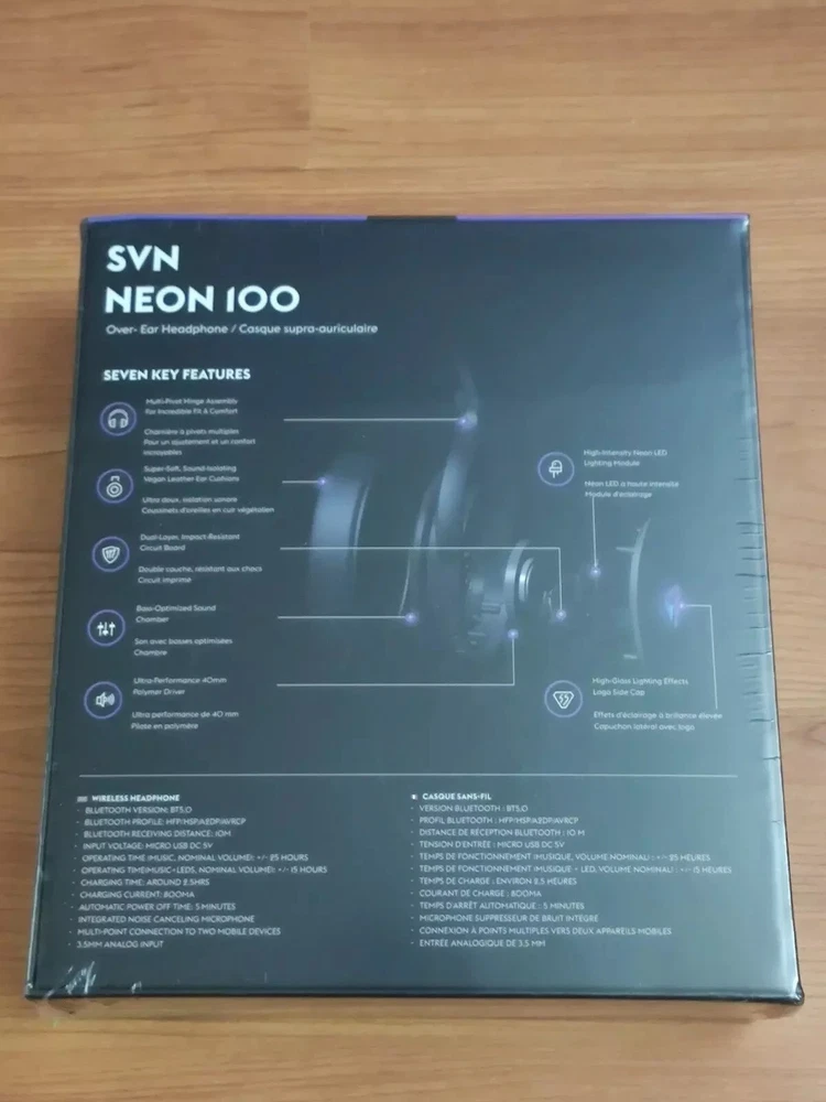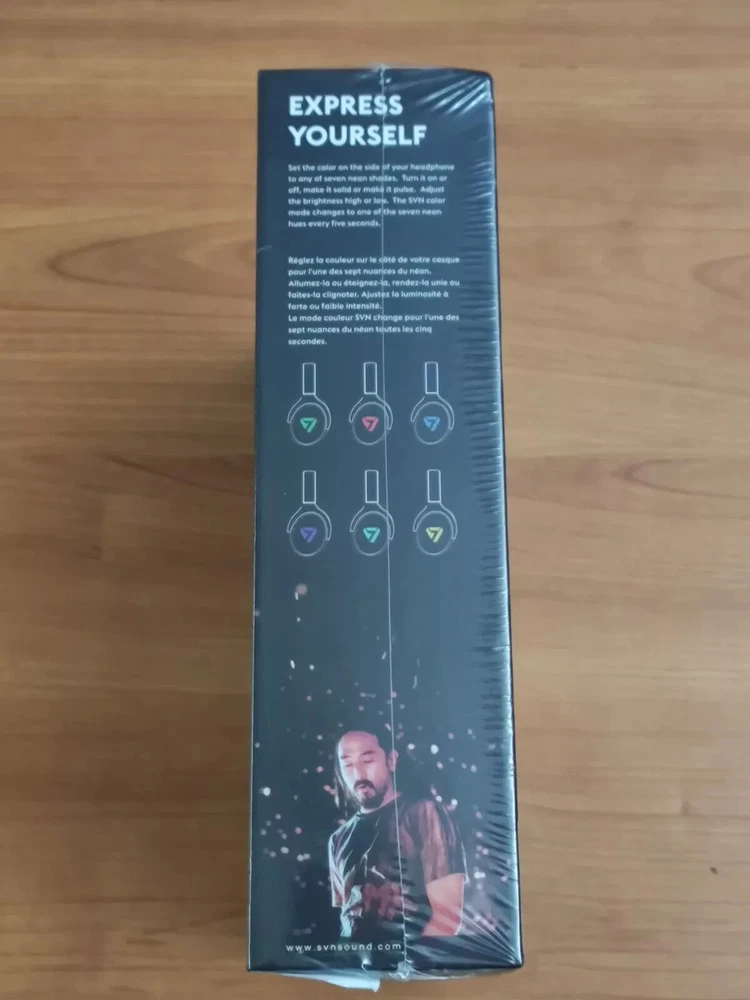 SVN Sound by Steve Aoki Color Changing Neon 100 Premium Over-Ear Noise Cancelling Bluetooth Headphones Brand: SVN Sound Model name: NEON 100 Color: Black Connectivity: Bluetooth SVN Steve Aoki NEON 100 Wireless Headphones Experience Music and Express Yourself SVN pairs up with DJ Legend Steve Aoki to create unique headphones. The NEON 100 Bluetooth headset not only can you experience your music as if you are in the same room as your favorite artist, but you can also create a space to express yourself through the LED light. New Music Experience Dynamic 40mm drivers and advanced sound chamber design provide dynamic punching power and crystal clear sound that feels like you're with an artist. Moving Over-ear design and up to 25 hours of playtime Lightweight and durable polycarbonate construction and soft ear cups won't cause ear fatigue. In addition to each pair, the hard carry case, the 3.5mm jack cable supports both wired & wireless. Dynamic LED Light With intuitive controls you can choose from 7 attractive light variations to show yourself in the coolest way wherever you are. Package Includes: NEON 100 Wireless Headphones ✅ Hard Carrying Case ✅ 3.5mm jack ✅ User Manual Experience music and express yourself with the NEON 100 Steve Aoki Wireless Headphones.