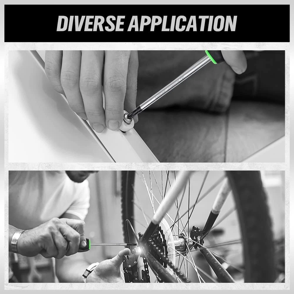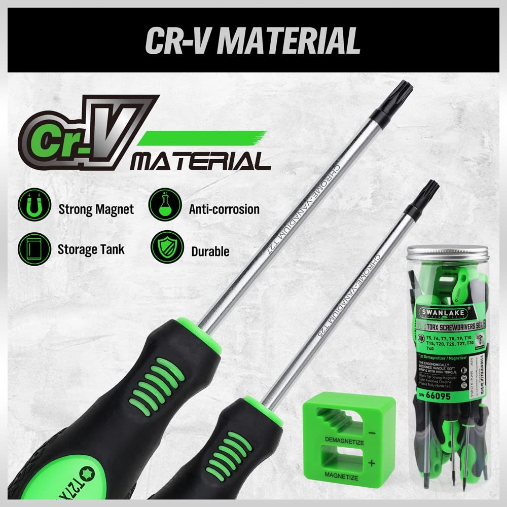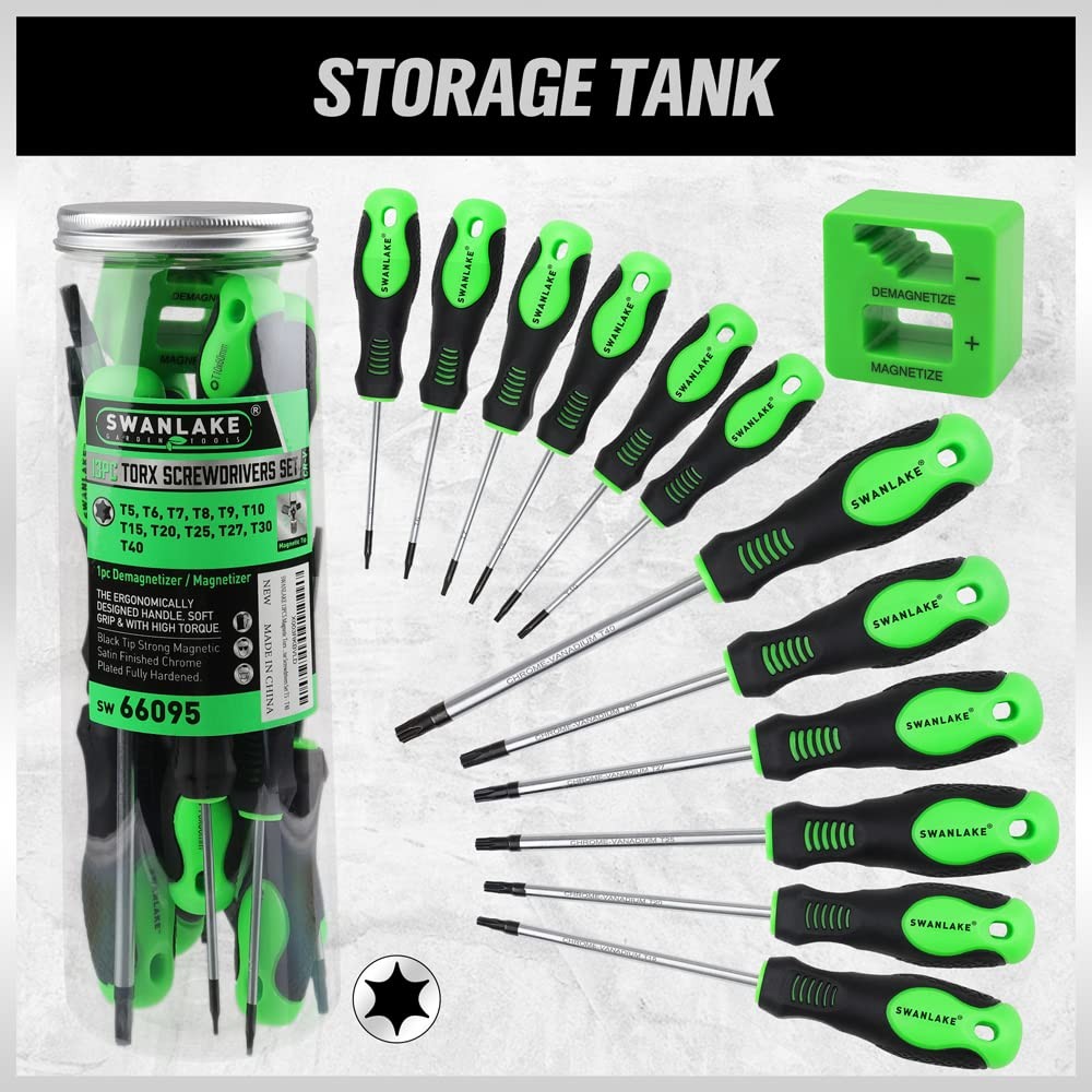 13PCS Magnetic Torx Screwdrivers Set, Magnetic Torx Driver Star Screwdrivers Set T5 - T40 Made of Chrome vanadium steel with heat treatment,high hardness, large torque, long service life. Cushion grip handle for comfort and control,With ergonomic TPR handle and button on it, it helps you to use easily. Black finish blade with magnetic tips which could conveniently attracts screws. Set Includes: T5 x2-1/2", T6 x2-1/2", T7 x 2-1/2", T8 x 2-1/2", T9 x 2-1/2", T10 x 2-1/2", T15 x 4", T20 x 4", T25 x 4", T27 x 4", T30 x 4", T40 x 5"and a magnetic retriever . Widely used for maintenance and assembly of all kinds of mechanical equipment ,domestic appliances and furniture.