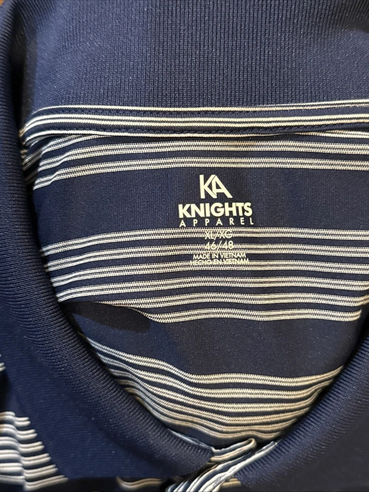 You are purchasing a BEAUTIFUL Illinois Fighting Illini short sleeved Polo style dress shirt. Shirt is an adult size X-large 46-48. Shirt is dark blue in color with white striping. Shirt has beautifully embroidered Illinois I logo on front left chest. Fighting Illini is embroidered on left sleeve as shown. No markings on back side of shirt or on sleeves. 3-button up front. Lapel collar. Shirt is 100% light weight polyester material. Made by KA Inc/Knights Apparel. Shirt is new, never worn condition, no tags. BEAUTIFUL shirt for any Illini fan! Buyer pays $5.00 shipping. Shipping combined on multiple lots whenever possible. Thanks for your business! Please check out my Ebay store for more great items!
