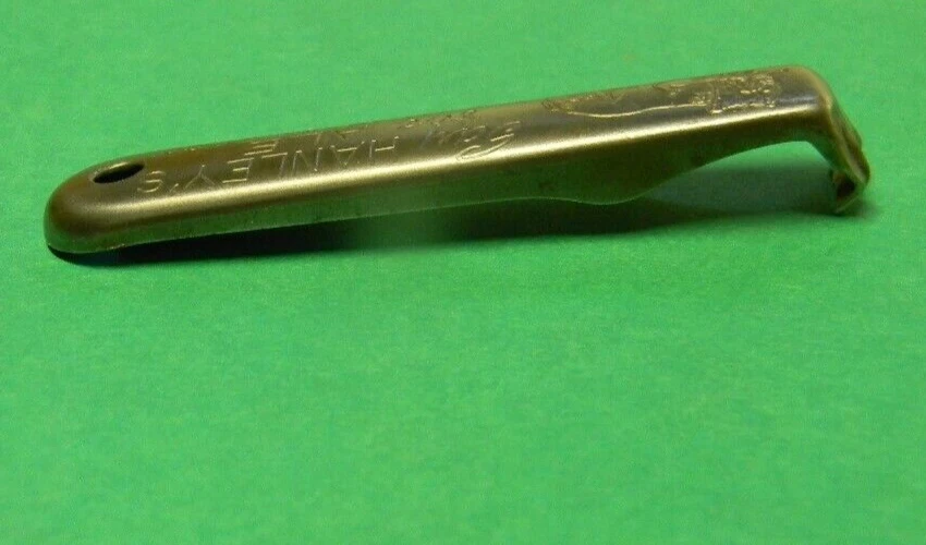 This vintage Hanley's Ale bulldog bottle opener is a must-have for any beer enthusiast or collector of breweriana. Made in the United States, this opener is a unique piece that features the iconic Hanley's brand and dog logo. Its sleek design and durable construction make it a reliable choice for opening all types of bottles. Perfect for adding to a collection or using at a party, this opener is a great conversation starter. Its compact size and lightweight design make it easy to carry around. Whether you're a fan of Hanley's Ale or just love collecting vintage breweriana, this opener is a great addition to any collection. Measures 3 3/8" long. NICE CONDITION! WOW!