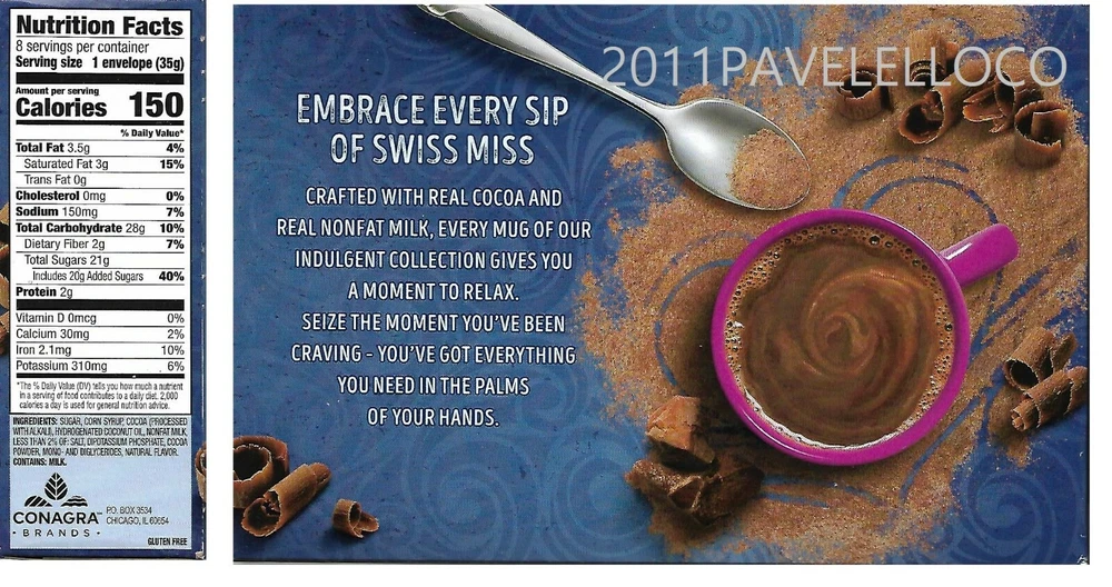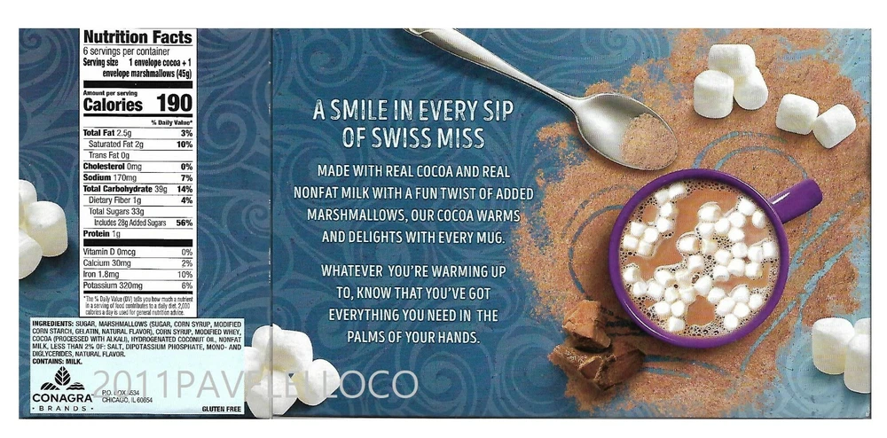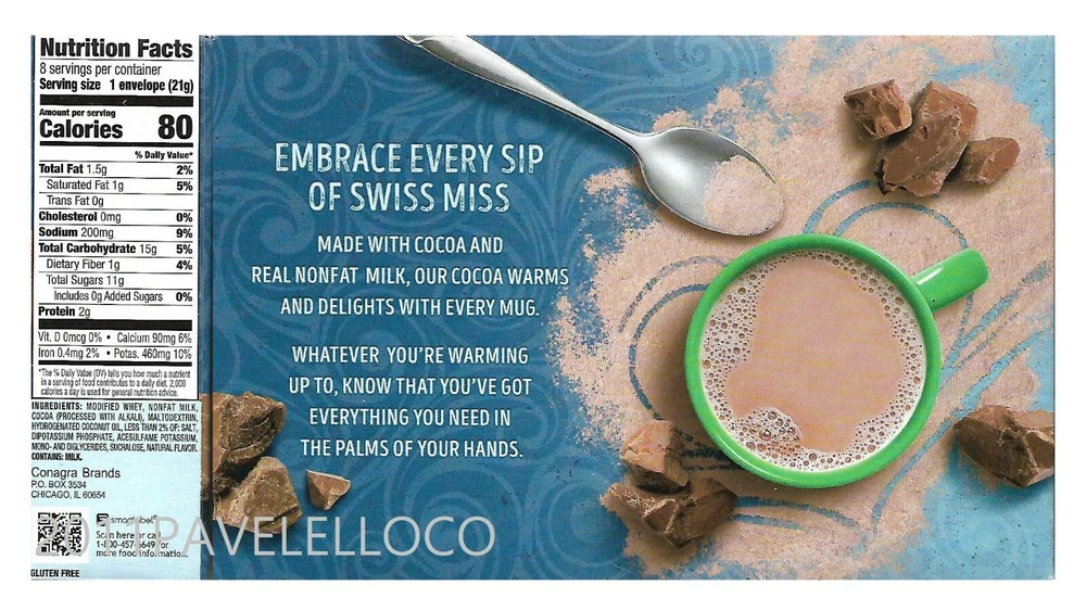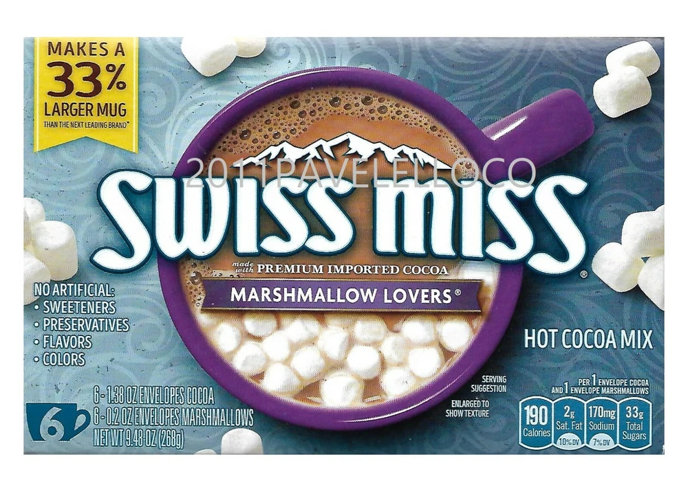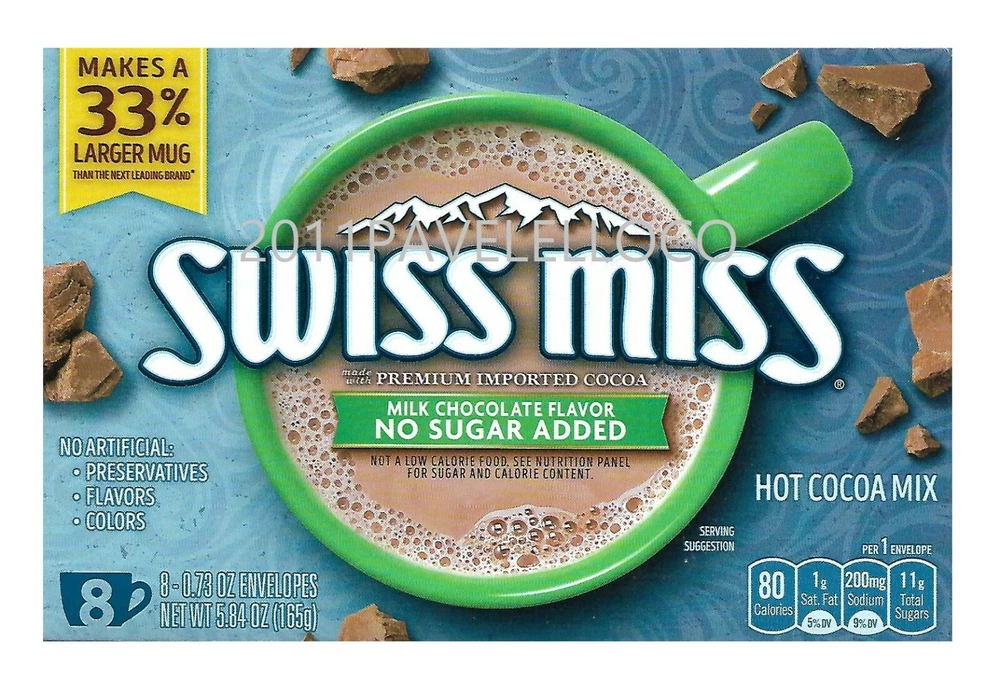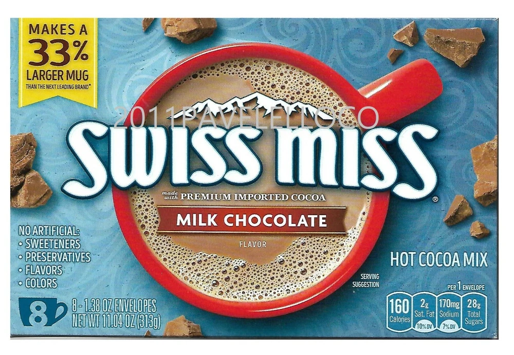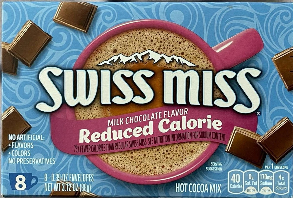 Swiss Miss Chocolate Flavor Hot Cocoa Mix is the creamy and warm beverage that delights kids and adults alike. Whatever you're warming up to, know that you've got everything you need in the palms of your hand. With no artificial sweeteners, preservatives, flavors, or colors, this delicious drink will warm and delight with every mug.. For more than 50 years, Swiss Miss has been creating its signature blends in a real dairy in Menomonie, Wisconsin. Packaged here in the USA starting with farm-fresh milk, every cup of Swiss Miss has real, wholesome taste in every sip. Specifications Made with real cocoa and real nonfat milk, our comforting cocoa mix will give you the chocolatey taste you crave Swiss Miss Chocolate Flavor Hot Cocoa Mix is the creamy and warm beverage that delights kids and adults alike Swiss Miss Chocolate Flavor Hot Cocoa Mix es la bebida cremosa y cálida que deleita a niños y adultos por igual. Independientemente de lo que esté calentando, sepa que tiene todo lo que necesita en la palma de su mano. Sin edulcorantes, conservantes, sabores ni colores artificiales, esta deliciosa bebida calentará y deleitará con cada taza. Durante más de 50 años, Swiss Miss ha estado creando sus mezclas exclusivas en una verdadera lechería en Menomonie, Wisconsin. Empaquetado aquí en los EE. UU. Comenzando con leche fresca de la granja, cada taza de Swiss Miss tiene un sabor real y saludable en cada sorbo. Especificaciones Fabricada con cacao real y leche descremada real, nuestra reconfortante mezcla de cacao le dará el sabor a chocolate que anhela Swiss Miss Chocolate Flavor Hot Cocoa Mix es la bebida cremosa y cálida que deleita a niños y adultos por igual FREE AND FAST SHIPPING IN TOWN