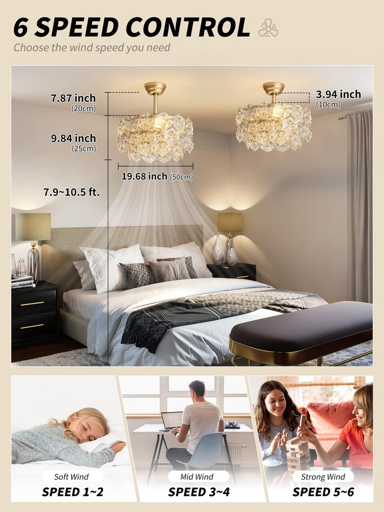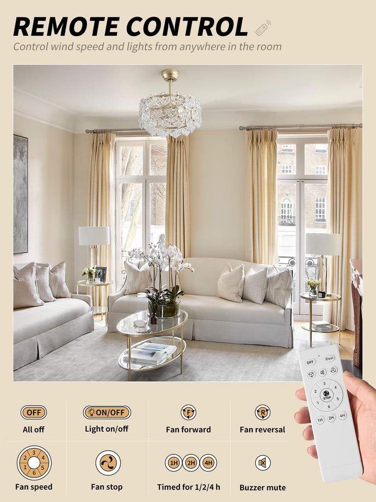 Installation Tips: If you encounter any broken glass components while installing your Gold Crystal Ceiling Fan with Lights. We will promptly send you the replacement parts! Patented Crystal Design: Say goodbye to those clunky, old-fashioned ceiling fans and welcome a whimsical upgrade with our enclosed gold crystal fandelier ceiling fan with light. This caged fancy Chandelier ceiling fan not only adds a touch of modern elegance and efficient air circulation, but it also gives your room a dose of dreamy relaxation. Perfect for all the free-spirited crystal enthusiasts out there, because who says air circulation can't be stylish and fun? Personalized Comfort: Our gold crystal fandelier ceiling fan with light is all about giving you the perfect ambiance. With separate fan speed and light adjustments, you can create a breeze that's just right for you. And guess what? It operates so quietly that you can even have a whispered conversation with your thoughts. Plus, with the included remote control, you can effortlessly control the fan and lighting settings without even leaving your cozy spot on the couch. Ambient Lighting: Let's set the stage for some magic! Our enclosed gold crystal Chandelier ceiling fan with lights allows you to create a play of light and shadow that's straight out of a fairy tale. With four light sources, you can adjust the brightness to fit your every mood and activity, whether it's reading, daydreaming, or hosting a crystal dance party. It's like having your own personal lighting designer, except without the hefty price tag. Tranquil Nights: Say goodbye to those noisy nightmares! Our caged gold crystal fandelier ceiling fan with light and remote control operates as silently as a sleeping cat, creating a peaceful atmosphere for you to drift away into dreamland. And if you're worried about forgetting to turn it off, don't be! The convenient timer function lets you schedule automatic shut-off, so you can snooze away without a care in the world. Effortless Installation, Flexible Placement: We know you're not a fan of complicated installations (pun intended), so we've made it super easy for you. Our gold fancy ceiling fan with light comes pre-assembled and can be installed on any type of ceiling, from low to high. It's like a DIY project without the stress. So go ahead, choose your favorite corner of the house and let our fan do its stylish magic. Crystal Customer Love: We're not just a fan company, we're a family. That's why we offer a 1-year worry-free warranty and round-the-clock customer support. We're here to make sure you have the most crystal-tastic experience ever, from the moment you Choose it to the day your fan starts spinning. So join the tribe and let our caged gold crystal fancy Chandelier ceiling fan with light bring modern bliss to your life.