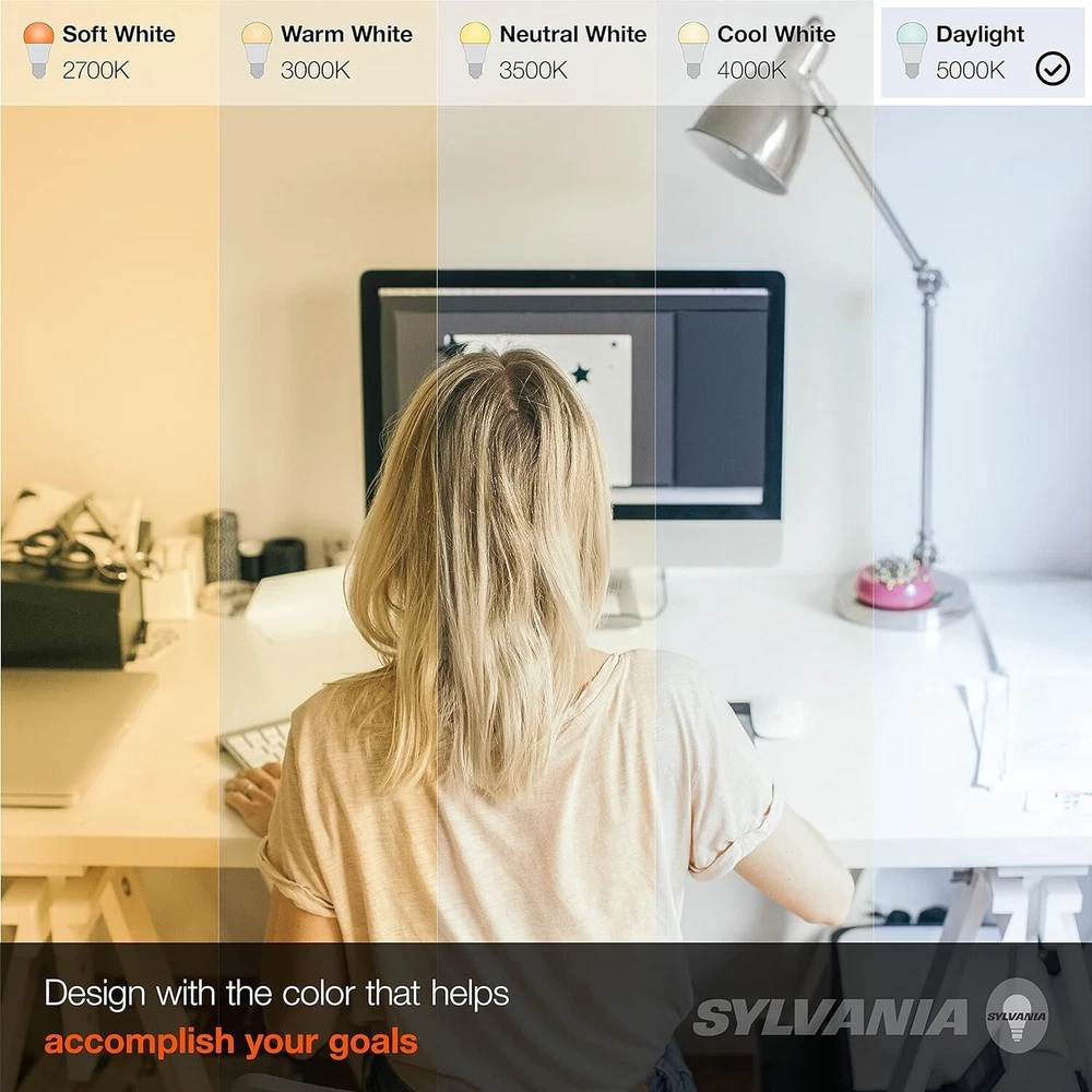 SYLVANIA LED A19 Light Bulb, 40W Equivalent, Efficient 6W, Medium Base, Frosted 5000K Daylight, 12 Pack GREAT VALUE - 12 LED bulbs with 450 lumens of light output at only 6 watts. Replace your old incandescent bulbs for a brighter and more energy-friendly home LONG-LASTING – These bulbs are a great energy-saving for old incandescent bulbs because they have a total lifespan of up to 11,000 hours. You won't need to constantly change your light bulbs anymore ENERGY-SAVING – These LED light bulbs require less energy and can save you up to 85% on your energy bill. Each daylight bulb works as a great for old 40W incandescent bulb NO WARM-UP TIME – These A19 bulbs have no warm-up time. When you flip the switch, it lights up instantly with a full 450 lumens of brightness and a stable daylight color SAFE FOR HOME USE – These non-toxic bulbs are mercury and lead free. They also produce no harmful ultraviolet or infrared radiation Brighten your home with SYLVANIA 6W LED A19 light bulbs! This 12 pack of LED lamps are a great for your 40W incandescent lamps. With just 6 watts, they will brighten your house with 450 lumens of light. Ideal for use in ceiling lights or floor lamps, the SYLVANIA LED bulbs illuminate the house in quality and welcoming light. Additionally, it will help you save up to 85 percent on your energy costs because it requires less energy and lasts longer than incandescent lamps. In fact, it has a lifespan of 11,000 hours. Unlike other light bulbs, SYLVANIA LED lights do not overheat. Our LED lights are UV, IR, and mercury free. You can also safely install them in ceiling light fixtures or floor lamps (not for use in fully enclosed fixtures). With these bulbs, you can be sure that what’s inside your house is safe to use. Keep your home bright and your electricity bill low with the SYLVANIA 6W LED A19 Bulbs; See the clear difference it makes.