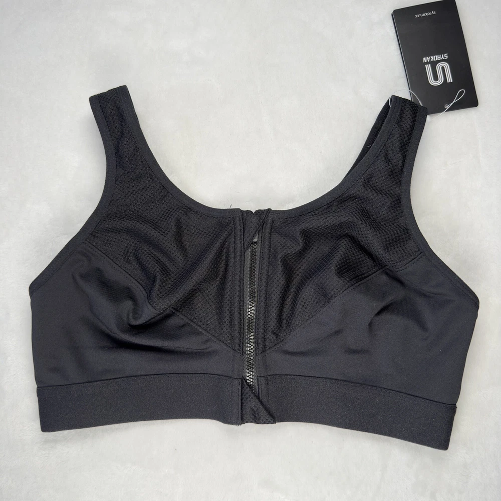 Women's Zip Front Sports Bra, perfect for any performance or activity. This bra features a racerback strap, zip front closure with accent zipper, and high support level for all types of workouts. The bra is made of a blended fabric consisting of 88% polyester and 12% spandex, making it perfect for moisture-wicking during any activewear occasion. The solid black color adds a touch of style to the sports theme of the bra, and the wireless underwire type with cup size A ensures comfort and support for size 34C.