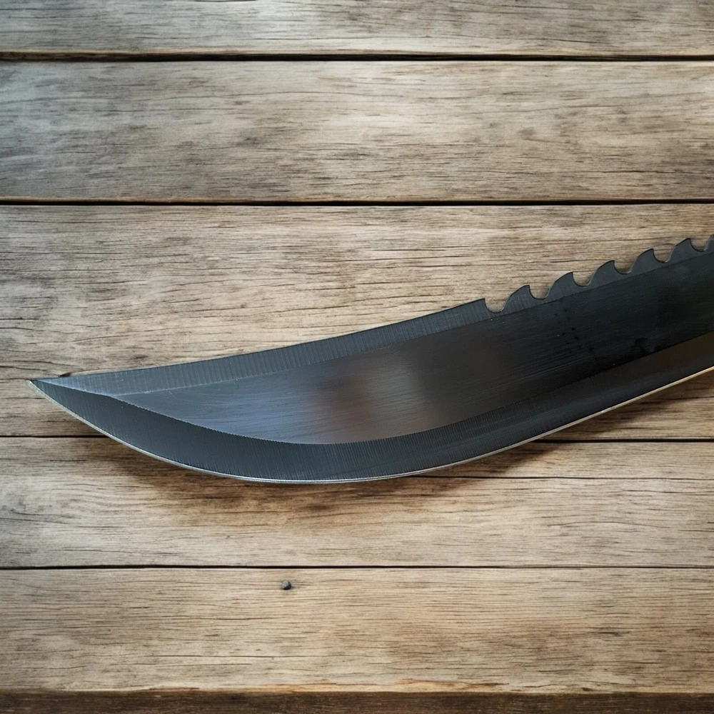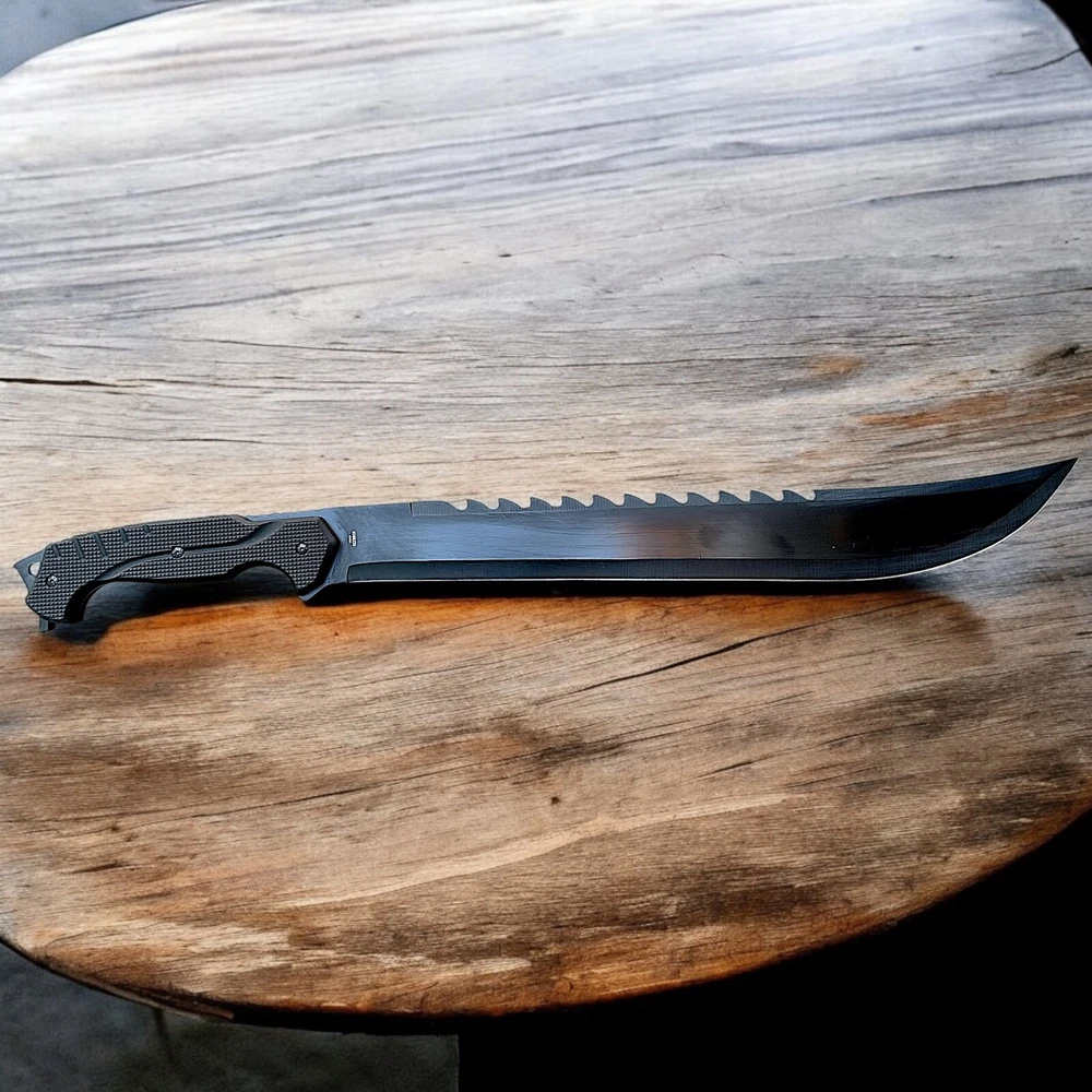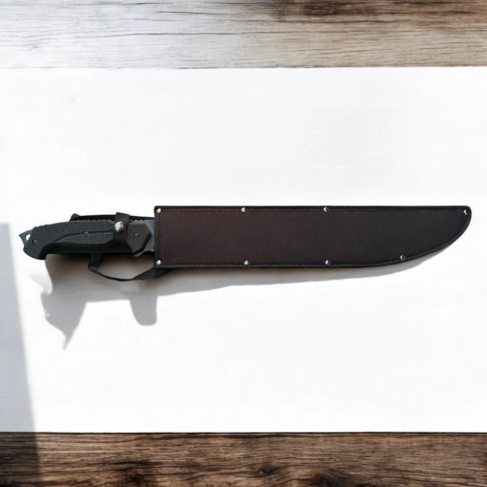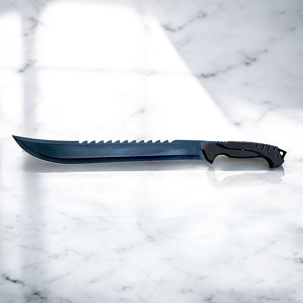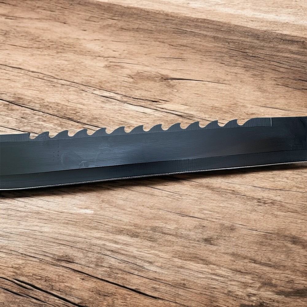 SZCO 25” Black Sawback Machete – Full Tang Survival Knife with Sheath This massive machete means business. With a menacing 25-inch full tang build and aggressive sawback spine, this SZCO survival blade is built for heavy-duty tasks — from field clearing to outdoor survival. A durable blacked-out finish, ergonomic grip, and included sheath make this a must-have for collectors, campers, and tactical users. Features: Total Length: 25 inches Blade Length: 18.25 inches Blade Style: Clip Point with Sawback Spine Blade Finish: Matte Black Handle: Textured Full Grip Polymer Tang: Full Tang Construction Includes: Nylon Tactical Sheath with Belt Loop Brand: SZCO Condition: Brand New Use: Survival | Camping | Hunting | Display | Collection 💥 Why You’ll Love It: Massive and intimidating with real functionality Sawback edge for light sawing/utility cuts Great balance for such a large profile Tactical and collectible — looks great on display Ships fast and secure 📦 What You Get: You will receive the exact machete shown in the photos, along with its fitted sheath. ⚠️ Buyer must be 18+ and follow all local, state, and federal laws regarding blade ownership.