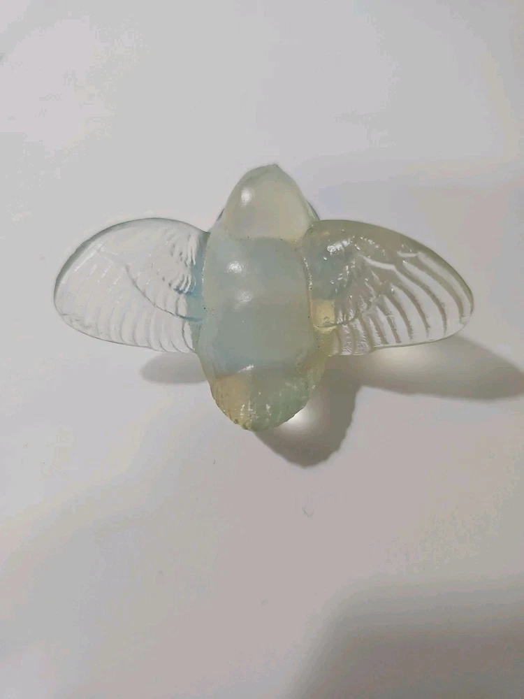 This is a vintage Sabino opalescent glass figurine of a bird, specifically a sparrow, with its wings out as if ready for flight. The piece is clear in color and has a 3D effect, featuring decorative details. It is signed by the artist and was made in France. The figurine showcases the brand's production style of opalescent glass. Good condition no chips