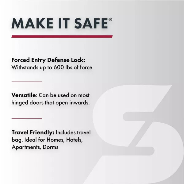 Highlights Personal Protection You Can Trust: SABRE is the #1 pepper spray brand trusted by police & consumers & a leader in the personal safety category Maximum Security: Keep yourself and your belongings safe wherever you go - this TSA-approved portable door lock is compatible with most hinged doors that swing inward Safety on the Go: Lightweight and compact size is perfect for added security while traveling, such as in hotels and shared vacation rentals; Includes travel bag for easy packing Reliable Protection: Metal body construction and rugged design provides durable and sturdy protection so you can have peace of mind and enjoy your travels Easy Installation: No tools or wiring needed for quick installation that can be done in seconds; Requires at least 1/8 of an inch gap between the door and frame Description Add more comfort and relaxation to your vacation with the SABRE Universal Portable Door Lock. This door lock is perfect for adding peace of mind and keeping you and your loved ones safe on your travels, whether it be in a hotel room or shared vacation rental. It works on most hinged doors that swing inward for your convenience. Requires at least 1/8 of an inch gap between the door and frame for use. Featuring a metal body construction, this durable and rugged door lock can help provide reliable protection to your room. The door lock also includes a travel bag for easy carrying and packing. It's easy to install and sets up with minutes - no additional tools or wiring required. The door lock's compact size makes it perfect for traveling and is also a TSA approved lock. This multi-purpose door alarm isn't just a travel essential - it's great to use on your own apartment, home, or dorm room. The Portable Door Lock was developed by SABRE, the #1 pepper spray brand trusted by police and consumers worldwide.