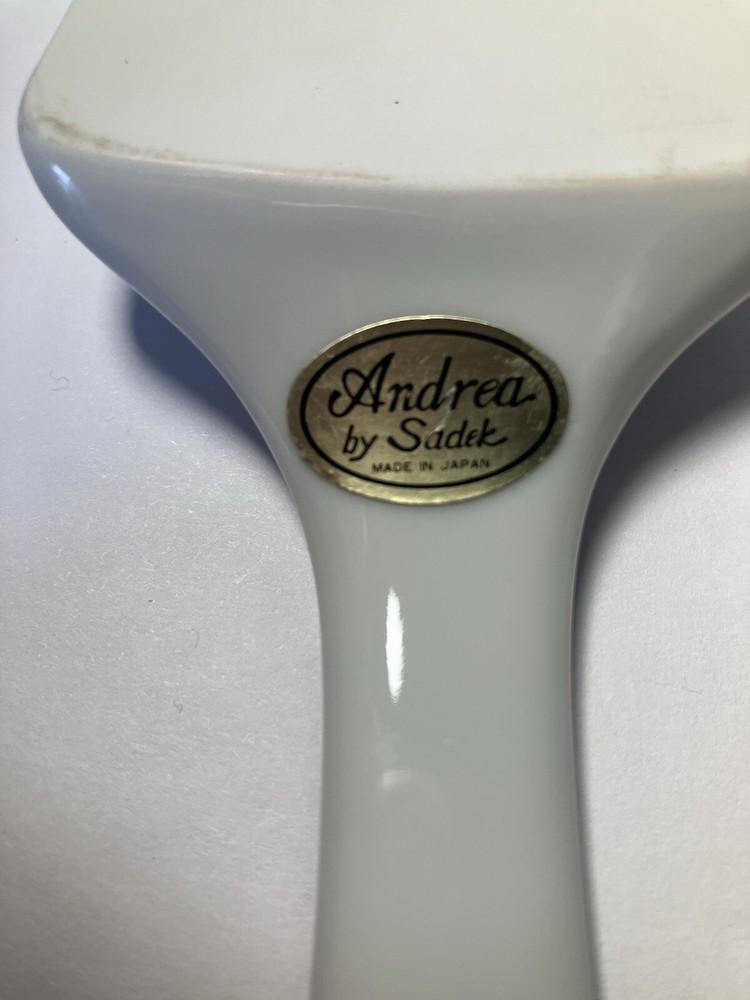 This beautiful cake plate and server set from Andrea by Sadek is a must-have for any occasion. The intricate blue rose porcelain finish adds a touch of elegance to any dessert table. Measuring 11 inches in width, this round serving piece is perfect for all occasions, whether it's a wedding or a casual get-together. Crafted in Japan in 1999, this vintage set is part of the Andrea by Sadek product line and features a floral theme of roses. The backstamp is printed and the production technique is unknown. This set includes two items and is perfect for adults. Add a touch of sophistication to your dessert presentation with this stunning cake plate and server set.