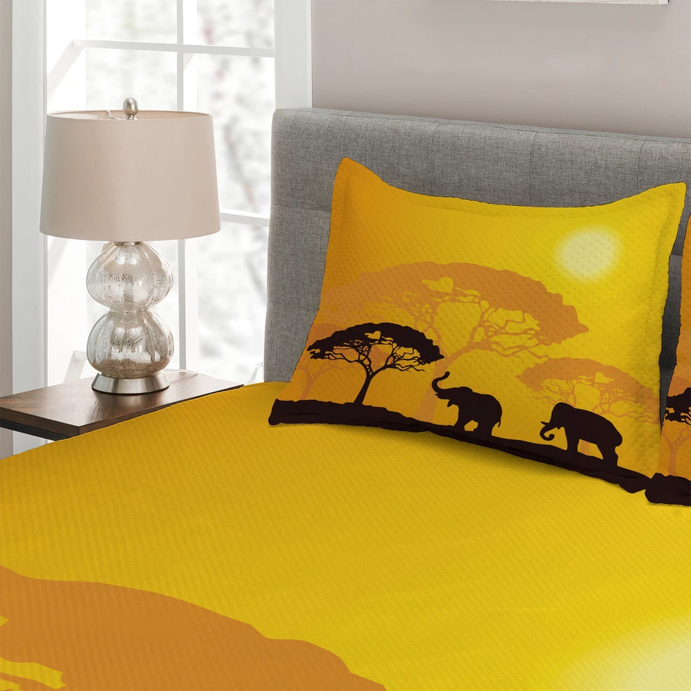 Safari Quilted Coverlet Set King Size Africa Abstract Wildlife with 2 Shams Quilted Bedspread set with pillow shams included. SQUARE pattern quilted design with digital print. KING SIZE SET: 1 King Size Bedspread (104" W X 88" L) and 2 Pillow Shams (36" W X 20" L). QUEEN SIZE SET: 1 Queen Size Bedspread (88" W X 88" L) and 2 Pillow Shams (30" W X 20" L). TWIN SIZE SET: 1 Twin Bedspread (68" X 88") + 1 Pillow Sham (30" X 20"). OVERSIZED and HEAVY WEIGHT so great coverage along the sides of bed and won't fall off easily. MADE FROM: Double brushed high density soft spun polyester for optimal softness & ultimate comfort. Excellent stitching & workmanship. A luxurious product for homes, dorm rooms, hotels, guest rooms. It's a modern alternative of the traditional classic. Practical to use for being polyester, feels like cotton. Can also be used as a blanket. Coverlet set is made from very durable and sustainable material which is SUPER SOFT & BREATHABLE. Will not endanger your health or environment. Only ECO FRIENDLY inks used. No chemicals used, No dye substance harming the health of you or your family. Colors won't fade thanks to new digital printing methods. Also a great gift idea. You can find a design for everybody and every interest. Customized, personalized products are very popular. As manufacturers of digital printed home textiles, we follow current trends and bring you the latest home fashion. The digital images we display have the most accurate color possible, however due to differences in computer monitors, we cannot be responsible for variations in color between the actual product and your screen. Due to manual measurement, please kindly allow 1-2 cm discrepancy. CARE INSTRUCTIONS: Machine wash with cold water; Do not bleach. Tumble dry on low heat. Iron on low/medium heat. The Bedspread & Pillow Shams are printed on the FRONT SIDE ONLY, the back of them are plain white colored. Comforter is NOT INCLUDED in the set.