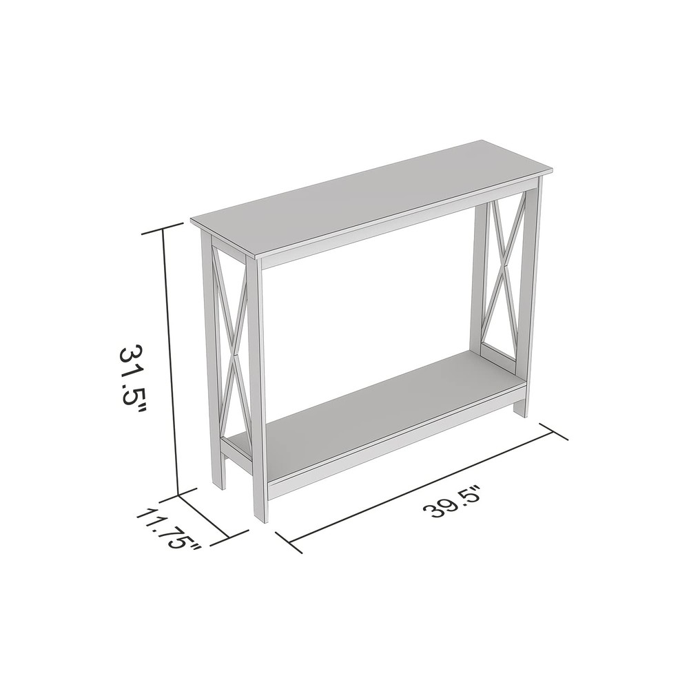 Item Dimensions : 39.5L x 12W x 31.5H inches. Material : Engineered Wood. Assembly required POPULAR FRAME: The X frame on the side structures on both sides to enhance the whole stability, and it has a great visual impact. STORAGE: The long narrow and two-layer shelf ensure sufficient storage function, provides additional storage space for books, toys or crafts. Comtemporary design, gives a clean and elegant feel to your living area. Can be used as: sofa table, entryway table, accent table, Entry table, console tables for entryway, couch table, hallway table, tall table, wall table, long table, console table with drawers, hall table, console table with storage, entrance table, tables for Living room, narrow table, Entry tables for hallways, behind the couch table, entryway decor, entryway Furniture, skinny sofa table, entryway table. Easy to assemble: 4 step assembly. Spacious top and sturdy structure. Solid Durable: It uses thicker MDF and steel, 2 layers play a good stabilizing effect. Adjustable knob height to maintain balance. Easy Assembly: The design concept of fewer parts makes our console desk easier to assemble. Wide Application : The useful console can be used as a sofa side table, entryway table, display rack or kitchen pub table.