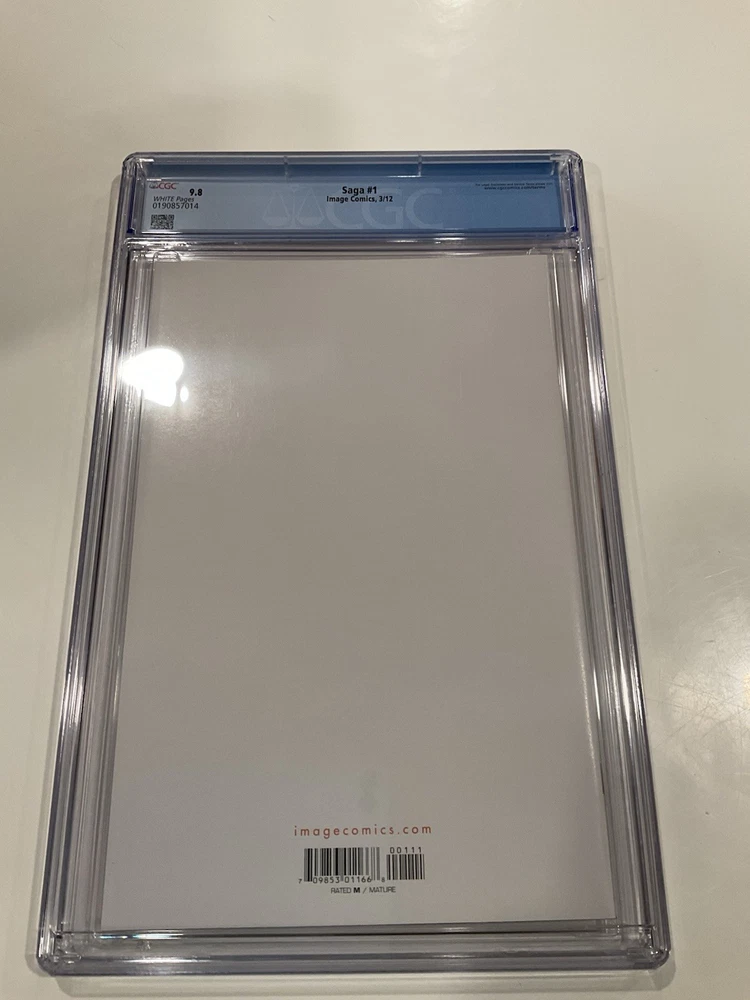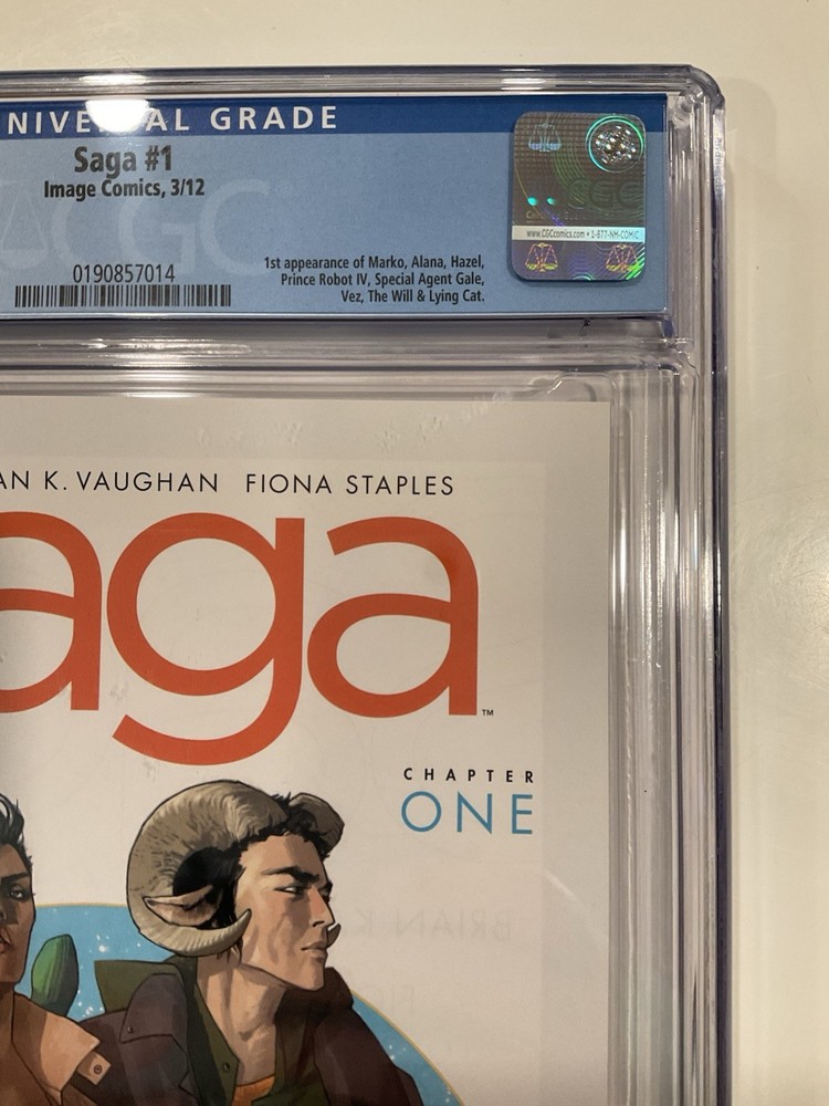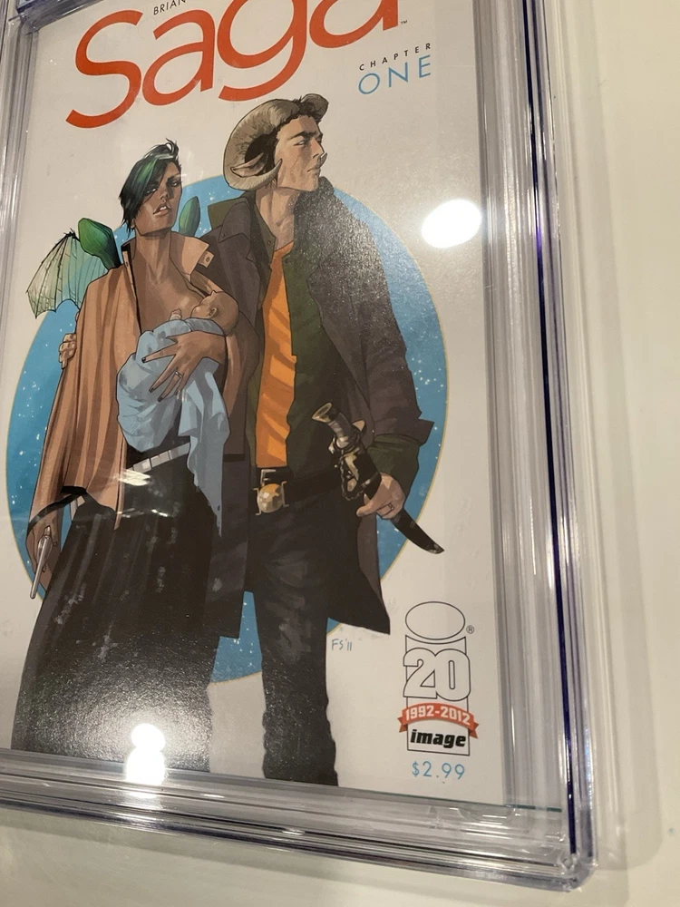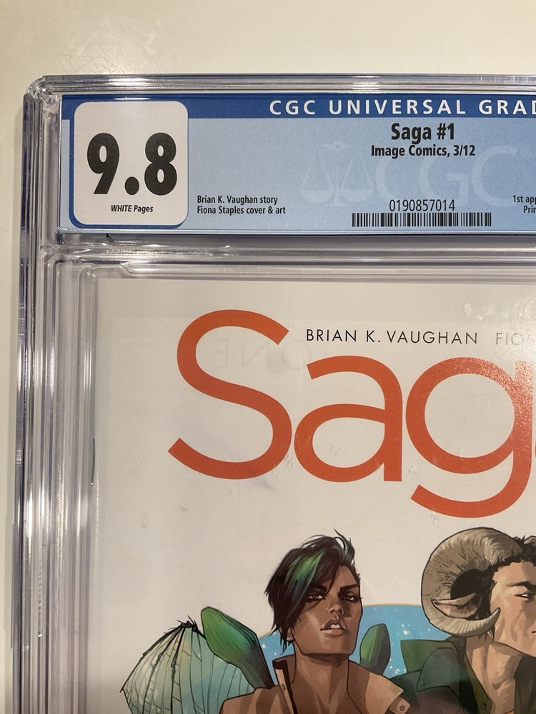 The product is a highly collectible first print CGC 9.8 graded Image Comics key first appearance of the series "Saga" by Fiona Staples and Brian K Vaughan. This comic book, published in 2012, features the characters Marko and Alana in the modern age era of US Comics. The certification from Certified Guaranty Company (CGC) adds value to this sought-after item for comic book enthusiasts and collectors alike.