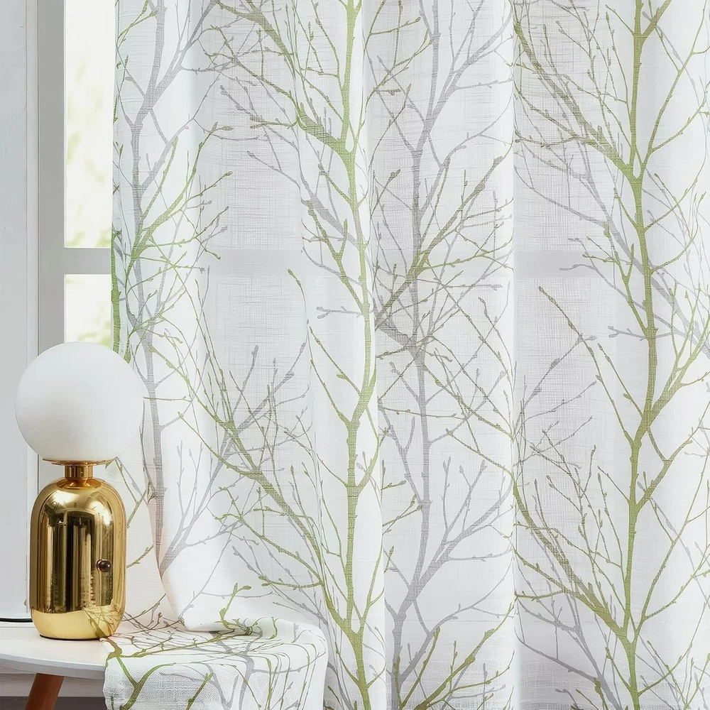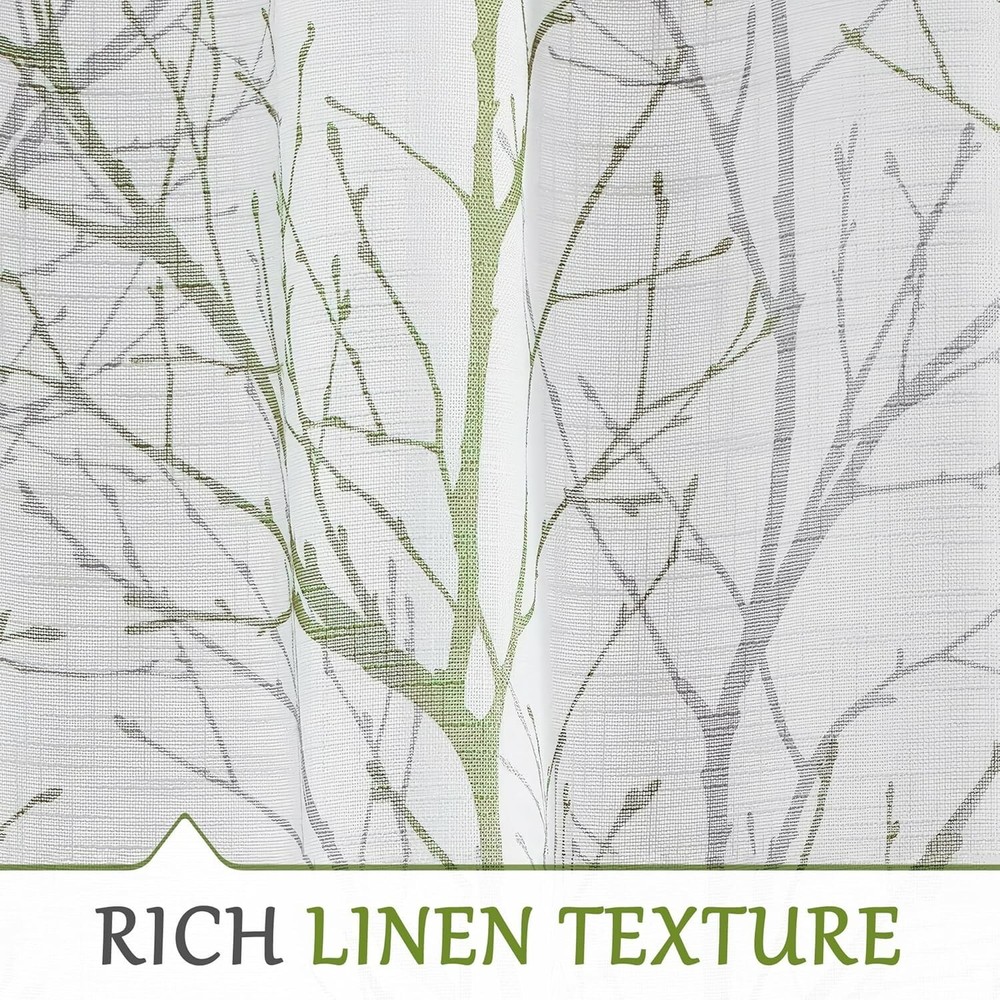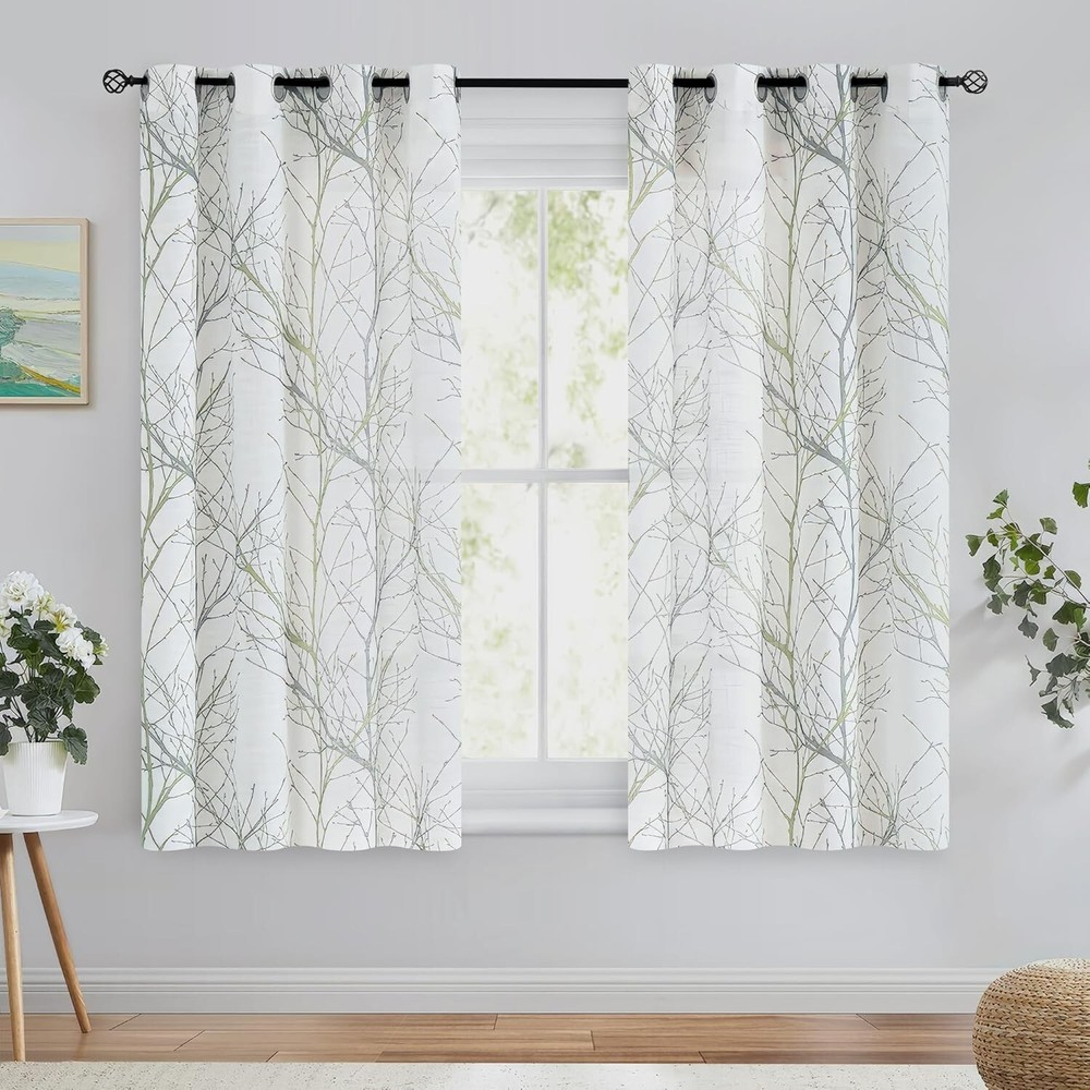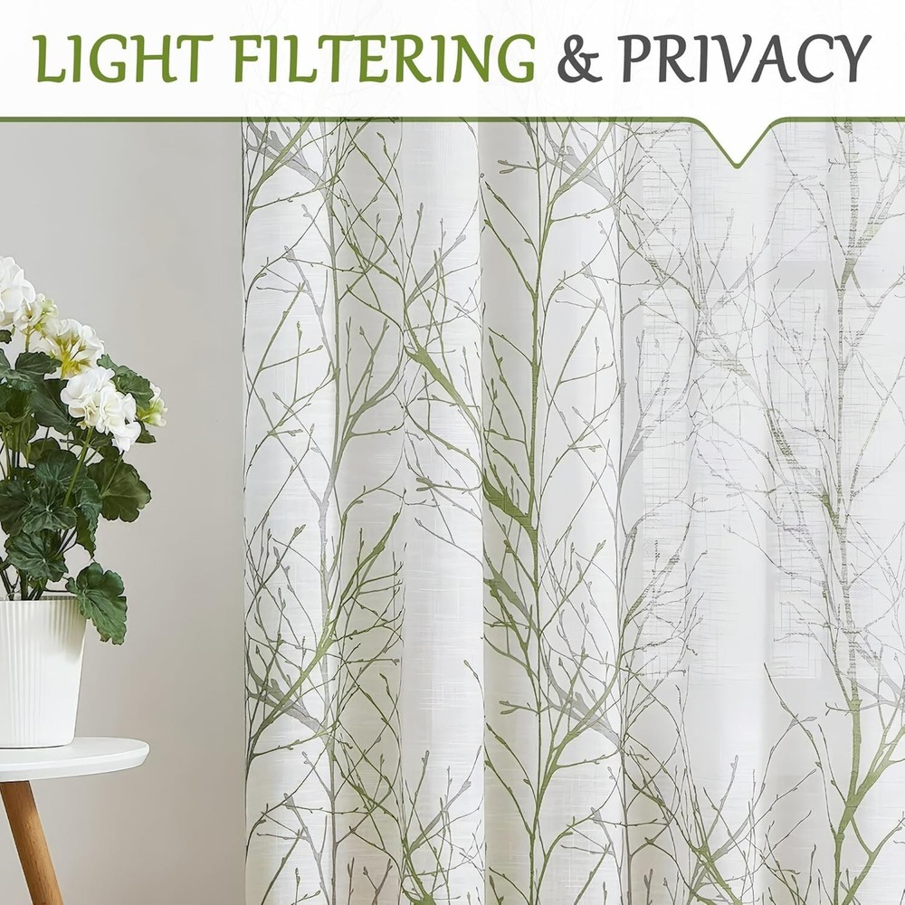 Linen Semi Sheer Curtains for Bedroom, Sage Green White Curtains 54 Inches Long for Living Room, Grey Tree Branch Print Curtain Light Filtering Kitchen Window Drapes, Grommet Top 2 Panels Ready Made Curtains: Sold in pair, 50" w x 54" /panel, 100" w x 54" /pair, Green grey branch on white curtains. Recommend ordering 2 to 3 times rod width for proper look and fullness Naturas Inspired Pattern: Green and grey tree branch print on white background open weave linen Semi Sheer inspires a modern aesthetic twist with the bold and dramatic natural painting pattern Light Filtering & Privacy: Featuring a lovely tree branch design, these curtains strike a perfect balance between functionality and aesthetics. They provide sufficient privacy while allowing ample light to enter, keeping the indoors bright and airy Grommet Top Curtains: 8 silver grey grommets fit any standard or decorative curtain rods up to " in diameter. Easy and convenient to hang. These printing window curtains are perfect for living room, bedroom, kitchen, porch Easy Care: The curtains offer great durability. Machine washable in cold water. Tumble dry low. Quick iron or steam clean at low temperature settings. Feel free to contact me for any product problem, we will certainly respond within 12 hours