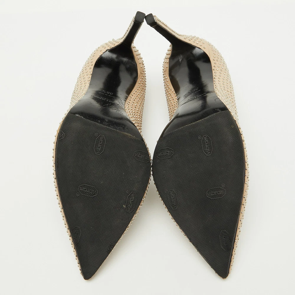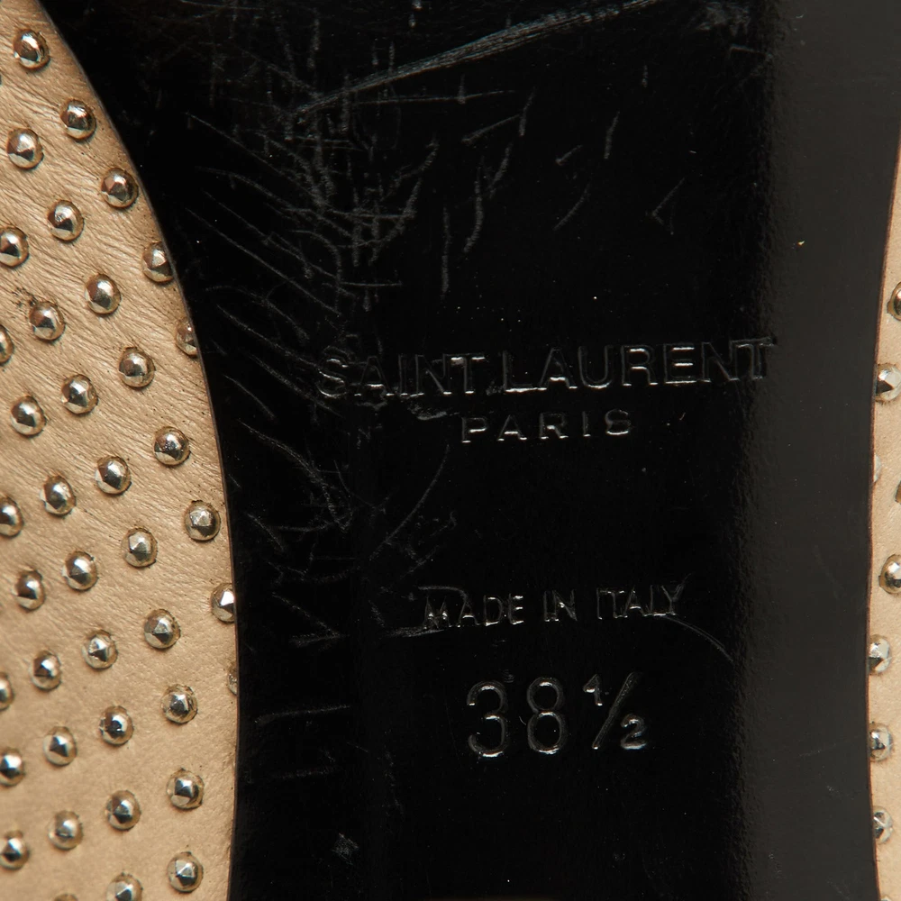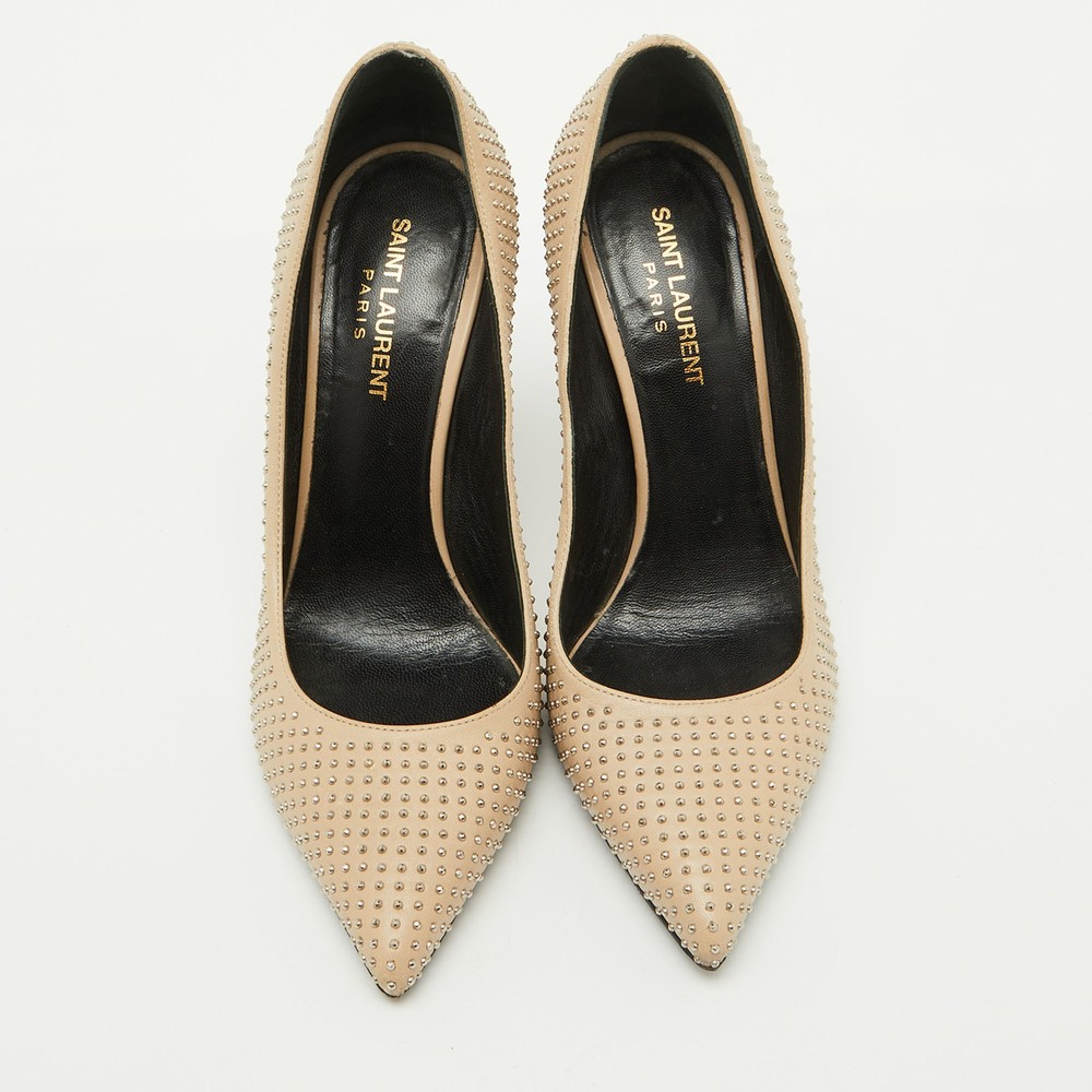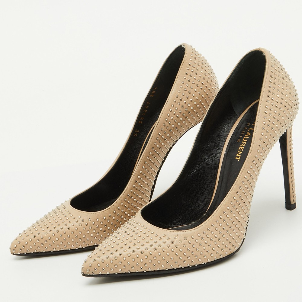 A blend of edgy and elegant, these Saint Laurent pumps are crafted from smooth beige leather with striking studded details on the heels. The pointed toe and sharp silhouette add a modern, sophisticated touch.Certified by The Luxury Closet - This item has gone through a detailed authentication process overseen by our experts. We offer a lifetime guarantee of authenticity on all our items. Import duties, taxes and charges are not included in the item price. These charges are the buyers responsibility. Please check with your country’s customs office to determine what these additional cost will be prior to buying. Our eBay Store About Us Contact Us Add to Favorite Sellers Saint Laurent Beige Leather Studded Pointed Toe Pumps Size 38.5 $283.8 A blend of edgy and elegant, these Saint Laurent pumps are crafted from smooth beige leather with striking studded details on the heels. The pointed toe and sharp silhouette add a modern, sophisticated touch. Product Details Brand Color Beige Dimensions Material Leather Size 38.5 Outsole Width 8 cm Outsole Length 25 cm Heel Height 11 cm Includes The Luxury Closet Packaging Certified by The Luxury Closet This item has gone through a detailed authentication process overseen by our experts. We offer a lifetime guarantee of authenticity on all our items. How We Check The in-house team of experts at The Luxury Closet is highly trained to verify the authenticity and the condition of the luxury products. They ensure that only 100% authentic items are put on sale.The evaluation process is unique with its own mix of assessment criteria and differs according to the category. Each item is evaluated based on the following combination of hallmarks, hardware, stitching, symmetry, material, craftsmanship, stamping, codes, hologram stickers, and packaging. Our authenticators also check if the items have been modified or amended (e.g., aftermarket diamonds, replaced batteries, repaired bags, etc.) International Buyers Import duties, taxes and charges are not included in the item price. These charges are the buyers responsibility. Please check with your country’s customs office to determine what these additional cost will be prior to buying.
