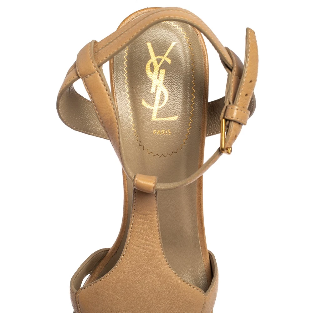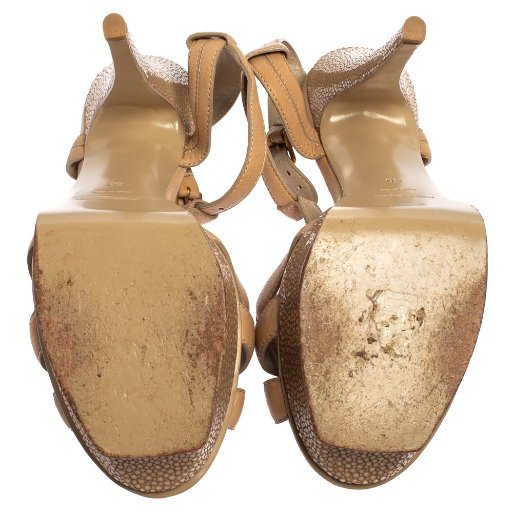 Saint Laurent Beige Leather Textured Platform Ankle Strap Sandals