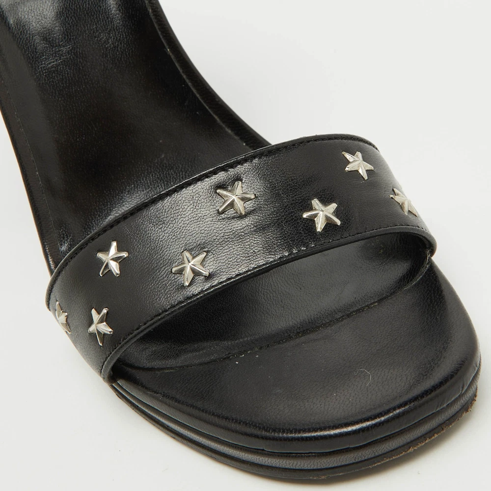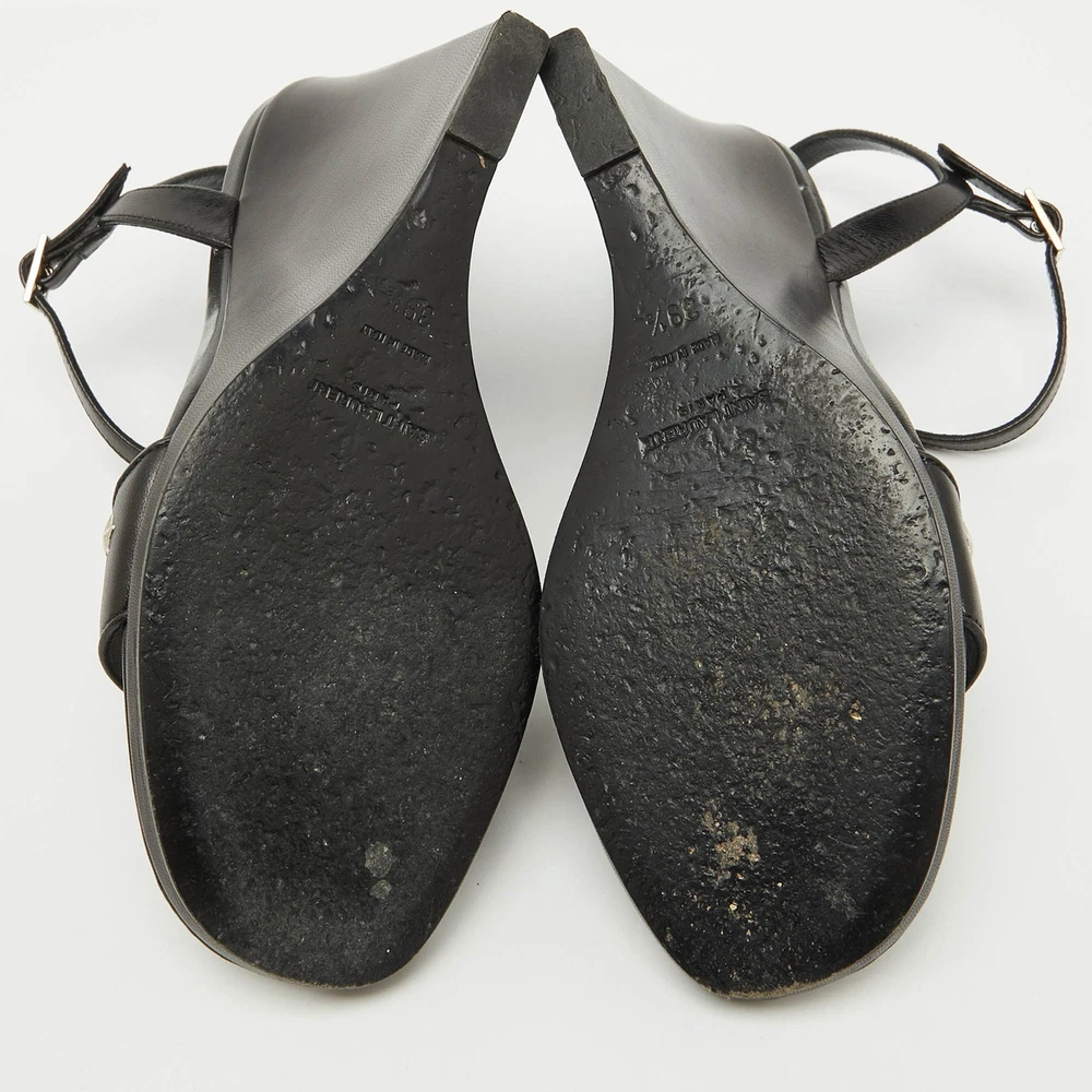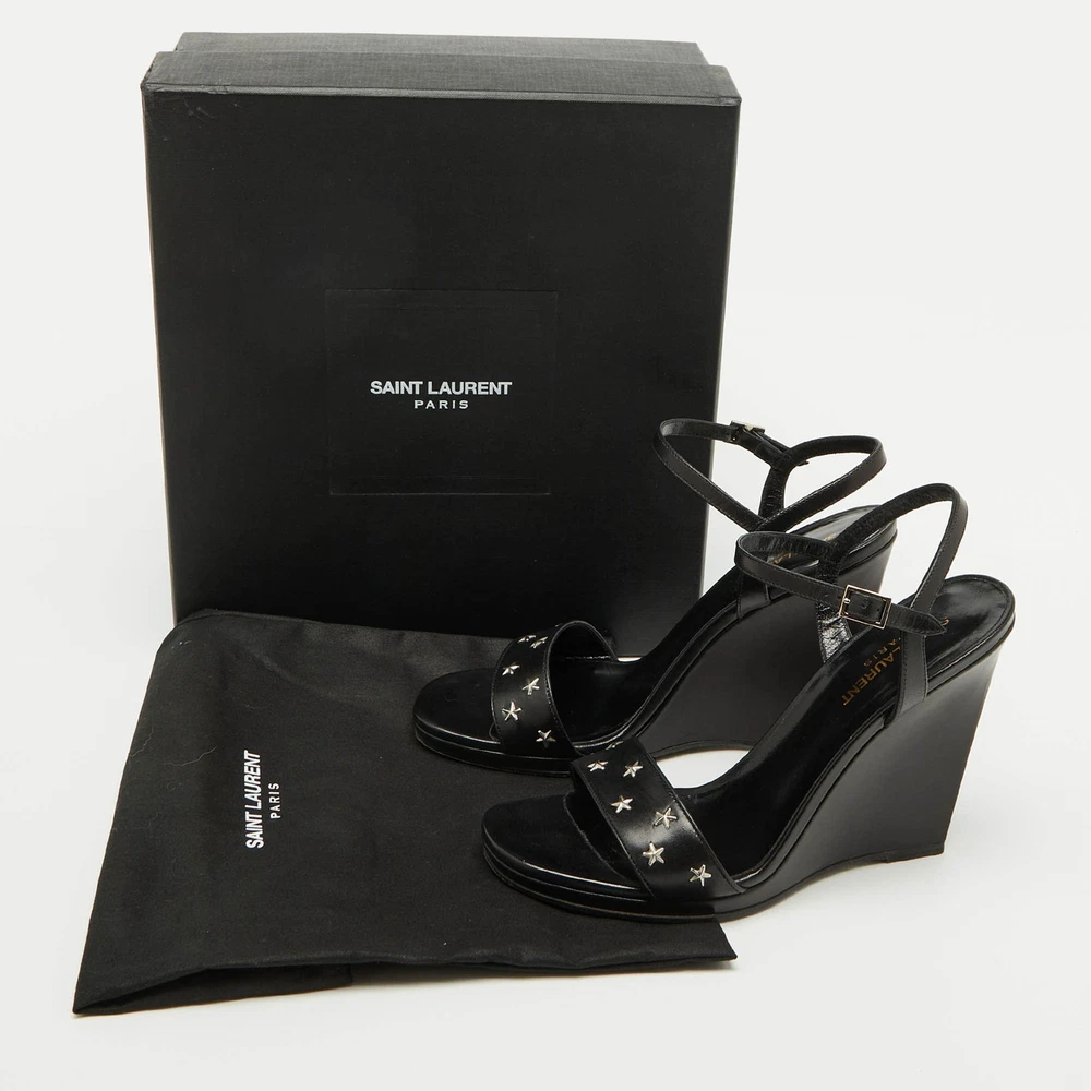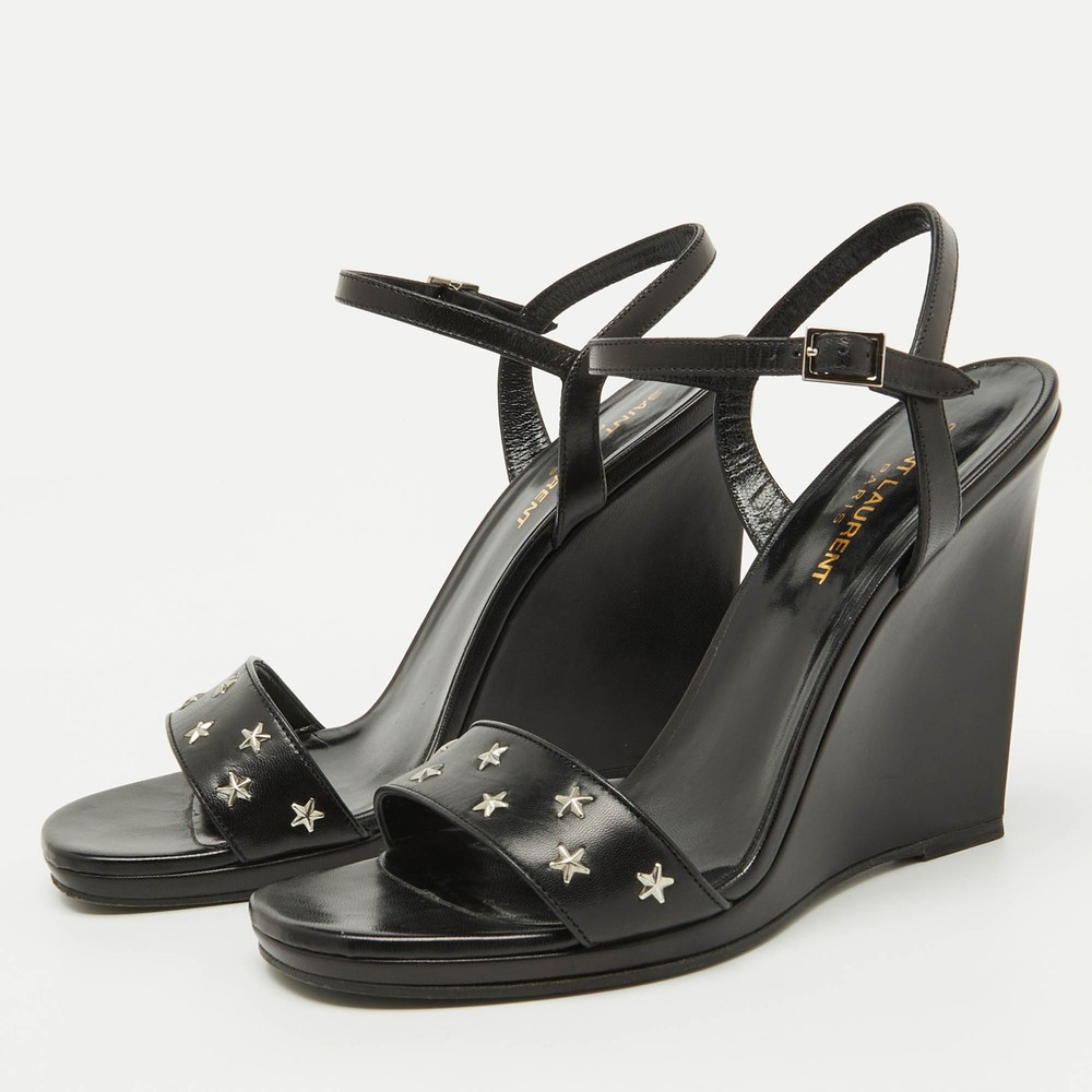 The sandals to invest in this season are these. Meticulously crafted, these exquisite heels combine luxury and comfort, creating a statement pair thats both fashionable and fabulous for every occasion.Certified by The Luxury Closet - This item has gone through a detailed authentication process overseen by our experts. We offer a lifetime guarantee of authenticity on all our items. Import duties, taxes and charges are not included in the item price. These charges are the buyers responsibility. Please check with your country’s customs office to determine what these additional cost will be prior to buying. Our eBay Store About Us Contact Us Add to Favorite Sellers Saint Laurent Black Stars Leather Ankle Strap Wedge Sandals Size 39.5 $220 The sandals to invest in this season are these. Meticulously crafted, these exquisite heels combine luxury and comfort, creating a statement pair thats both fashionable and fabulous for every occasion. Product Details Brand Color Black Dimensions Material Leather Size 39.5 Outsole Width 7.5 cm Outsole Length 20.5 cm Heel Height 11 cm Includes Original Dustbag, Original Box Certified by The Luxury Closet This item has gone through a detailed authentication process overseen by our experts. We offer a lifetime guarantee of authenticity on all our items. How We Check The in-house team of experts at The Luxury Closet is highly trained to verify the authenticity and the condition of the luxury products. They ensure that only 100% authentic items are put on sale.The evaluation process is unique with its own mix of assessment criteria and differs according to the category. Each item is evaluated based on the following combination of hallmarks, hardware, stitching, symmetry, material, craftsmanship, stamping, codes, hologram stickers, and packaging. Our authenticators also check if the items have been modified or amended (e.g., aftermarket diamonds, replaced batteries, repaired bags, etc.) International Buyers Import duties, taxes and charges are not included in the item price. These charges are the buyers responsibility. Please check with your country’s customs office to determine what these additional cost will be prior to buying.