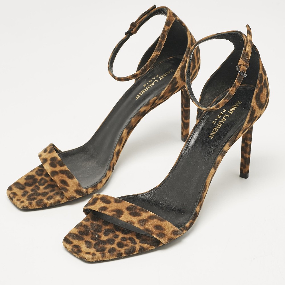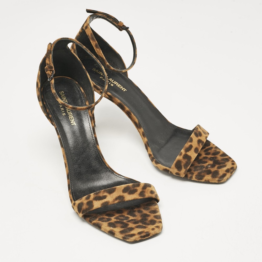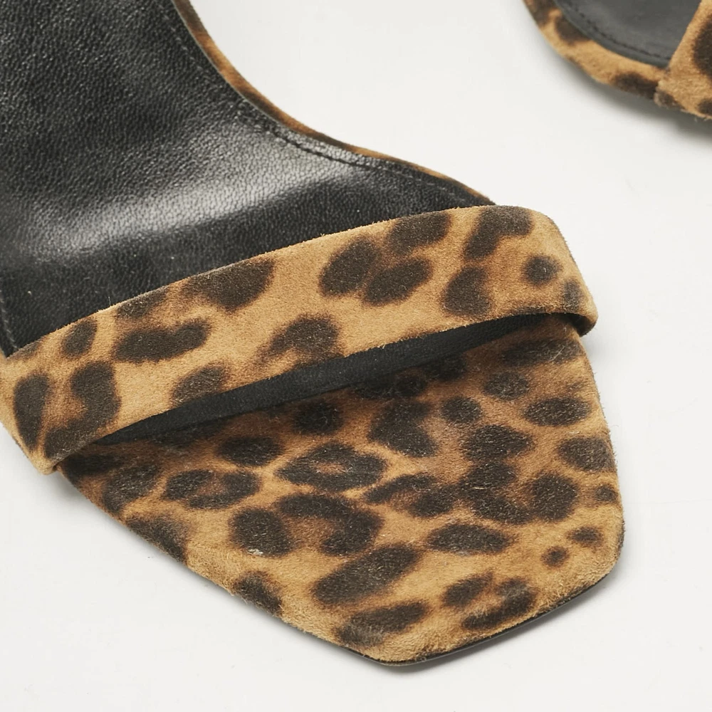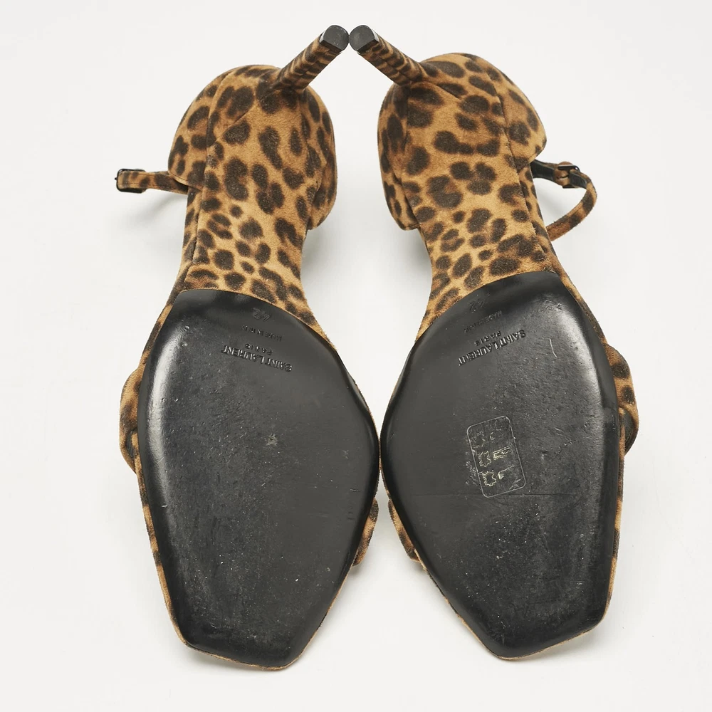 Saint Laurent Brown Leopard Print Suede Ankle Strap Sandals Size 42 EU